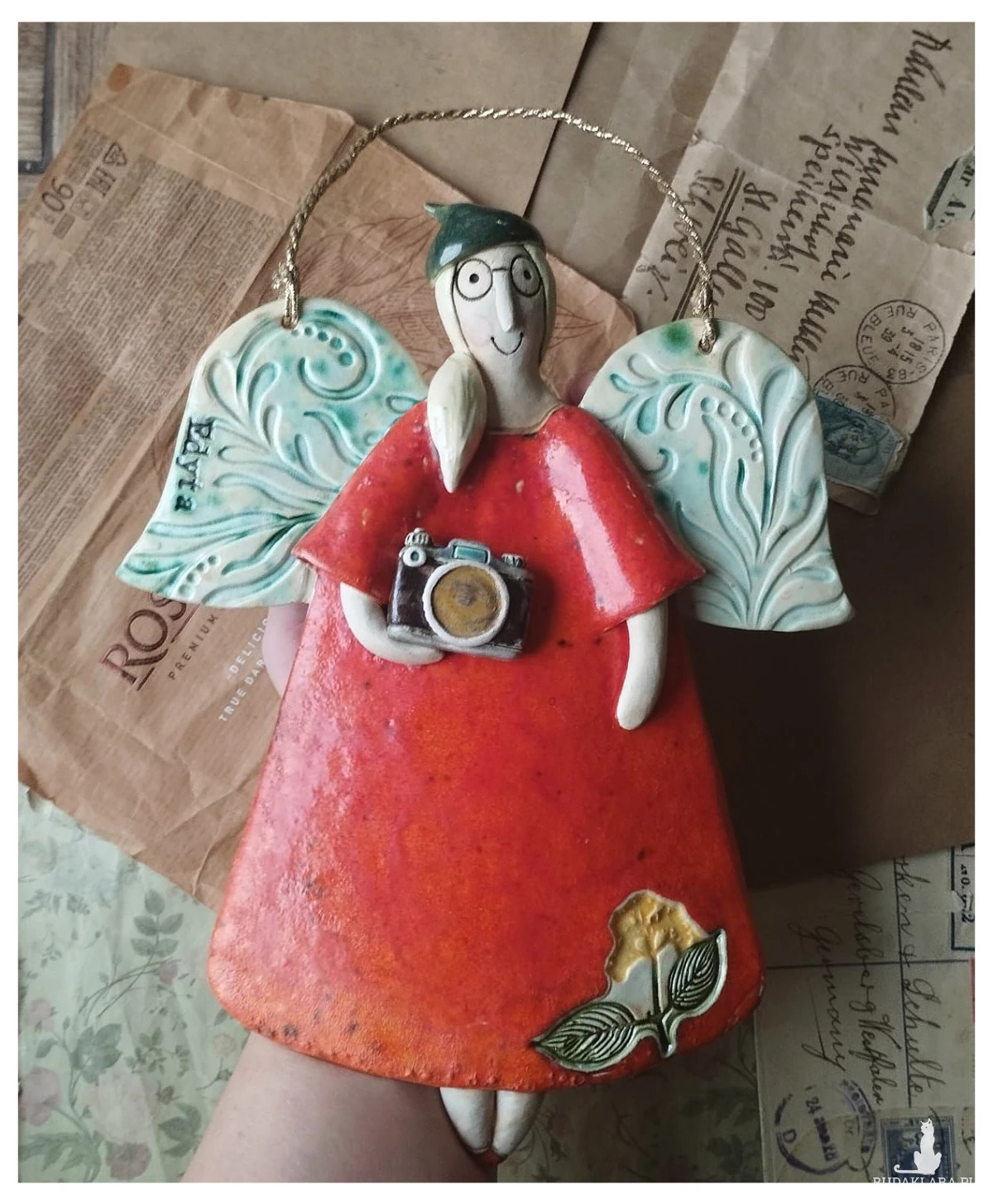Uroczy aniołek ceramiczny wykonany z gliny szamotowej, wypalony na biskwit, a następnie szkliwiony w temperaturze 1260 stopni C. Wymiary ok 27 cm x 22 cm. Do powieszenia na ścianie na ozdobnym sznureczku. Idealny jako prezent okolicznościowy lub do ozdoby domu. Polecam serdecznie wszystkim miłośnikom fotografii.