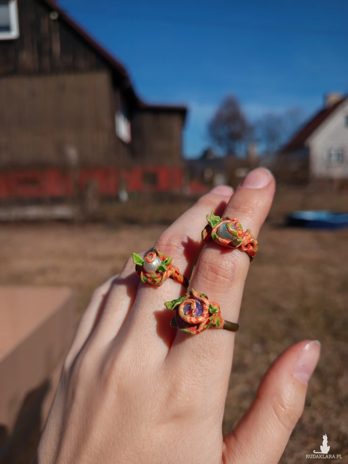 Leśne pierścionki z kamieniami, osadzone na mosiężnym pierścieniu