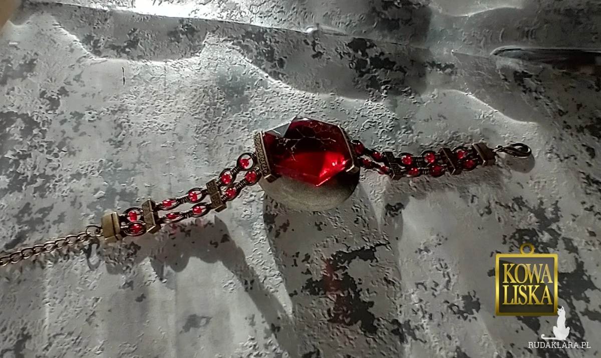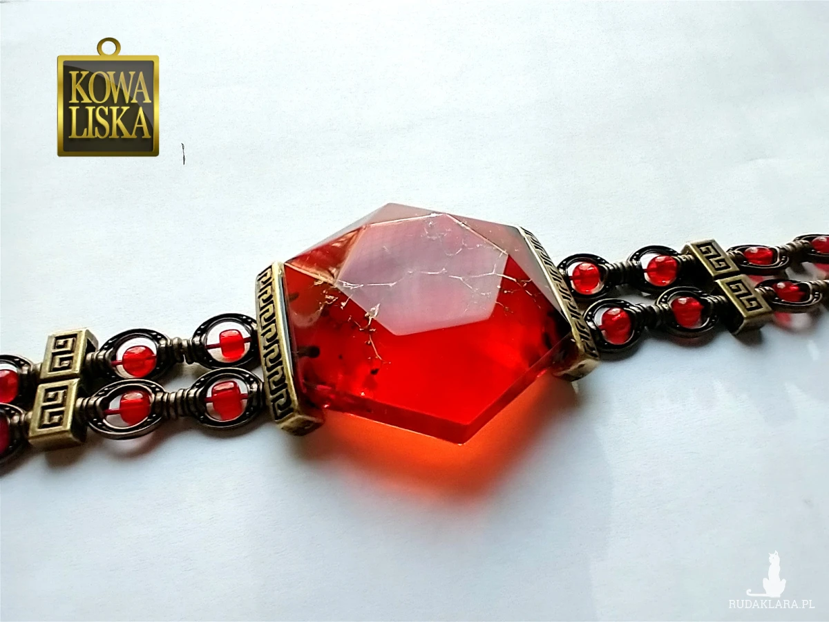 Zjawiskowa, szklista bransoleta z głównym elementem z żywicy w kształcie pryzmatycznego sześciokąta. Zatopiona wewnątrz pojedyncza, złota gałązka, nadaje szlachetności i ciekawego wyglądu.