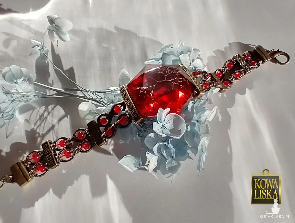 Przekładki, szklane koraliki i oprawy z elementów z akrylu i metalu w kolorach starego brązu z greckim motywem, pięknie podkreślają antyczny charakter bransolety.