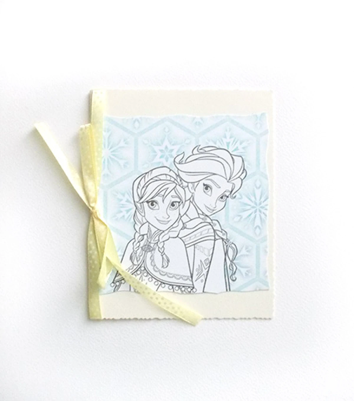 Otwierana kartka okolicznościowa z bajki "Krainy Lodu" (Frozen), gruby kartonik. Karnet jest bez życzeń. Dołączona biała koperta.