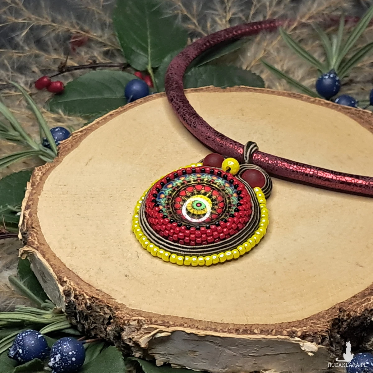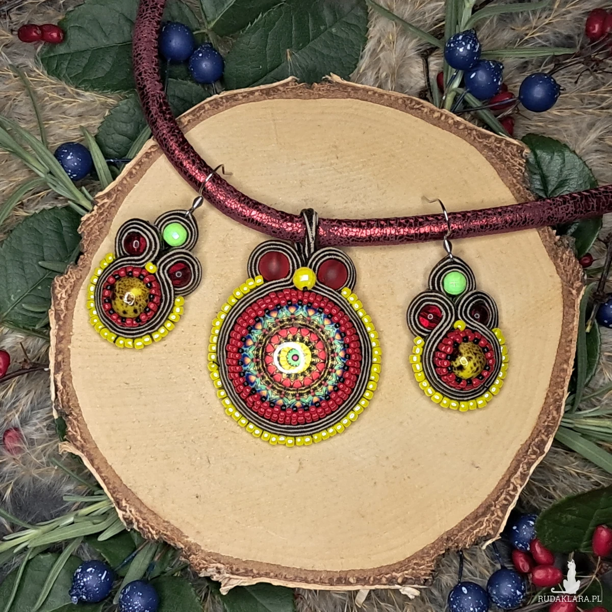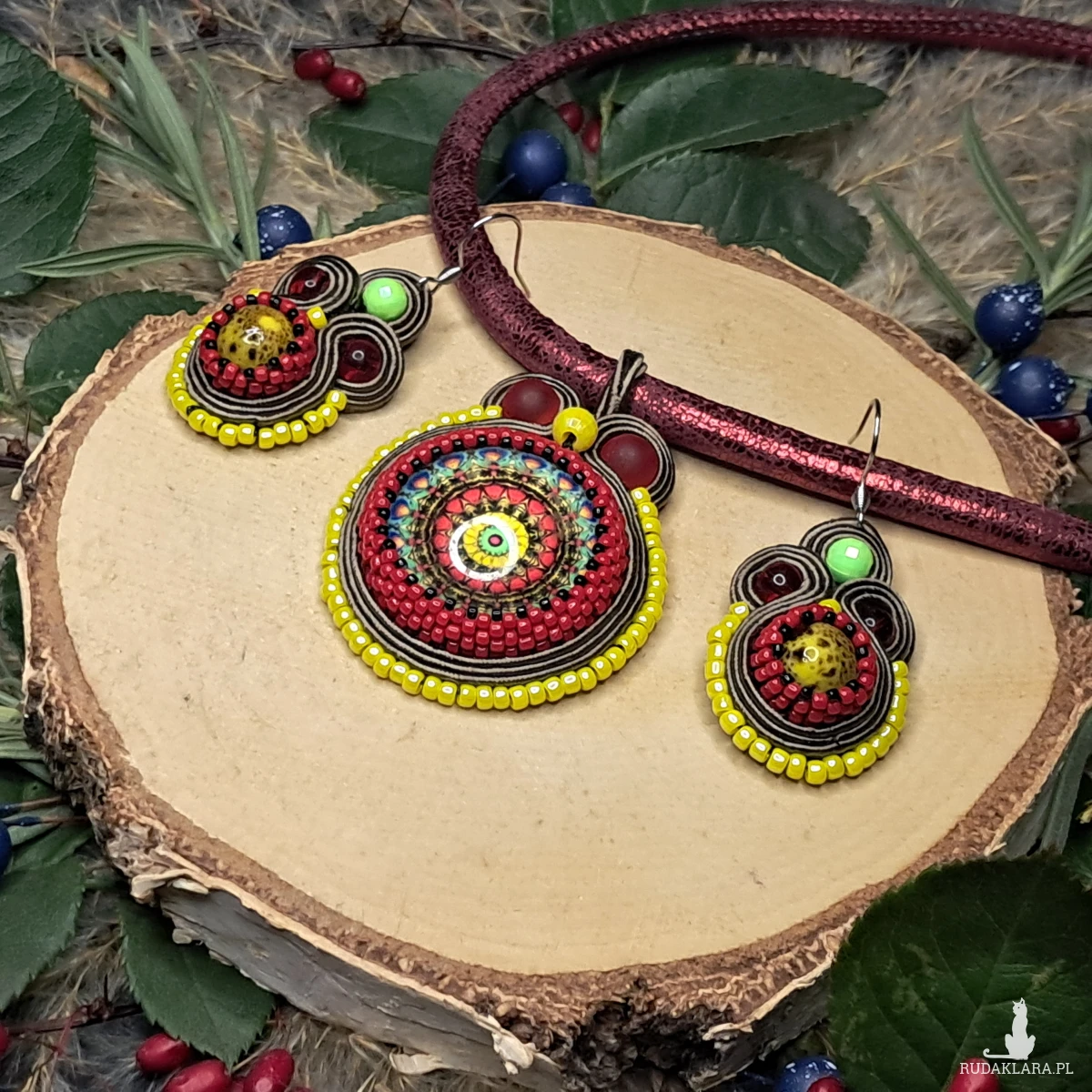 Centralnym elementem wisiorka jest kalejdoskopowy kaboszon a kolczyków ceramiczne koraliki,