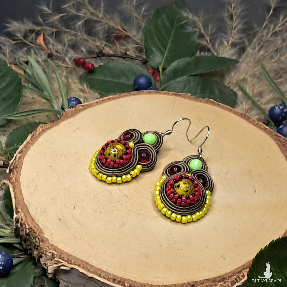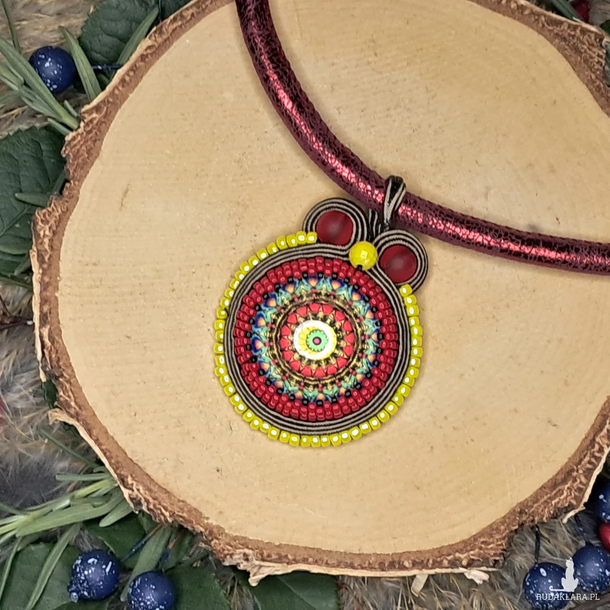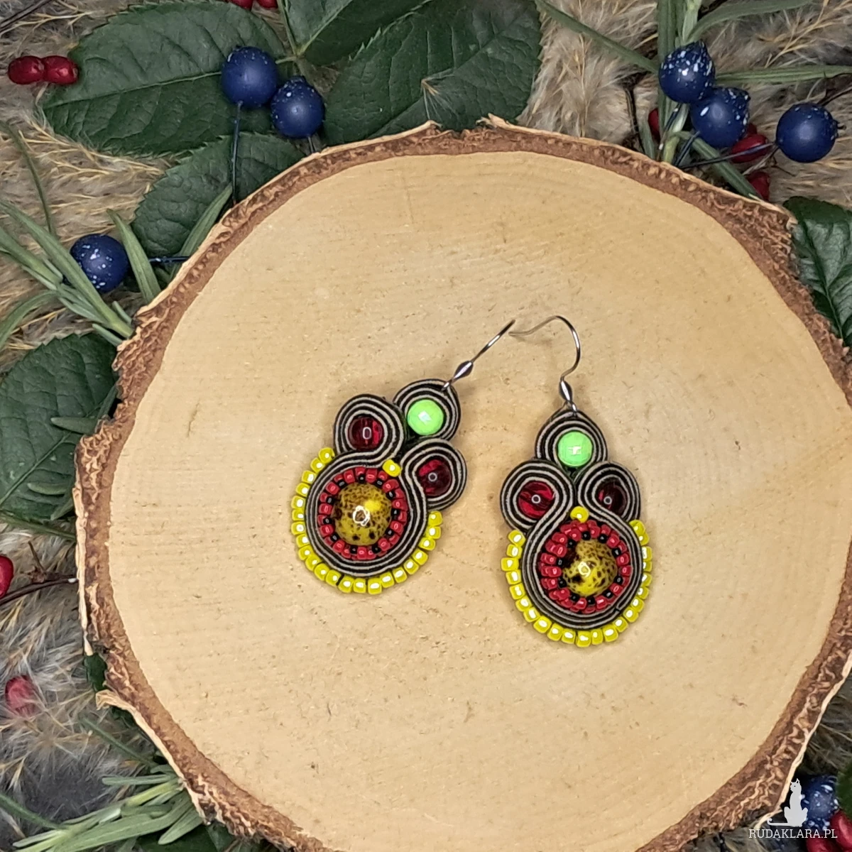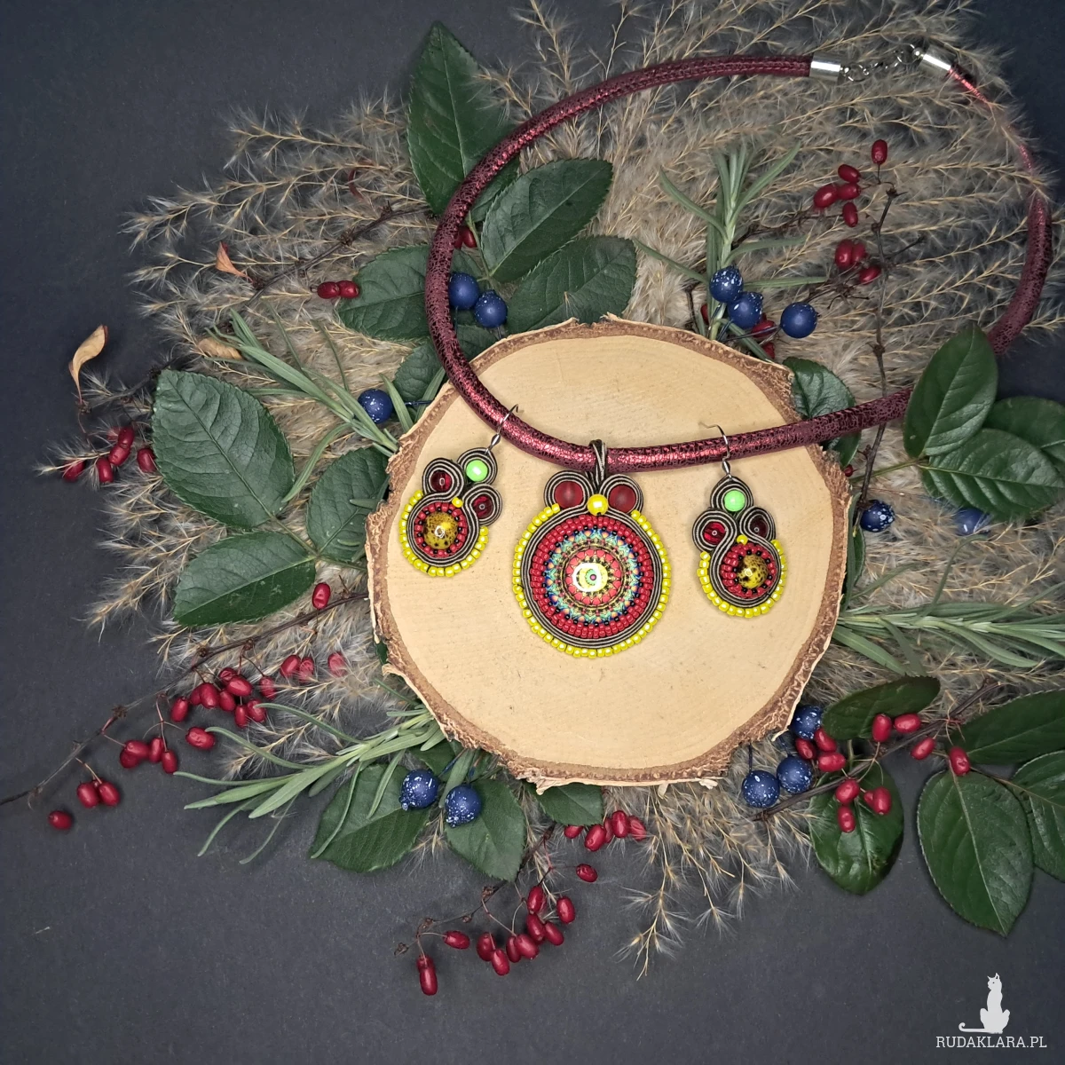 Centralnym elementem wisiorka jest kalejdoskopowy kaboszon a kolczyków ceramiczne koraliki,
