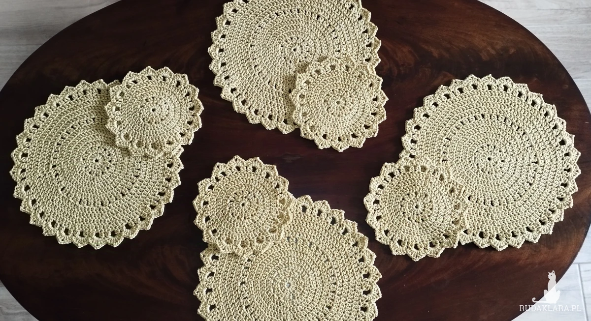 Złote podkładki ze sznurka poliestrowego, duże średnica 30 cm, małe 17 cm. Komplet to 4 duże i 4 małe podkładki, dostępne od ręki.
