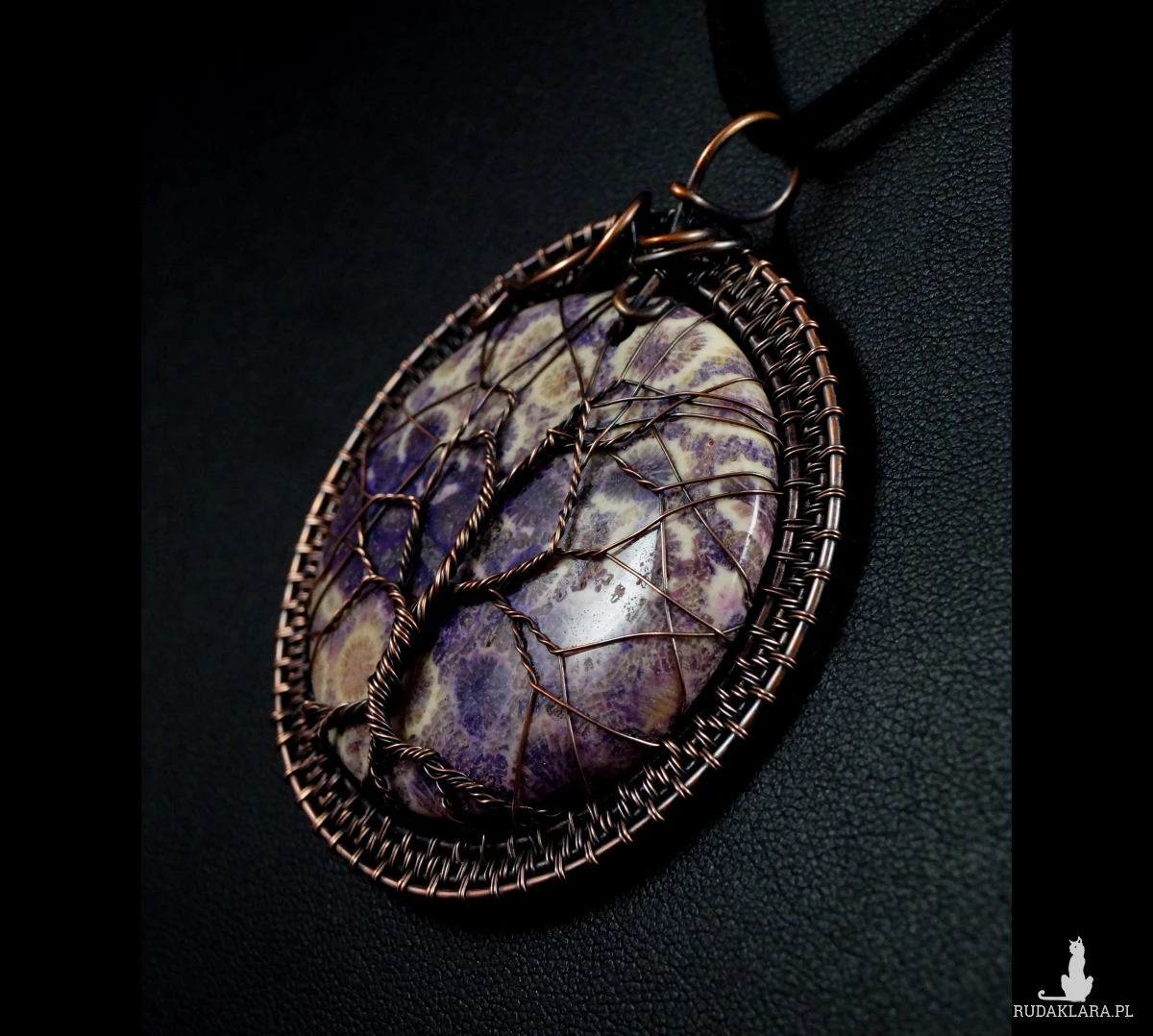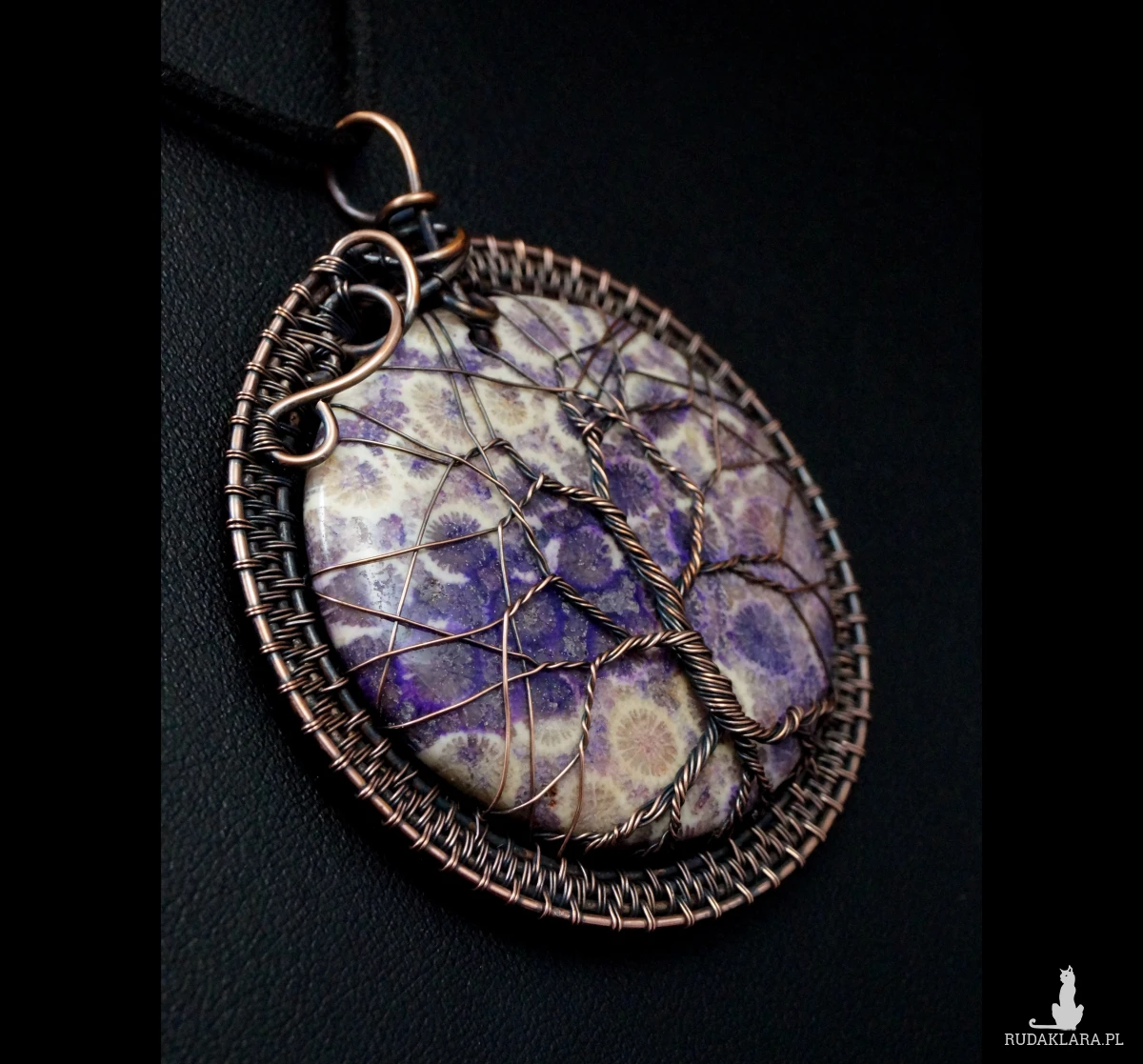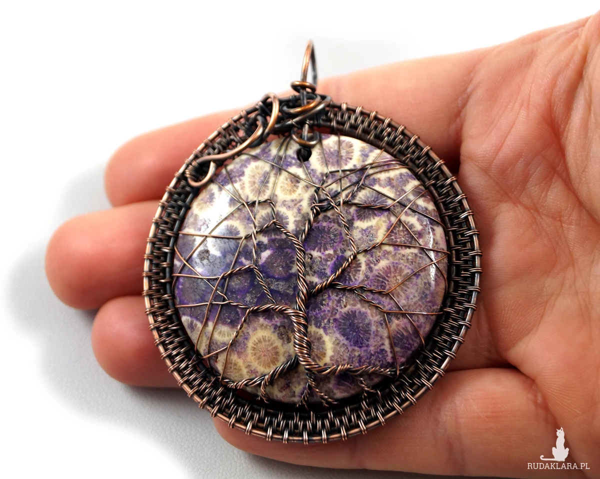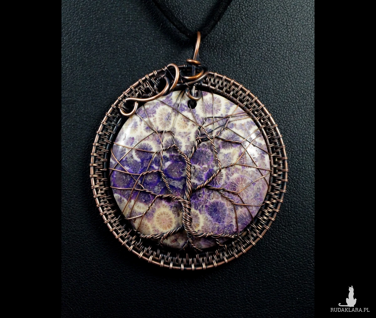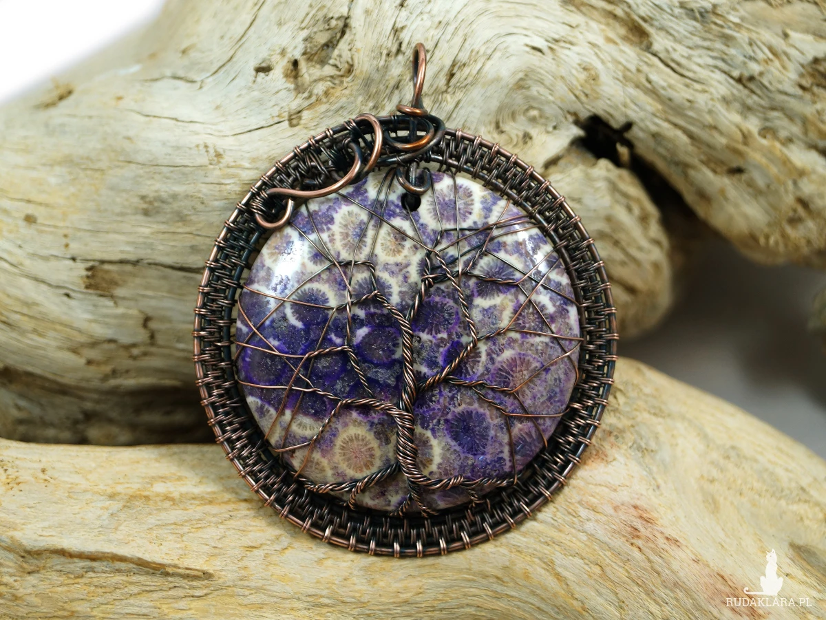 Bajeczny, misternie pleciony wisior z beżowo fioletową skamieliną koralu drzewko szczęścia.