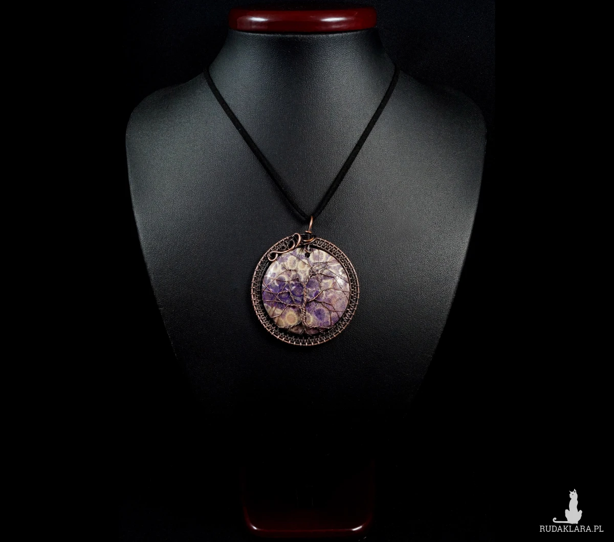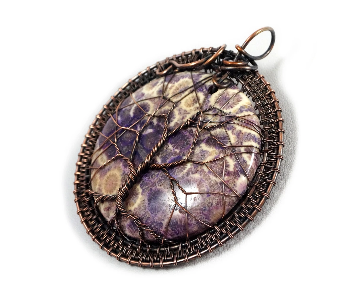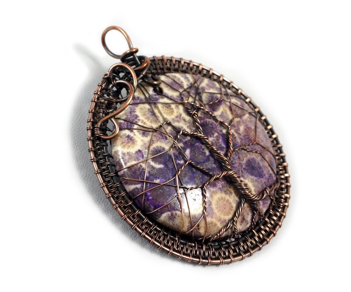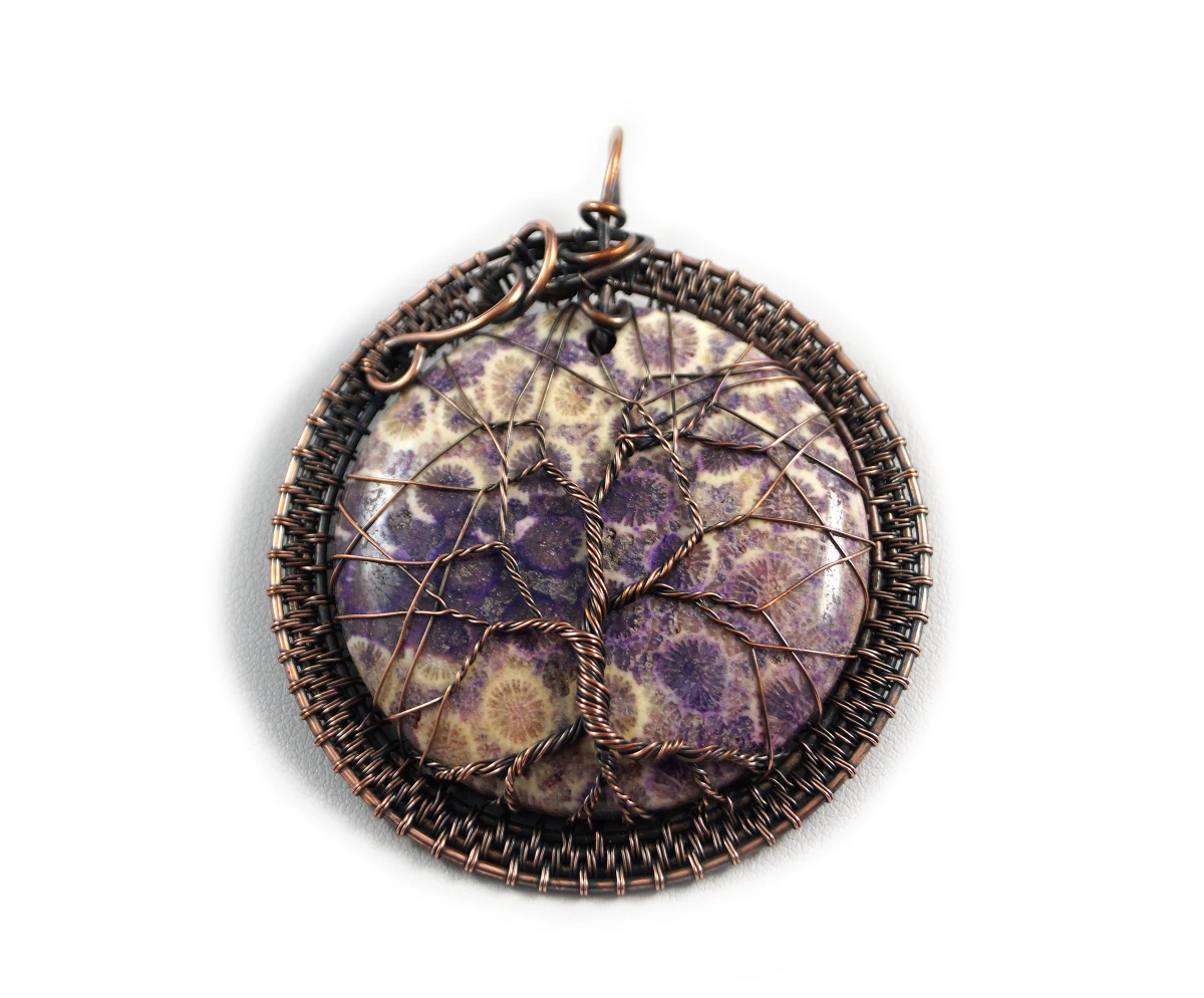 Bajeczny, misternie pleciony wisior z beżowo fioletową skamieliną koralu drzewko szczęścia.