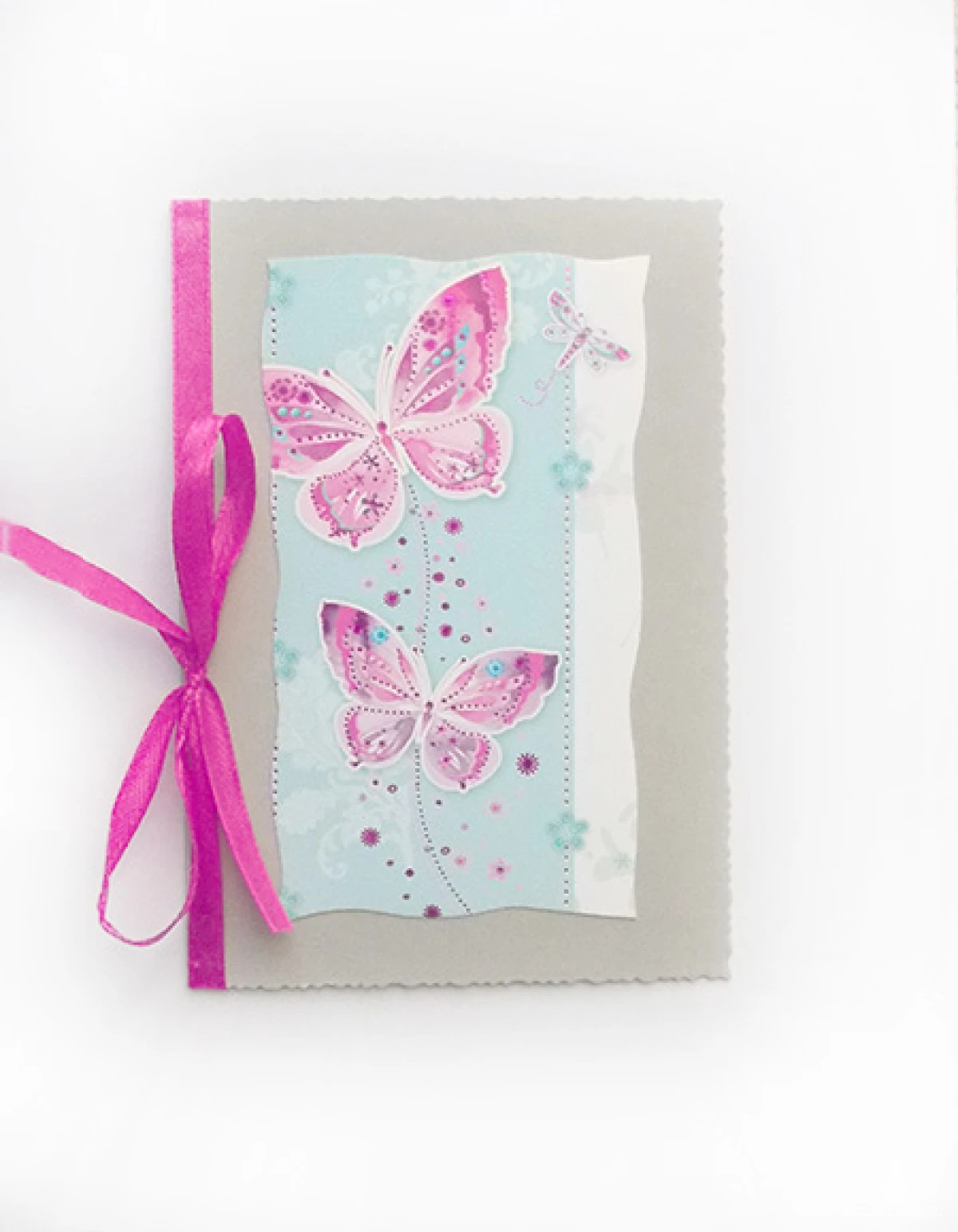 Otwierana, pastelowa kartka na dowolną okazję, karnet jest bez życzeń, gruby kartonik. Dołączona biała koperta.