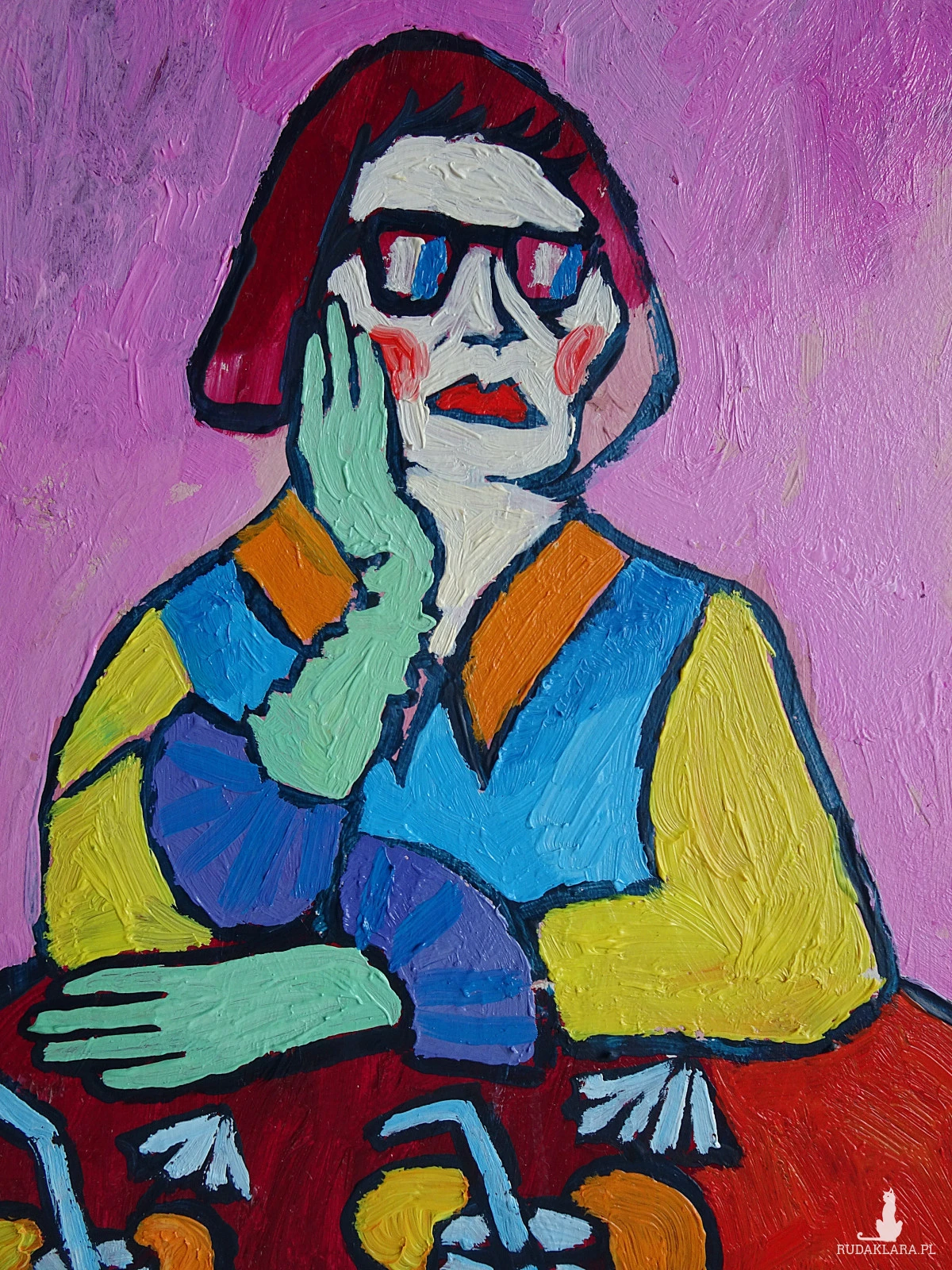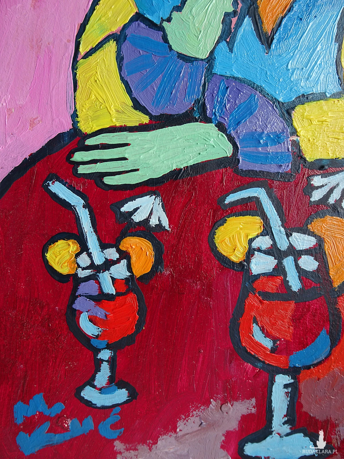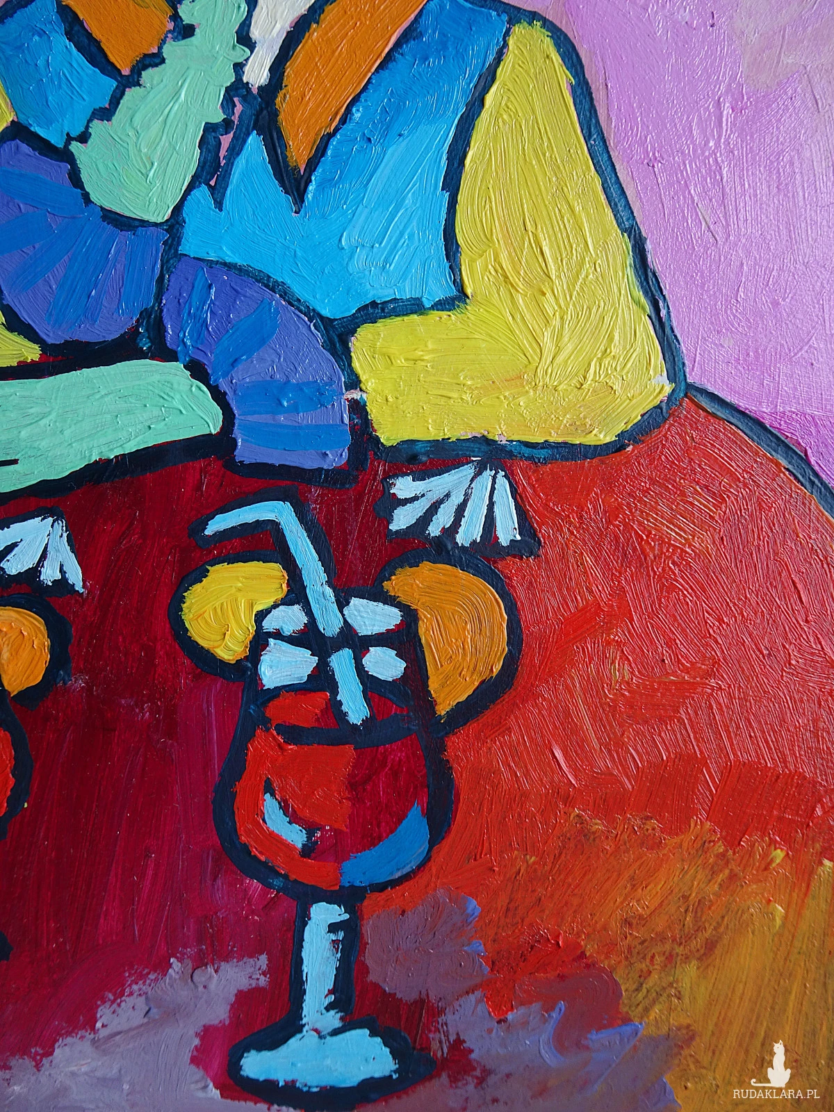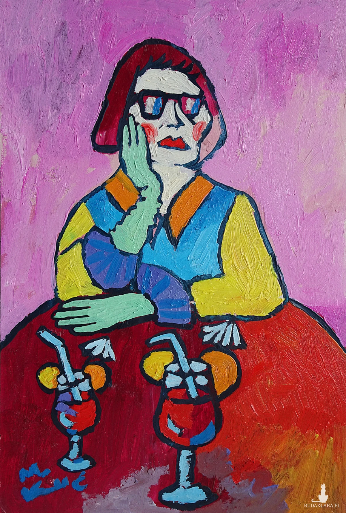obraz ręcznie malowany portret babcia z drinkiem
