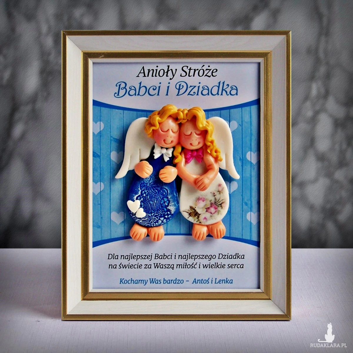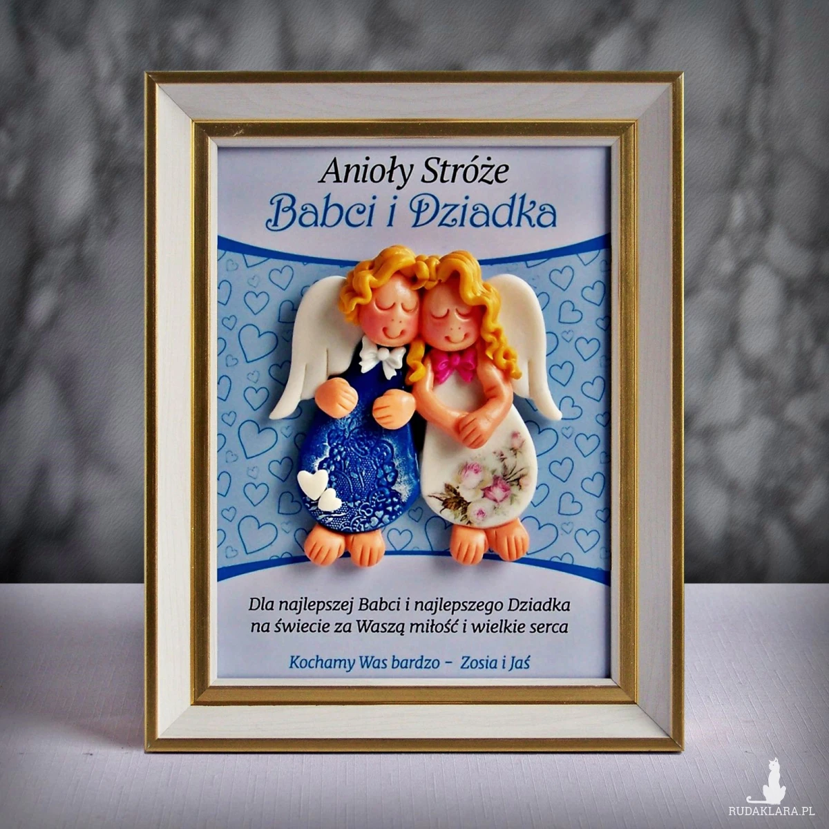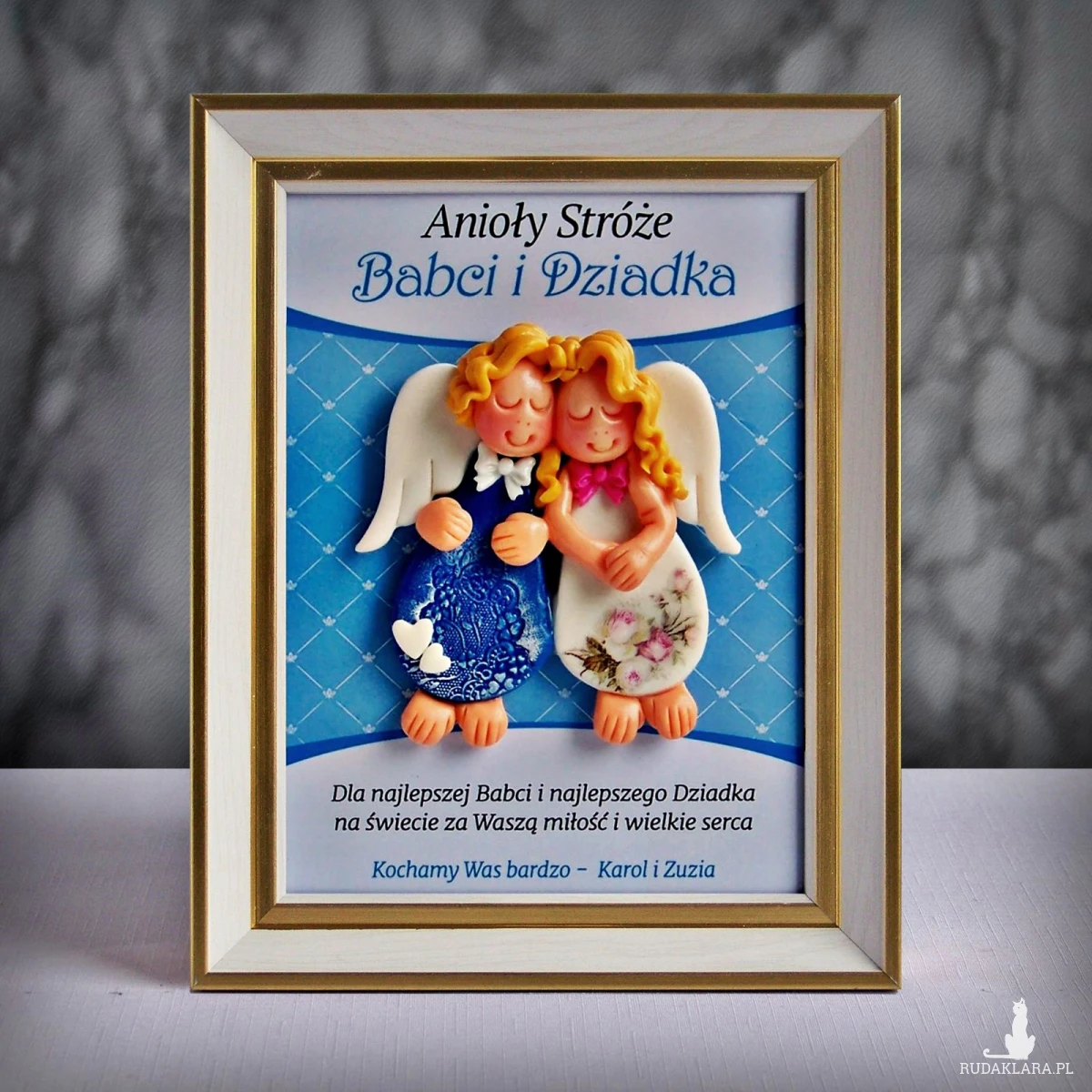 Personalizowana ramka z parą aniołków doskonale nadaje się na prezent z okazji Dnia Babci i Dziadka. Ramka z naszej pracowni to unikalny prezent, nigdzie nie znajdziesz podobnej. Dzięki personalizacji taka ramka jest prezentem oryginalnym, a jednocześnie bardzo osobistym. Aniołki są zrobione z zimnej porcelany i polakierowane bezpiecznym ekologicznym lakierem wodnym (lakier nie zawiera alkoholu). Warstwa lakieru zapewnia ochronę przed pobrudzeniem, a dodatkowo powoduje, że aniołki pięknie błyszczą. Ramka ma haczyk i podpórkę, więc można ją postawić lub powiesić.