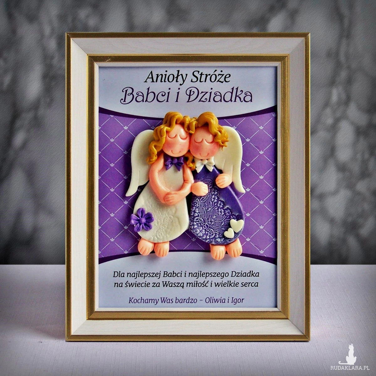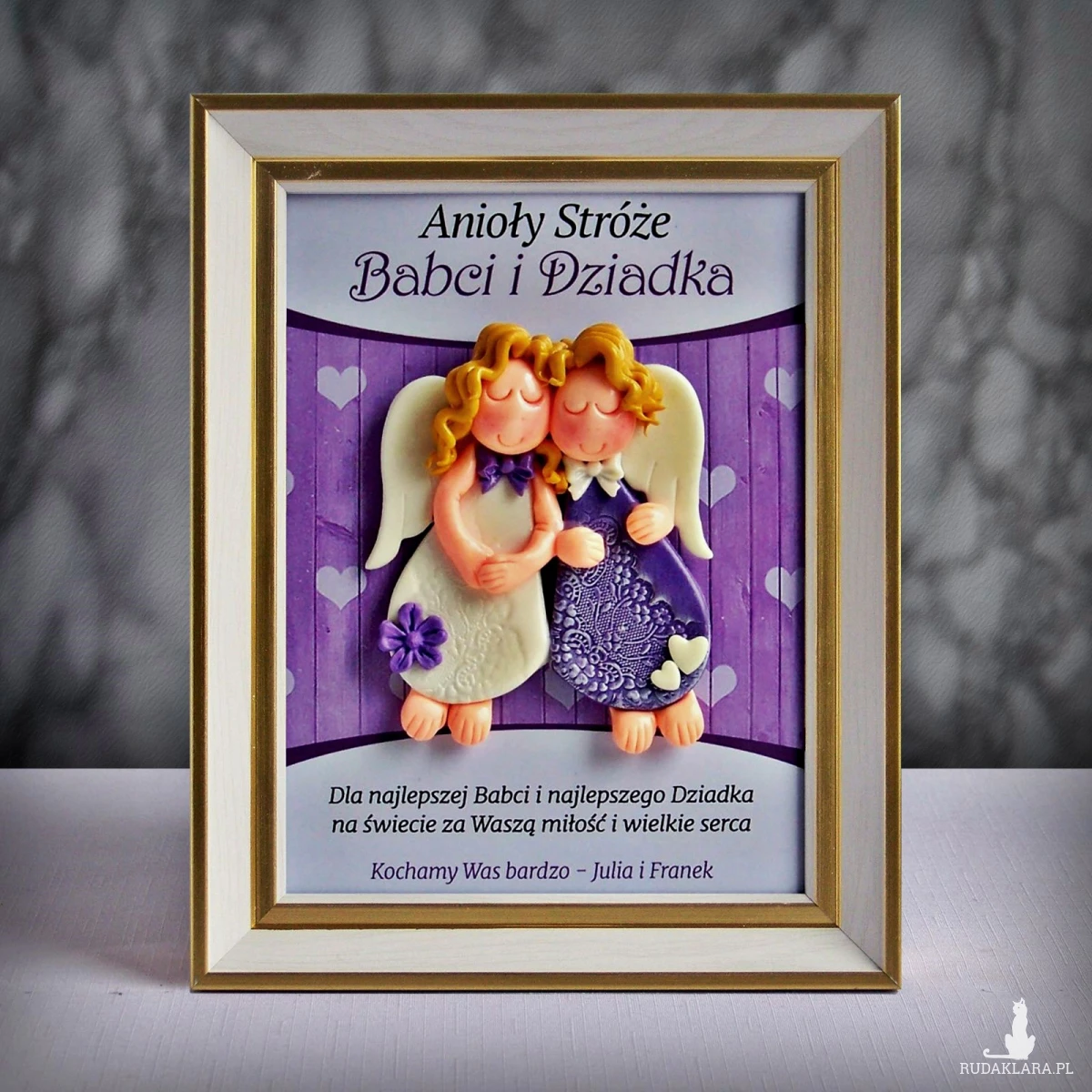 Personalizowana ramka z parą aniołków doskonale nadaje się na prezent z okazji Dnia Babci i Dziadka. Ramka z naszej pracowni to unikalny prezent, nigdzie nie znajdziesz podobnej. Dzięki personalizacji taka ramka jest prezentem oryginalnym, a jednocześnie bardzo osobistym. Aniołki są zrobione z zimnej porcelany i polakierowane bezpiecznym ekologicznym lakierem wodnym (lakier nie zawiera alkoholu). Warstwa lakieru zapewnia ochronę przed pobrudzeniem, a dodatkowo powoduje, że aniołki pięknie błyszczą. Ramka ma haczyk i podpórkę, więc można ją postawić lub powiesić.