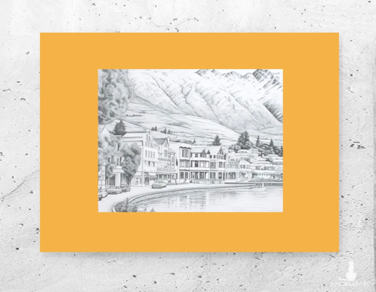 Biało czarny obrazek z pejzażem na pomarańczowym kartoniku A4. Dekoracja na ścianę do gabinetu, salonu, sypialni, jadalni, biura, przedpokoju, garderoby, kuchni, pokoju młodzieżowego, holu, kawiarni, restauracji itp. Plakat wystarczy dać do ramki 21x30 cm.. Poster będzie pasował do każdego stylu urządzania wnętrz.