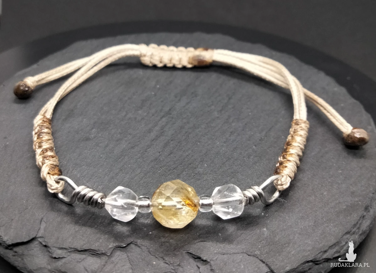 Bransoletka na stelażu ze stali szlachetnej z cytrynem i kryształem górskim. Z tyłu regulowany sznurek jubilerski.