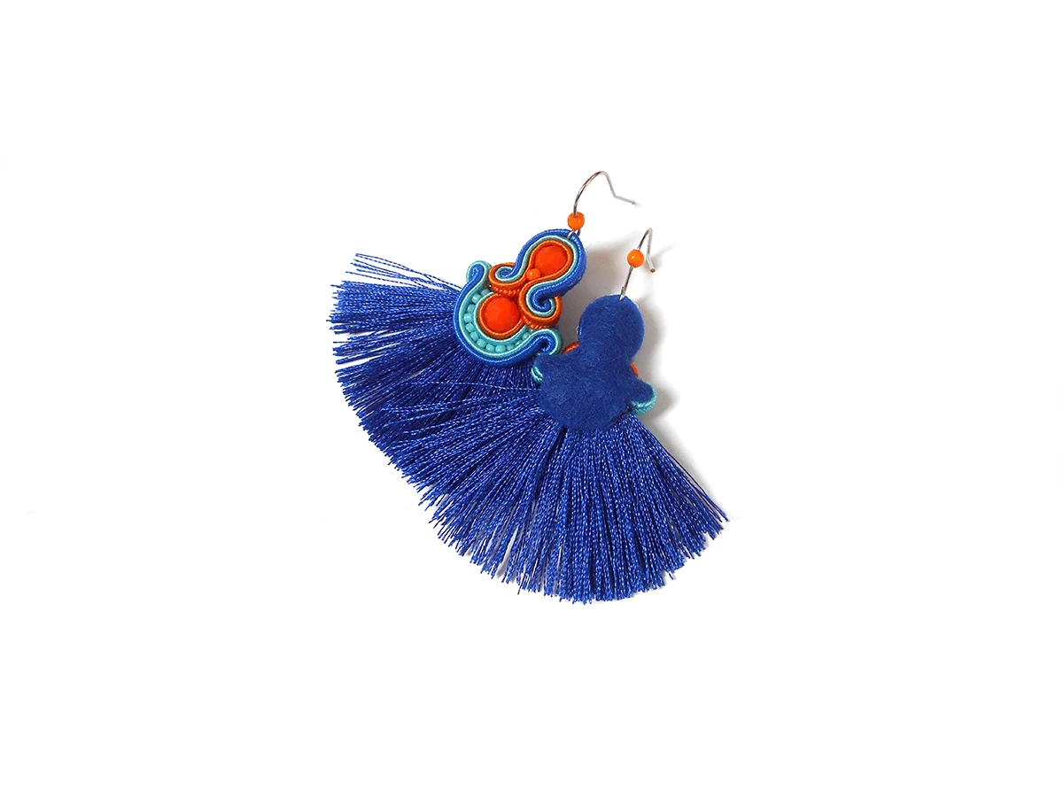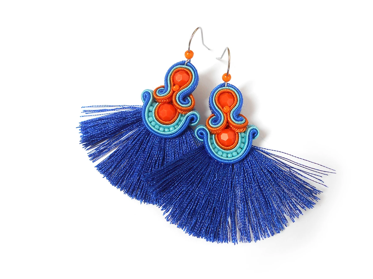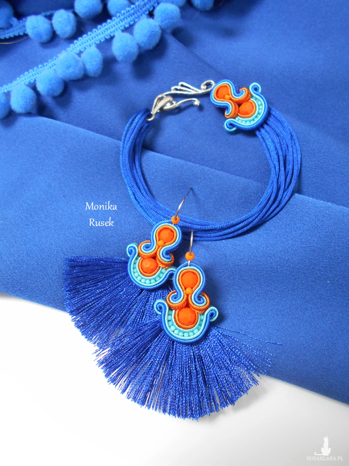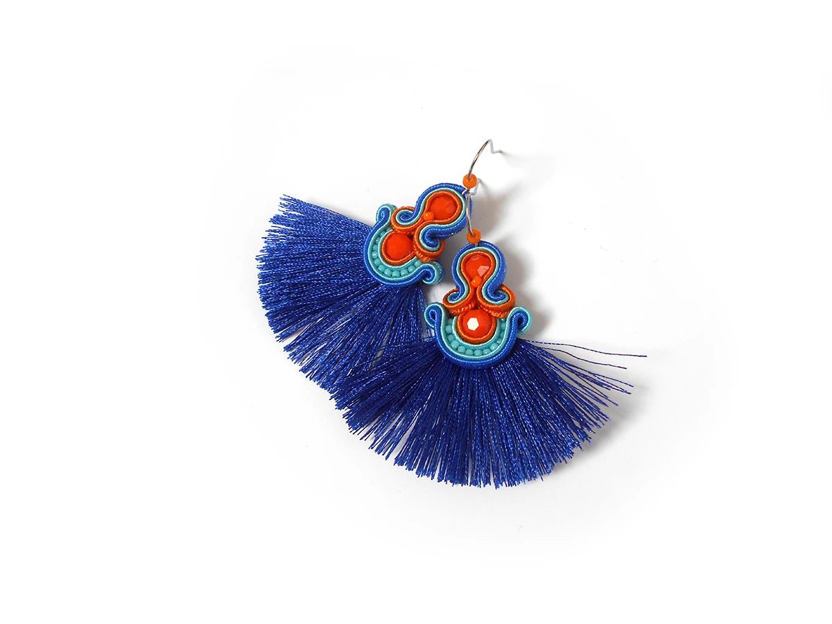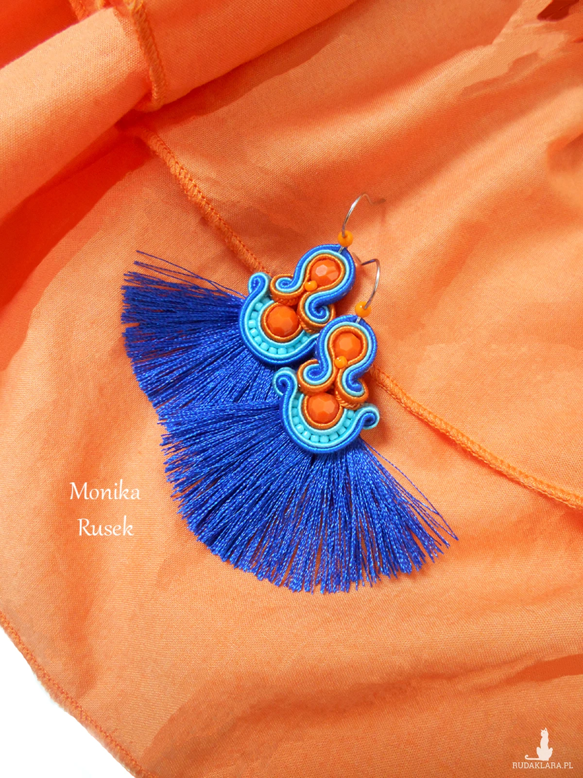 Wykonane z najlepszej jakości sznureczków w trzech kolorach: pomarańczowym, turkusowym oraz chabrowym, pomarańczowych kryształków oraz drobnych koralików szklanych. Tył starannie wykończony cienkim filcem, dopasowanym kolorystycznie. Całość impregnowana, co w znacznym stopniu zabezpiecza przed zabrudzeniami.