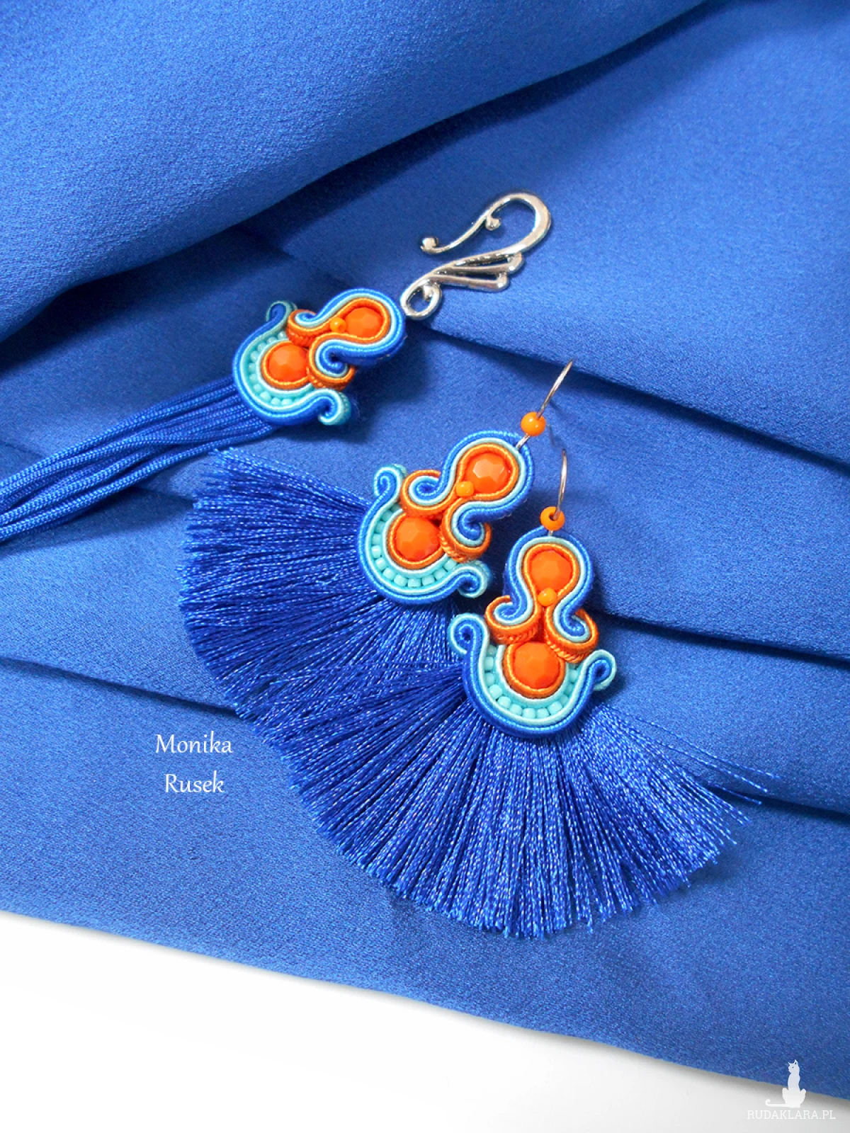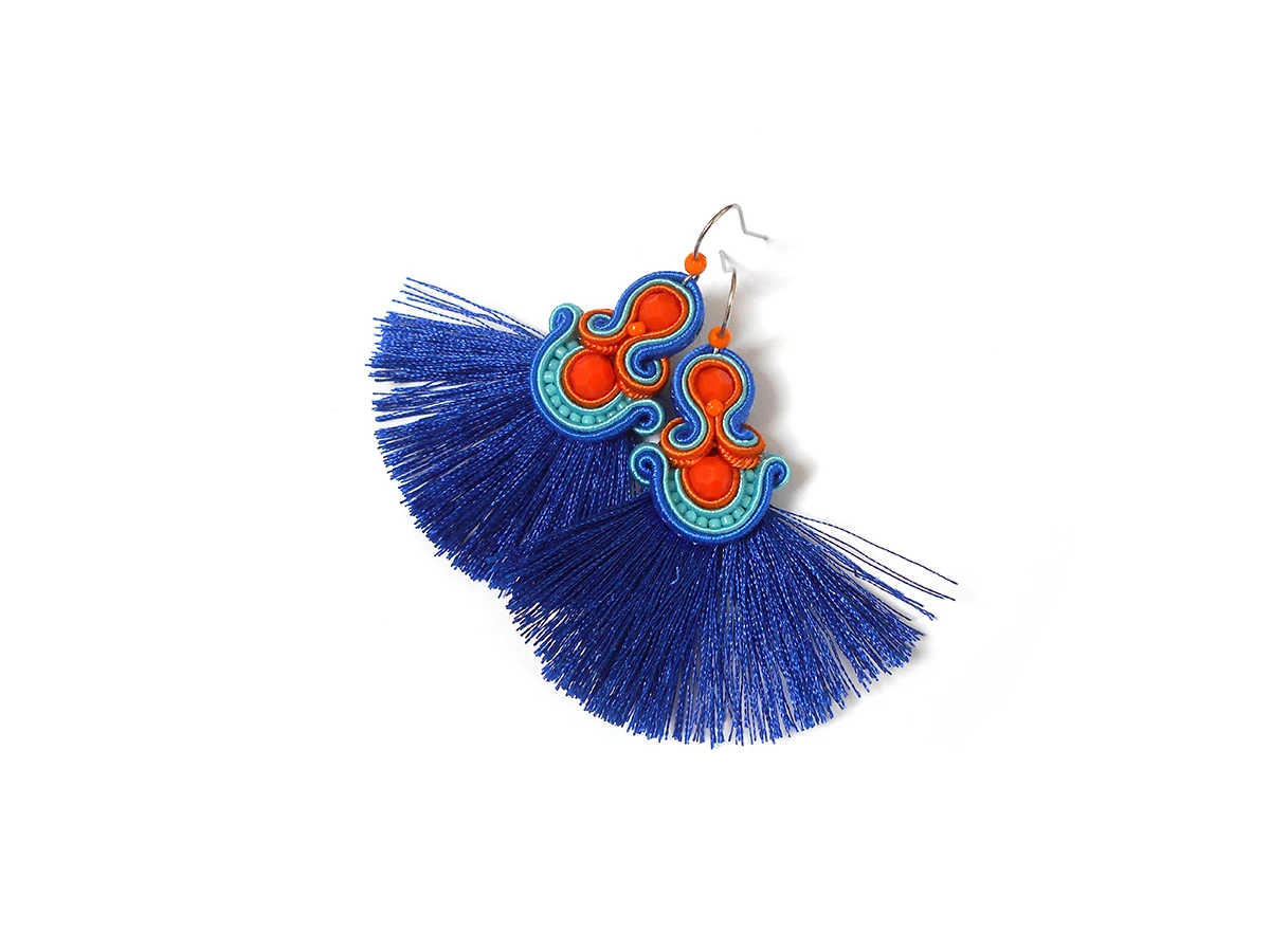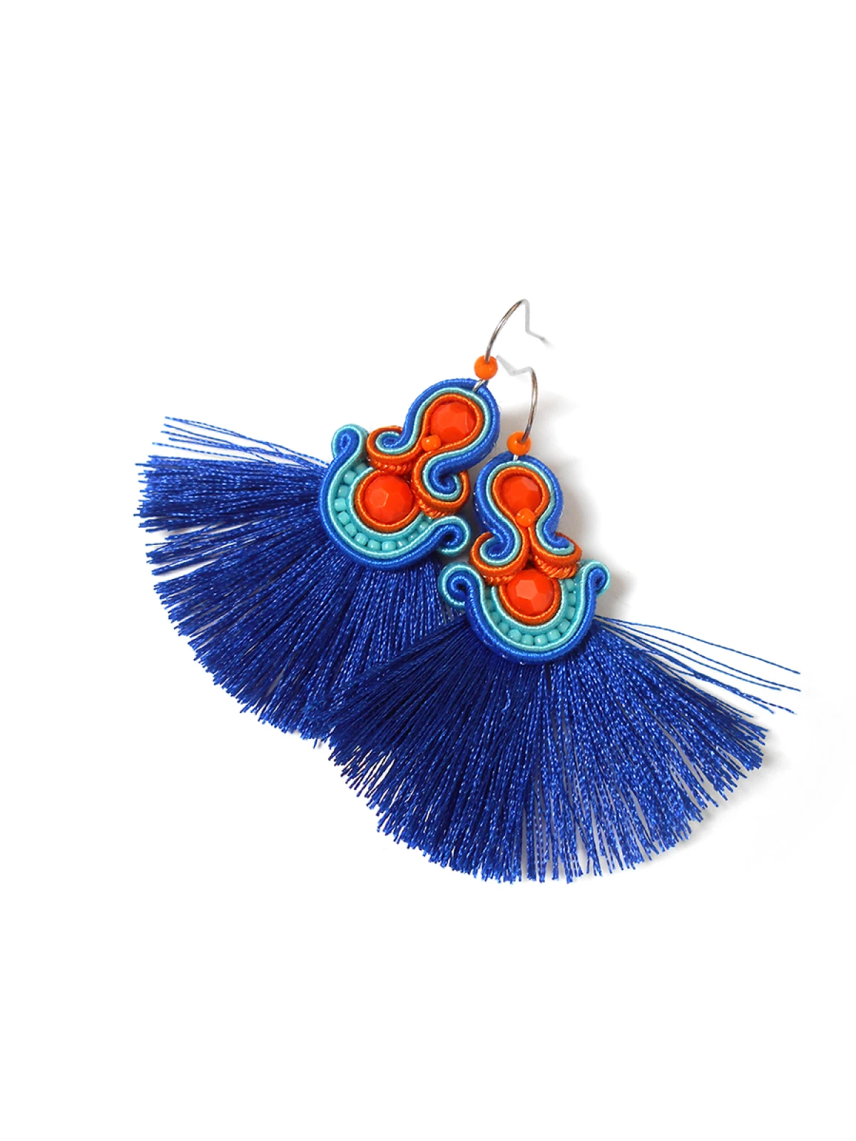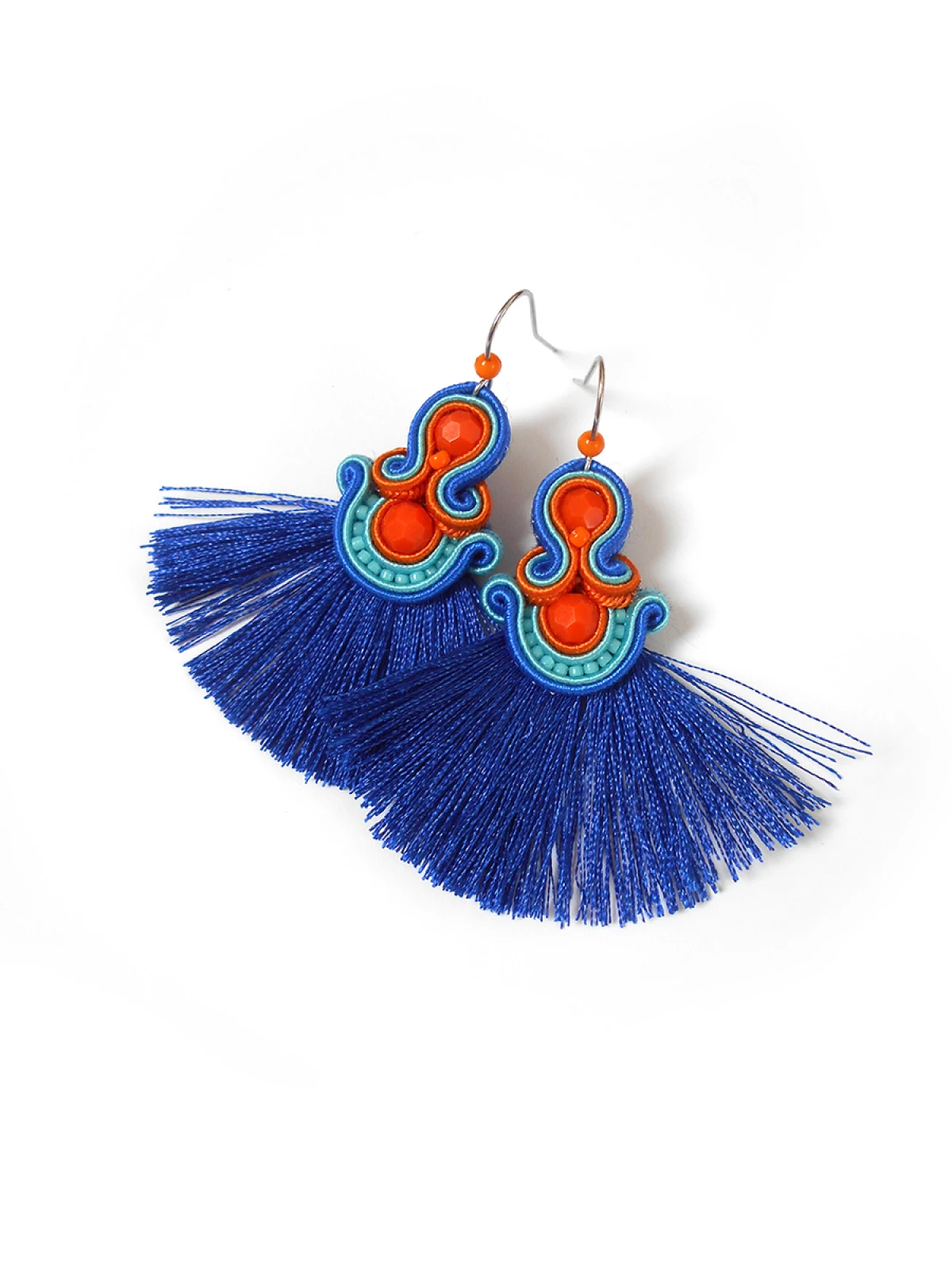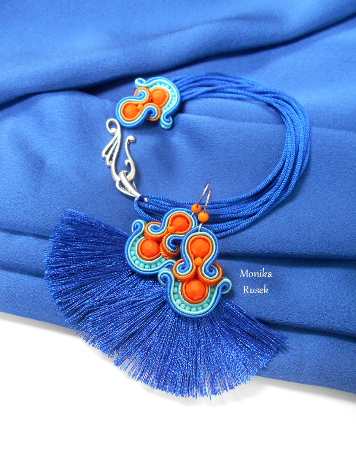 Wykonane z najlepszej jakości sznureczków w trzech kolorach: pomarańczowym, turkusowym oraz chabrowym, pomarańczowych kryształków oraz drobnych koralików szklanych. Tył starannie wykończony cienkim filcem, dopasowanym kolorystycznie. Całość impregnowana, co w znacznym stopniu zabezpiecza przed zabrudzeniami.