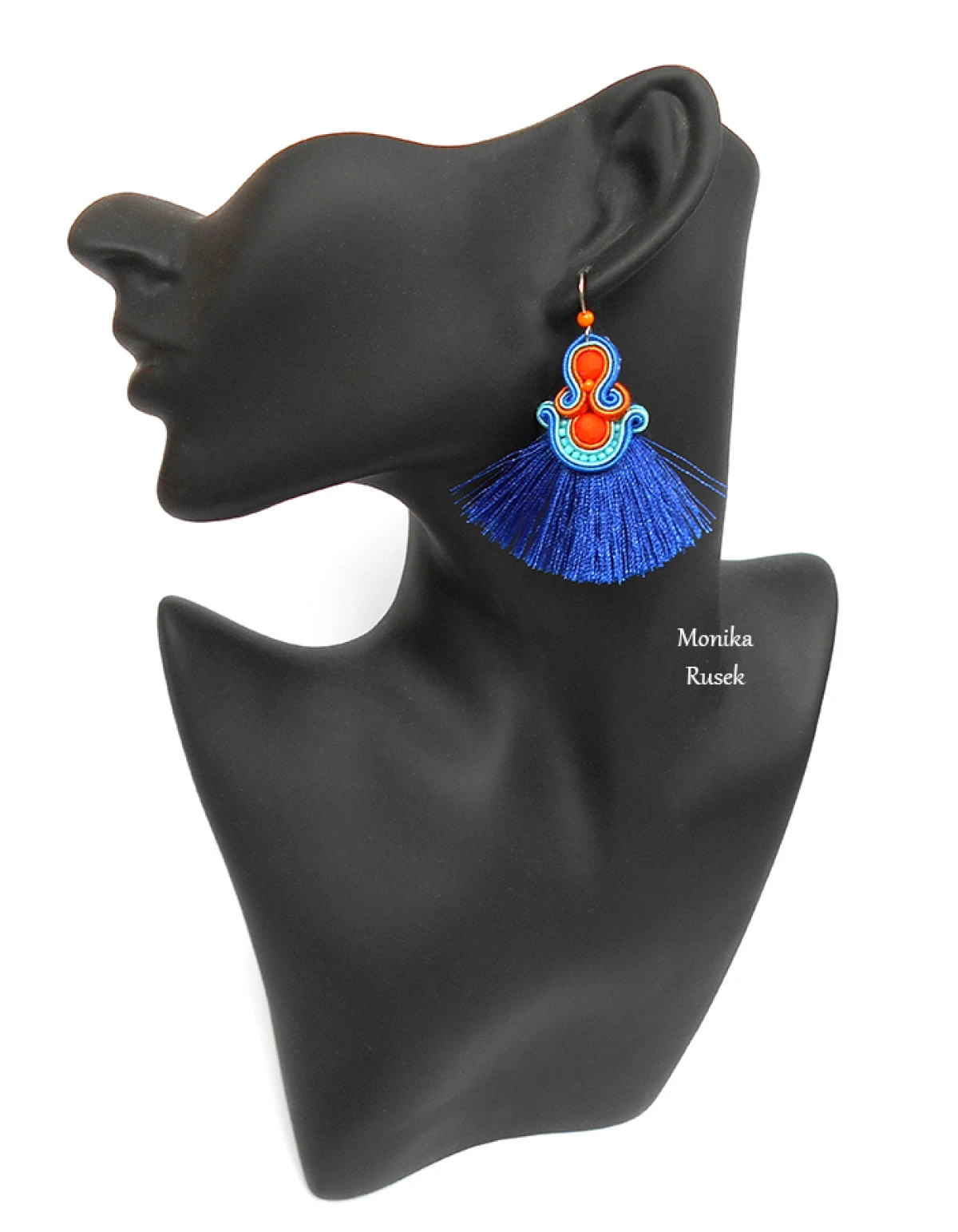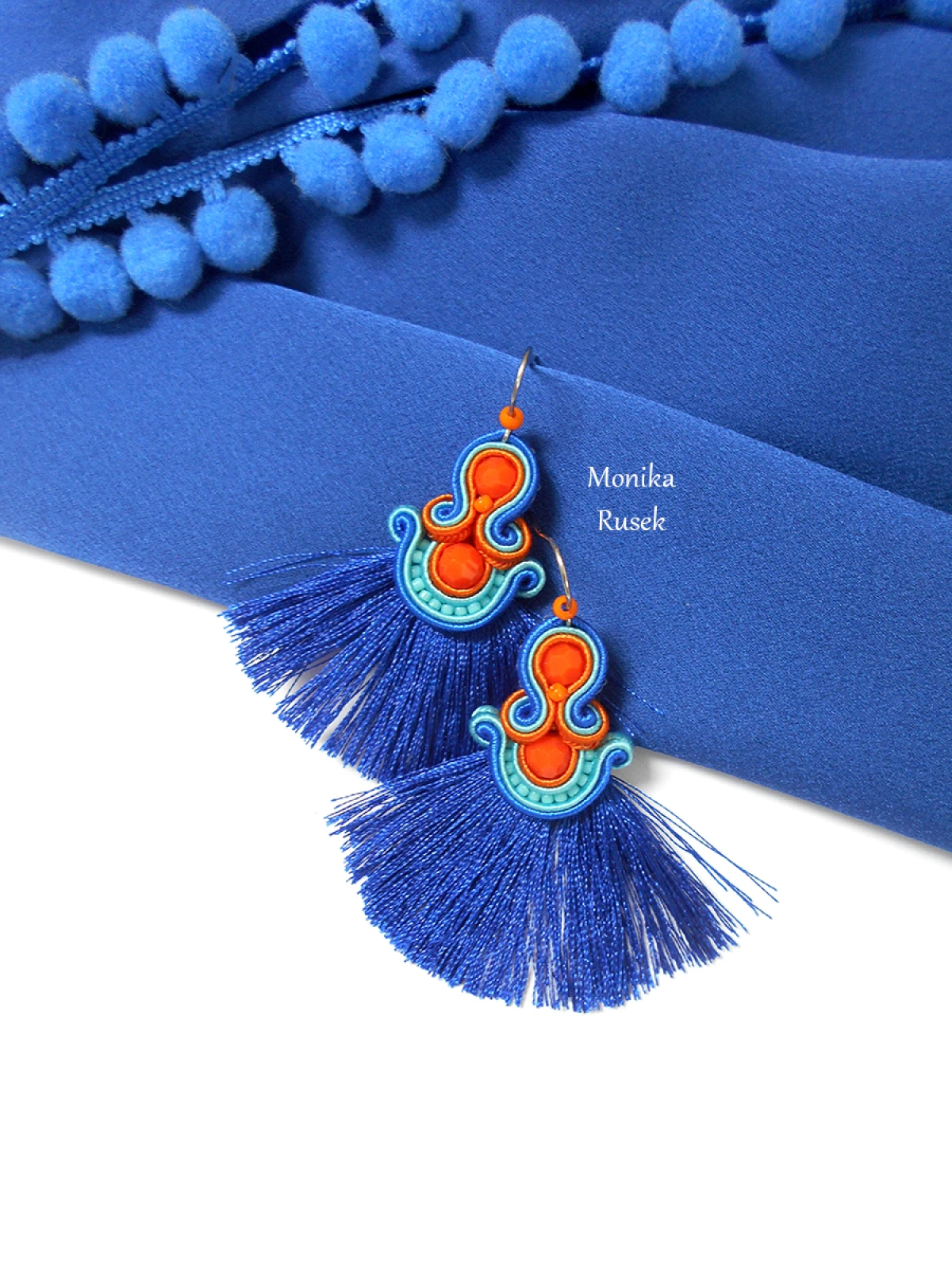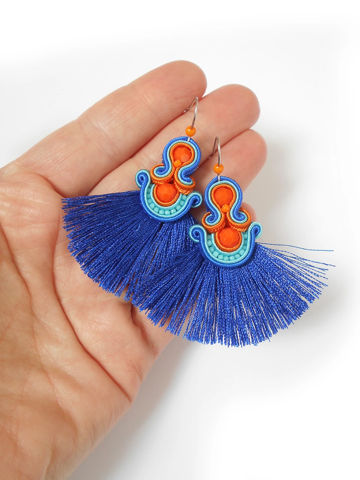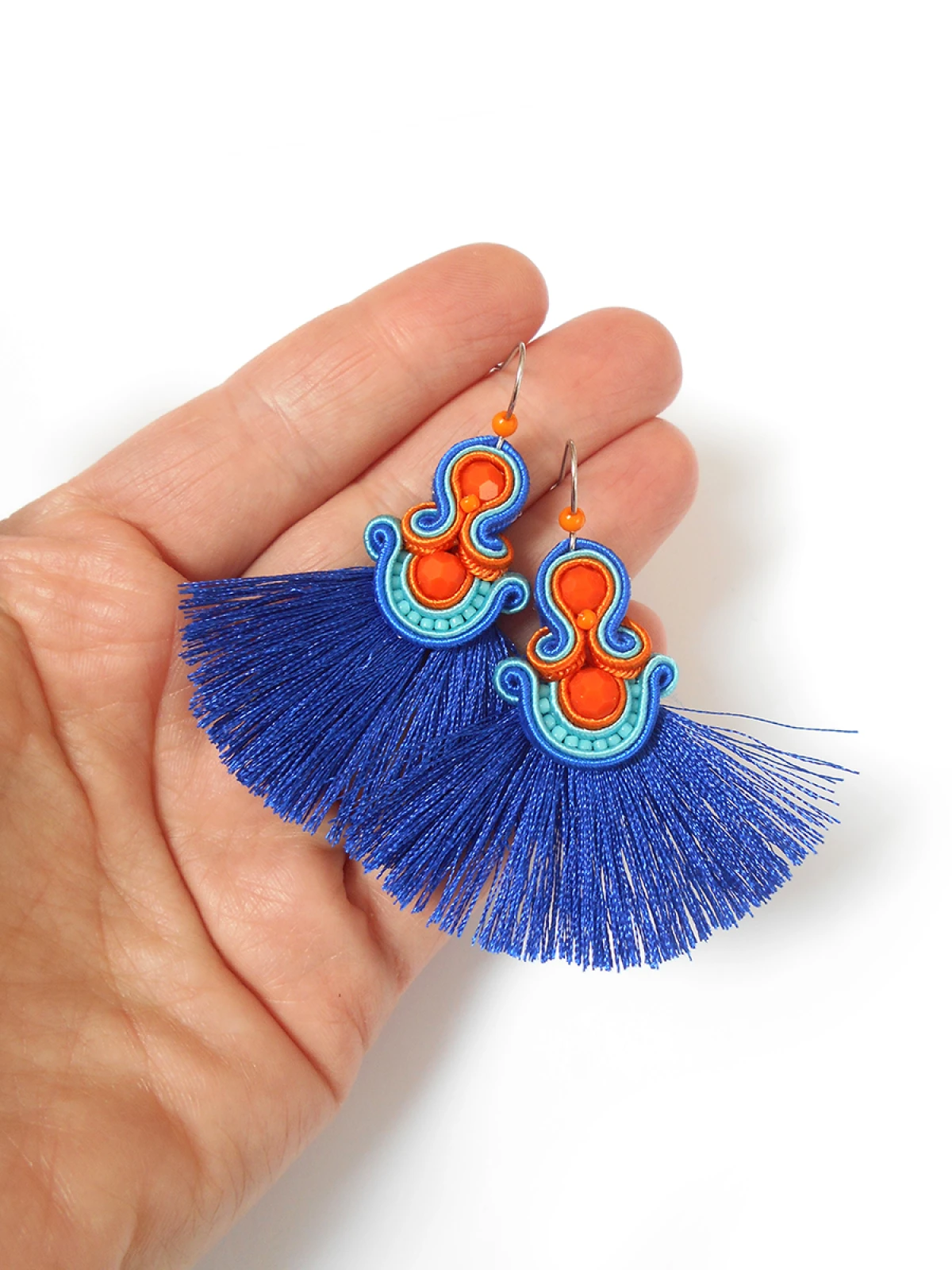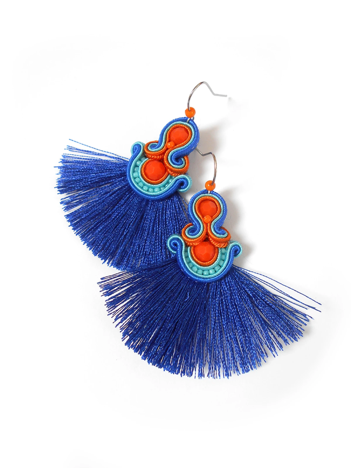 Wykonane z najlepszej jakości sznureczków w trzech kolorach: pomarańczowym, turkusowym oraz chabrowym, pomarańczowych kryształków oraz drobnych koralików szklanych. Tył starannie wykończony cienkim filcem, dopasowanym kolorystycznie. Całość impregnowana, co w znacznym stopniu zabezpiecza przed zabrudzeniami.