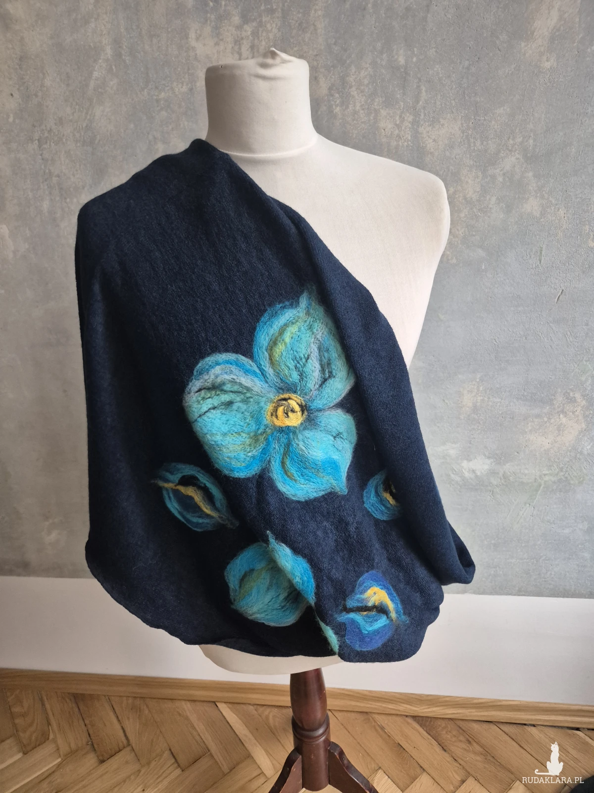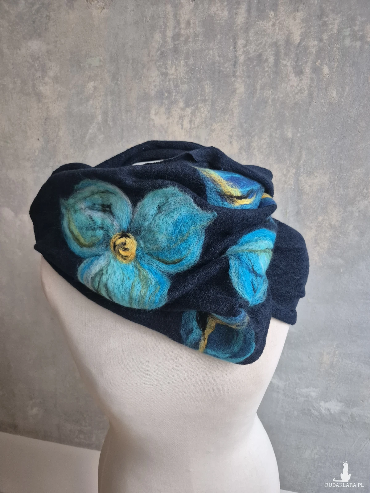 Super prezent na dzień mamy granatowy filcowany wełniany miły i ciepły komin handmade- tuba, owijany dwa razy, filcowany wełną merynosów, bardzo ciepły i miły, doskonały na prezent, fantastyczny na codzienne noszenie, zwraca uwagę, dodaje koloru, nie zginiesz w tym kominie na ulicy, pojedyncze egzemplarze, polecam bestseller- Ruda Klara-czas oczekiwania 1,5 tyg box x1