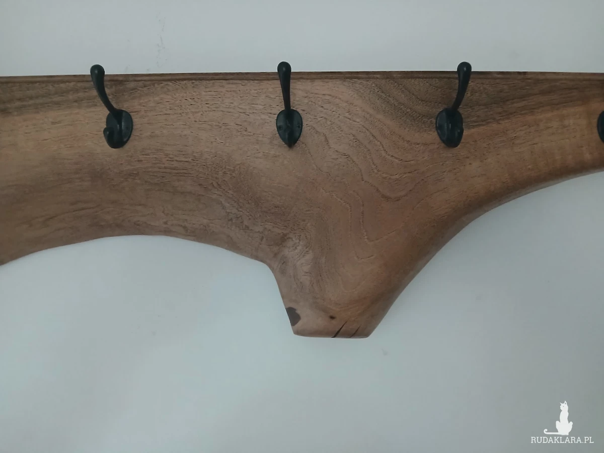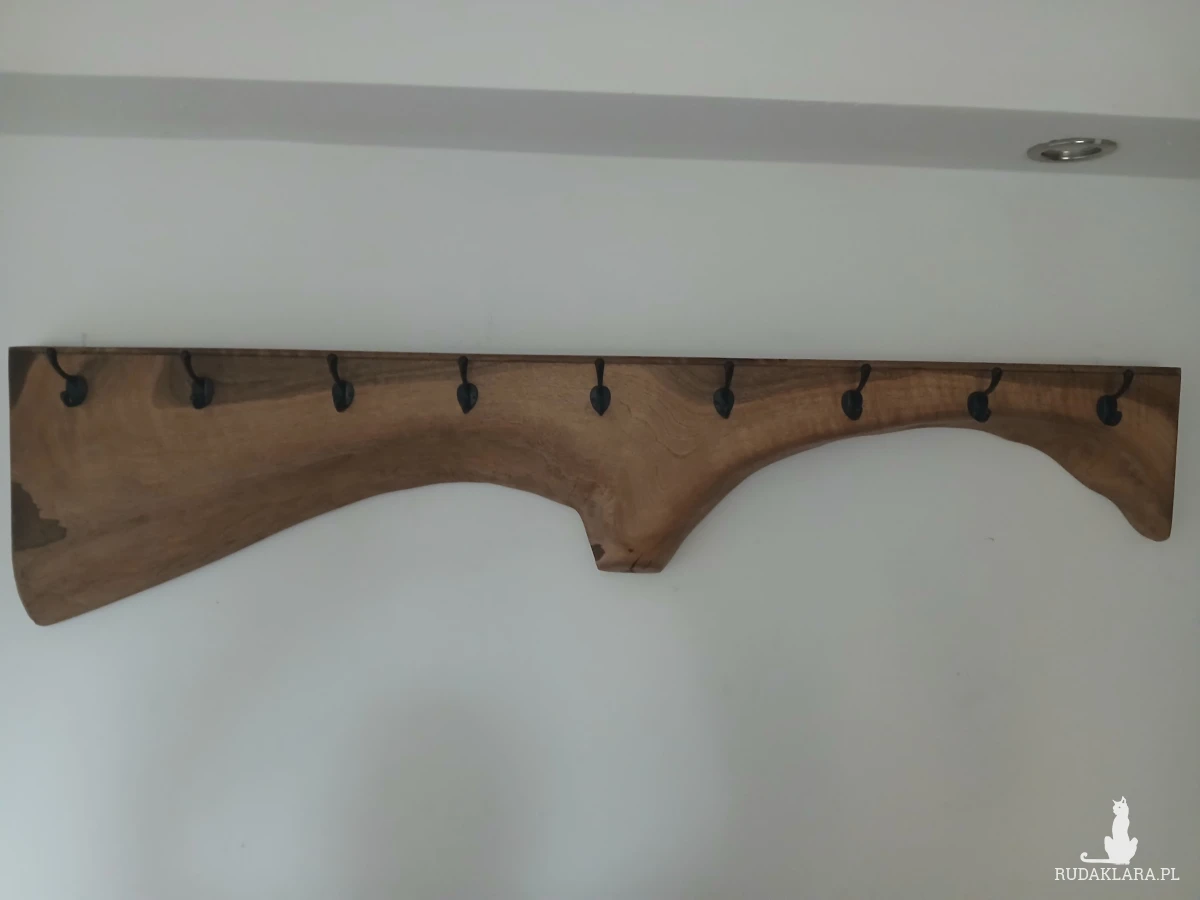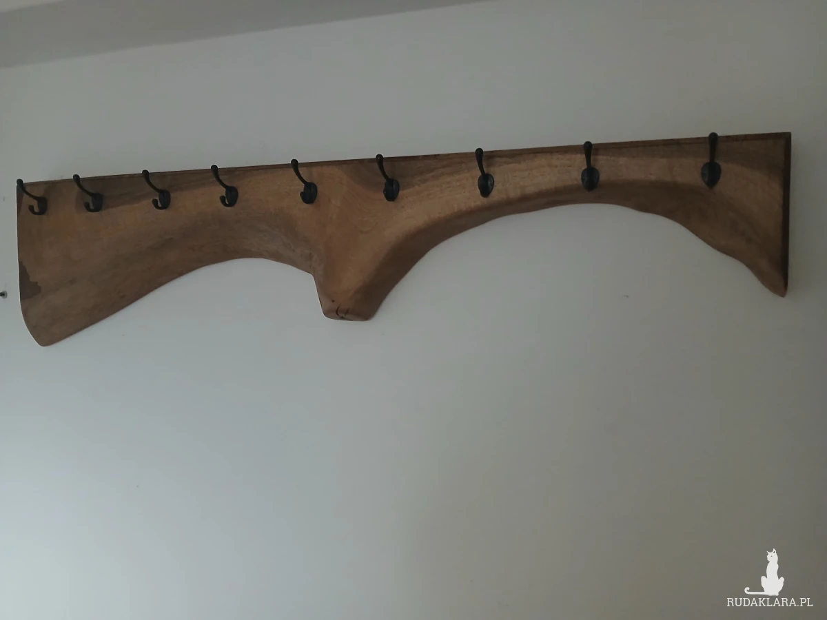 Wieszak z drewna wiązu z 9 wieszaczkami szerokość 116cm,wys.28-19cm,gr.6cm,zabezpieczony woskiem.Z tyłu ma zawieszki typu "krokodylek"