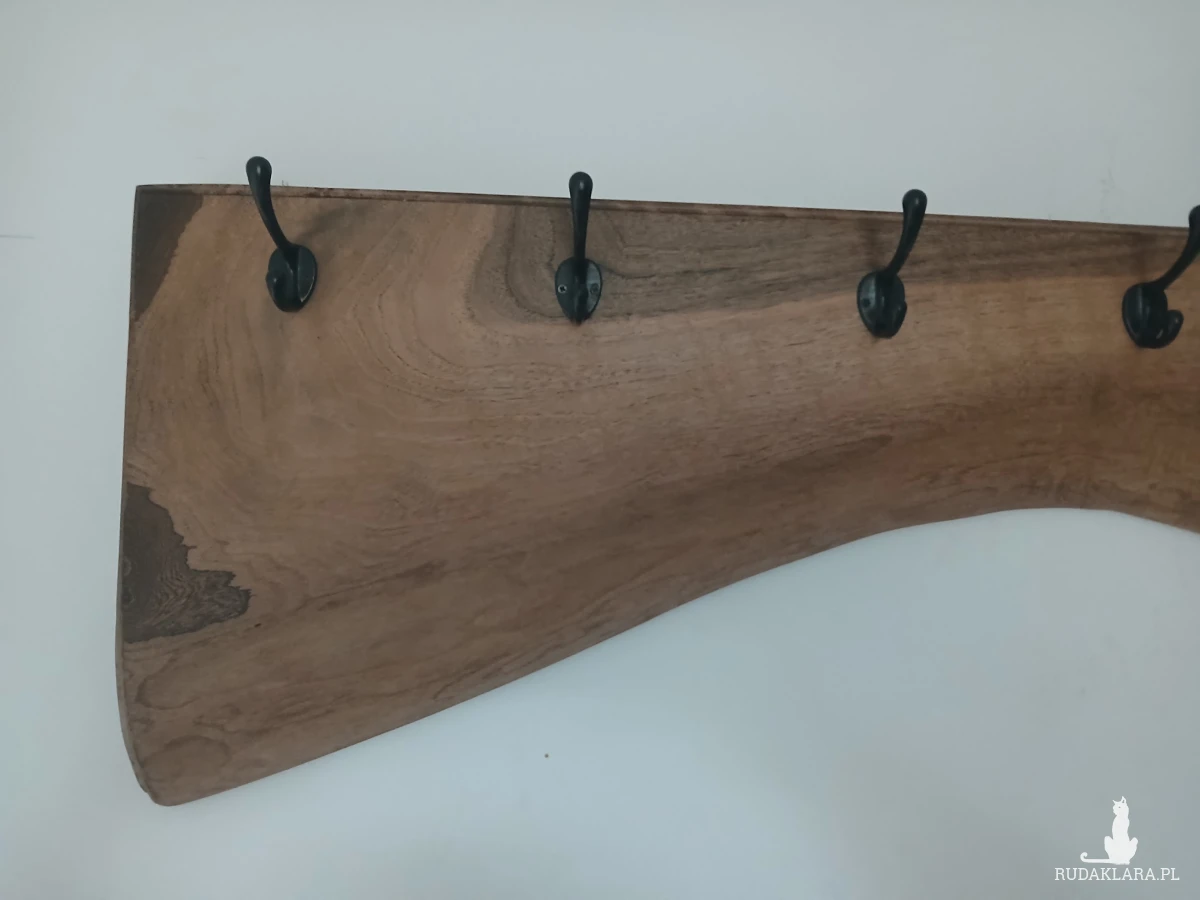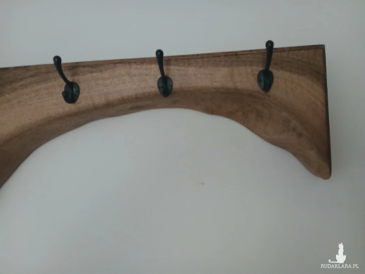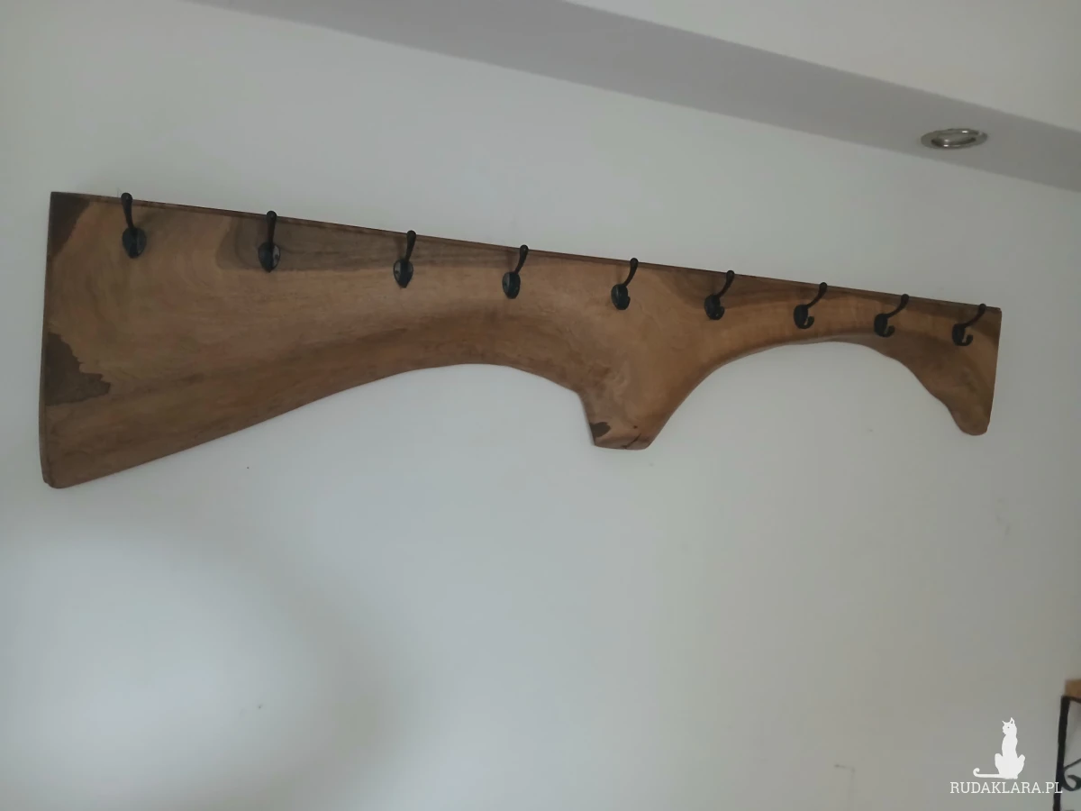 Wieszak z drewna wiązu z 9 wieszaczkami szerokość 116cm,wys.28-19cm,gr.6cm,zabezpieczony woskiem.Z tyłu ma zawieszki typu "krokodylek"
