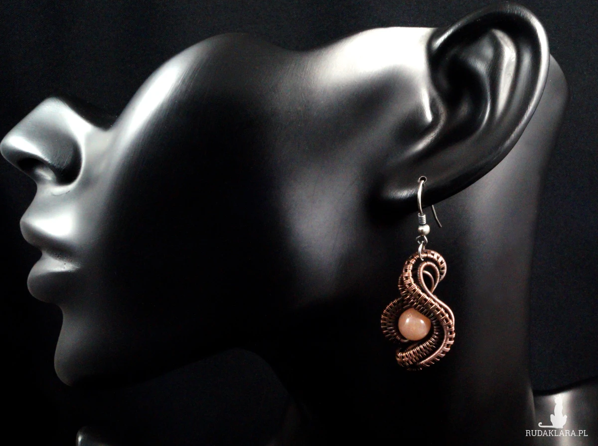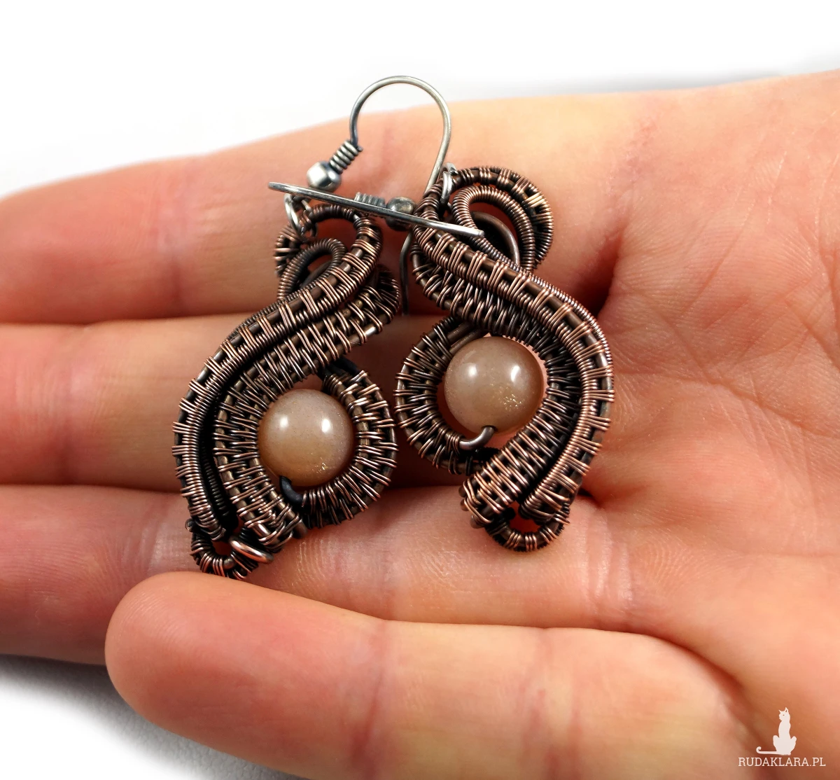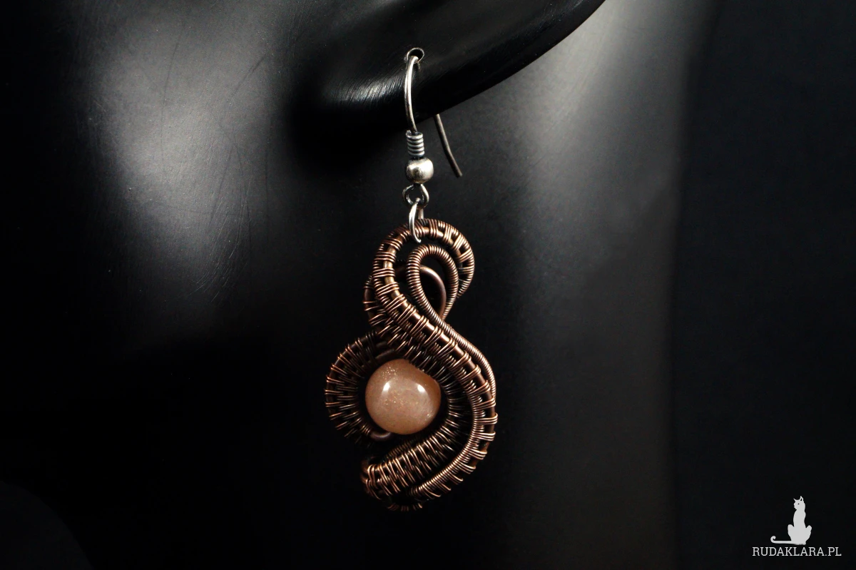 Miedziane, patynowane kolczyki z kuleczkami kamienia słonecznego.
