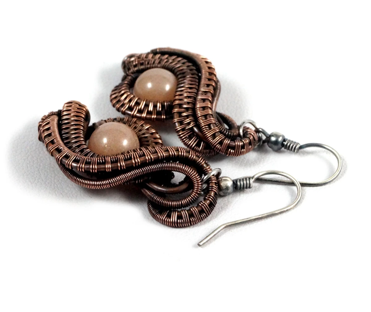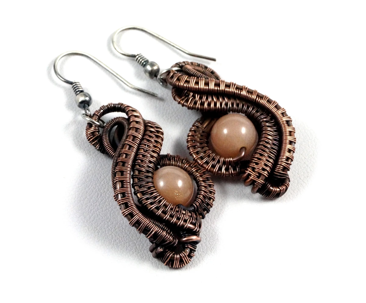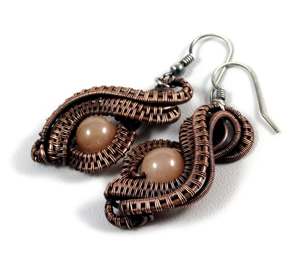 Miedziane, patynowane kolczyki z kuleczkami kamienia słonecznego.
