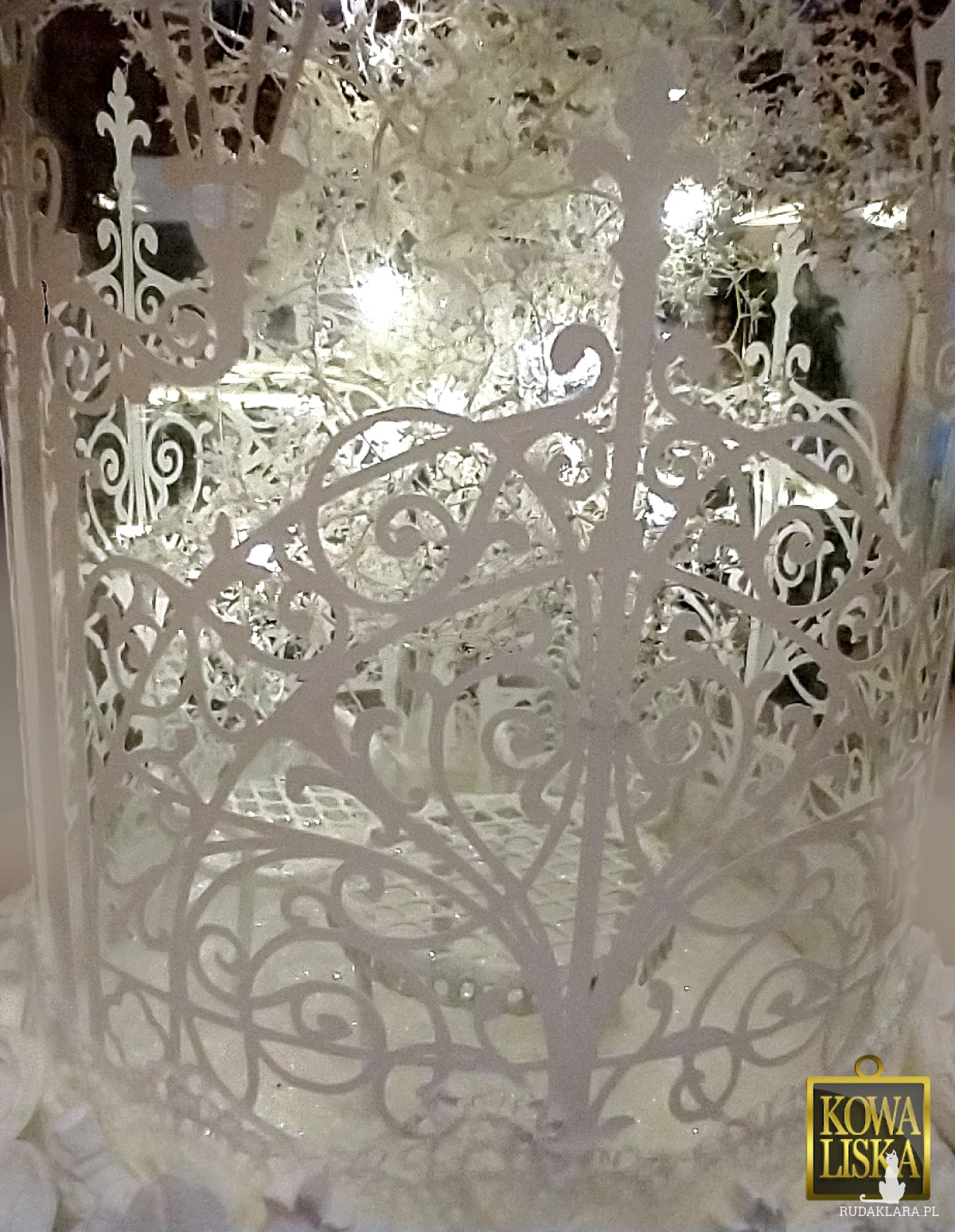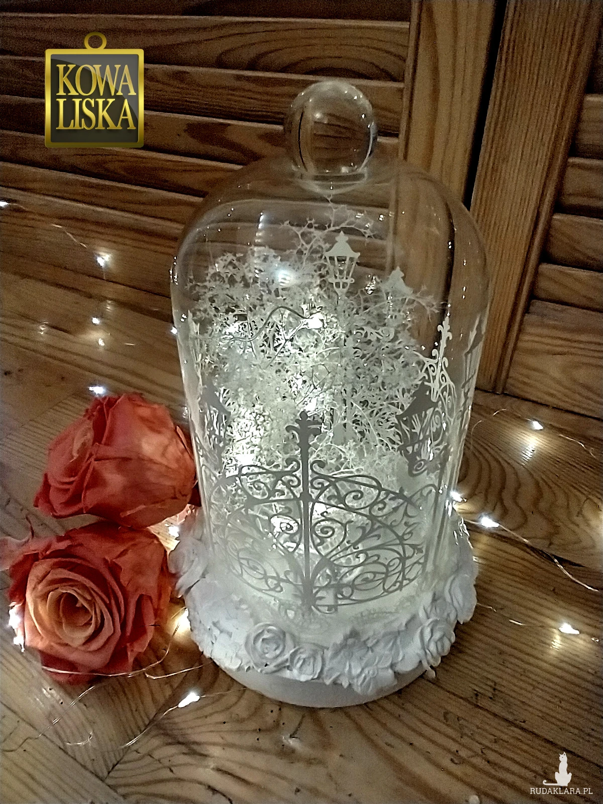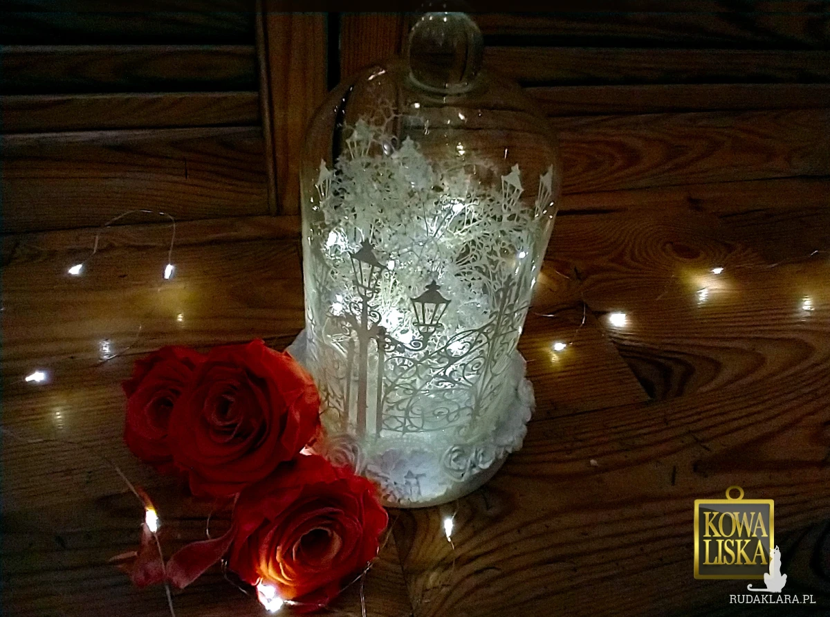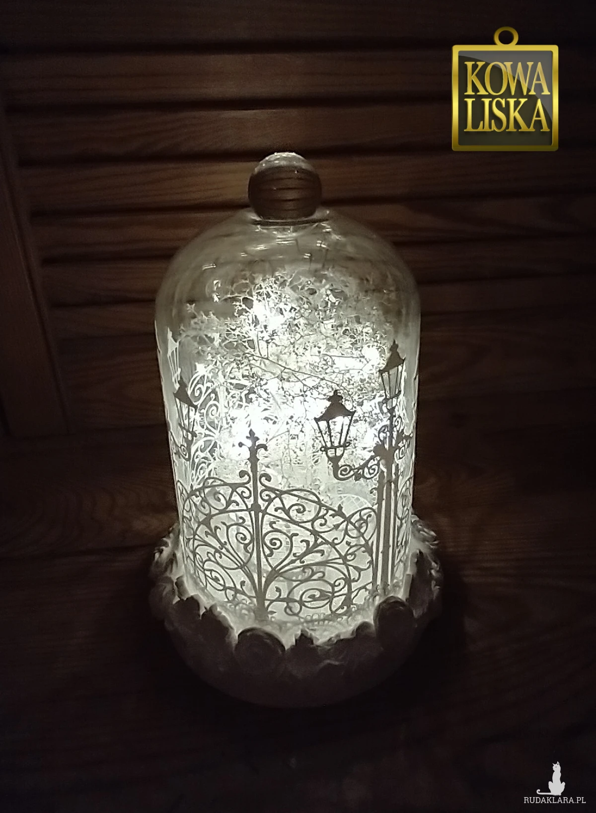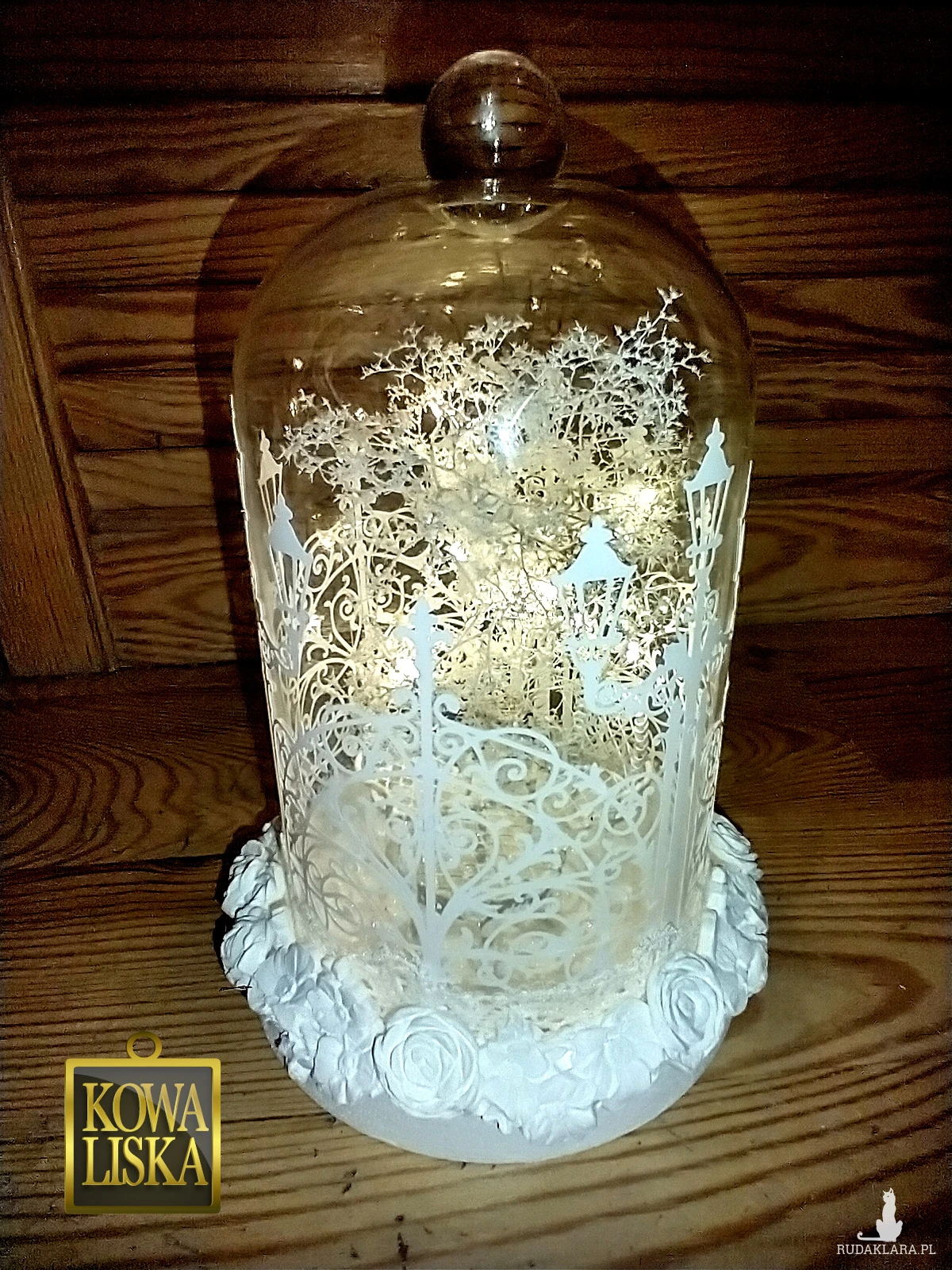 Wykonany na bazie szklanego klosza lampion jest ozdobiony z zewnątrz elementami z białej folii. Zamknięte w środku prawdziwe gałązki imitują białe, oszronione drzewko. Obsypane szklanym pyłem niczym szronem, po włączeniu pięknie odbija światło i skrzy. Jeśli zajrzysz za "ogrodzenie", odkryjesz pozostawione z lata stolik i krzesełka, na których chciałoby się przysiąść, odpocząć od zgiełku i wsłuchać w białą ciszę.