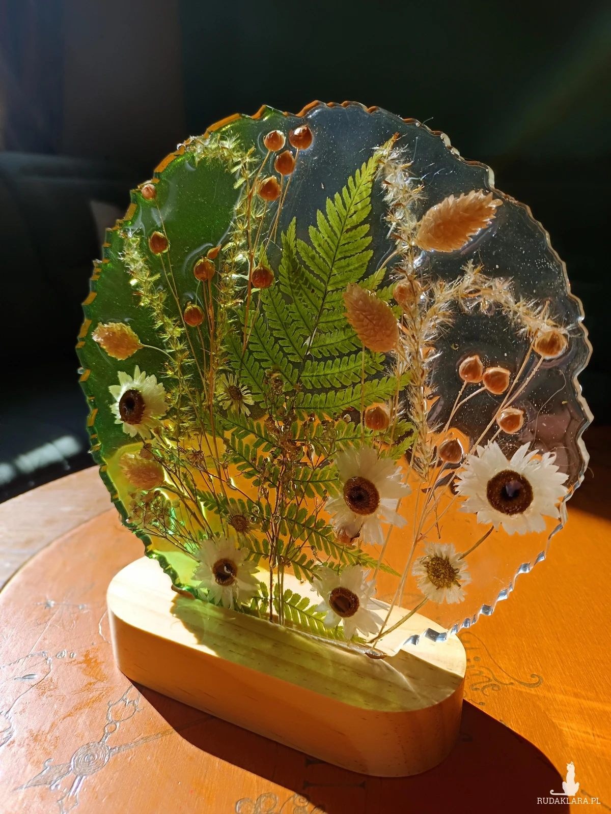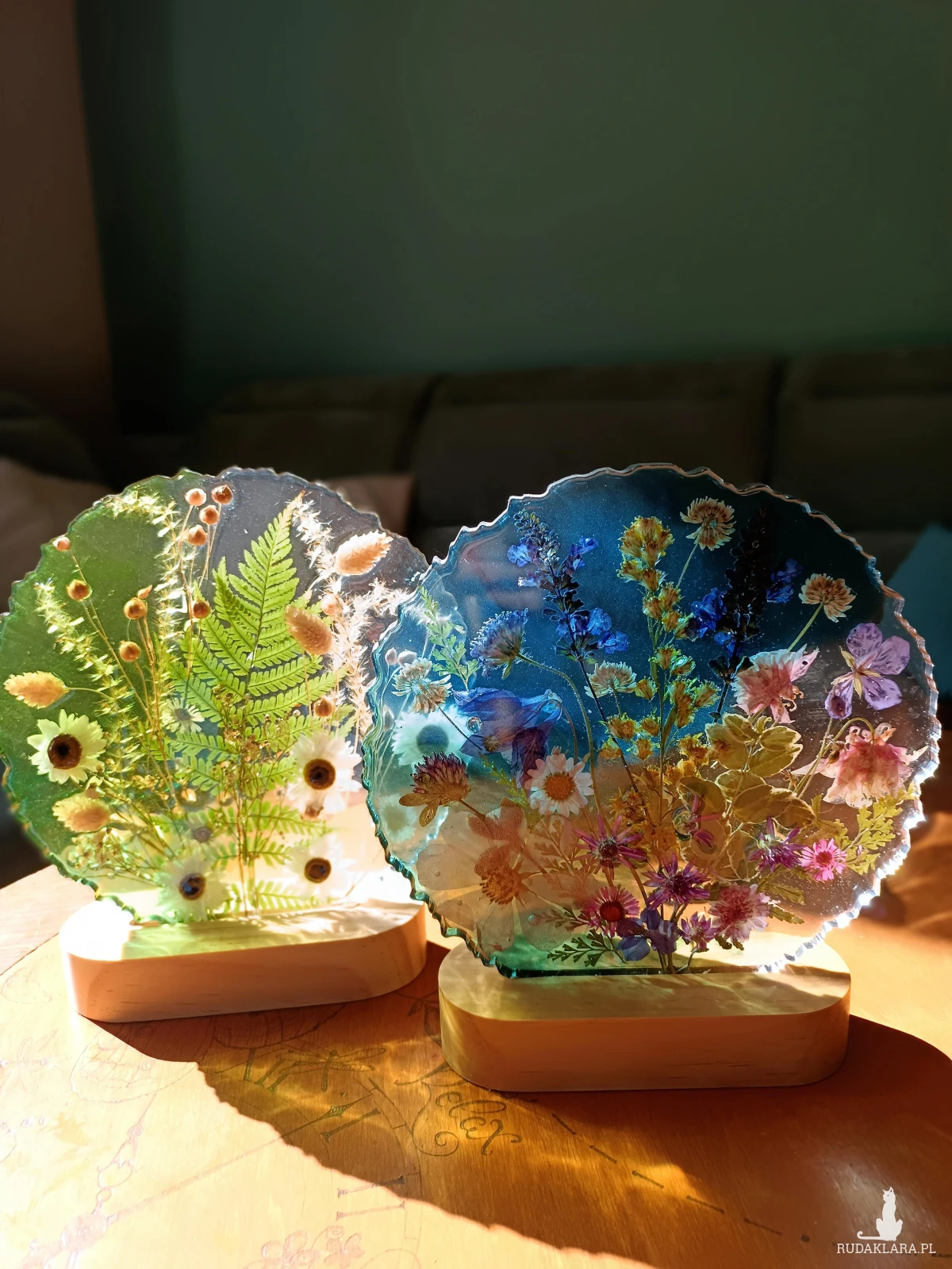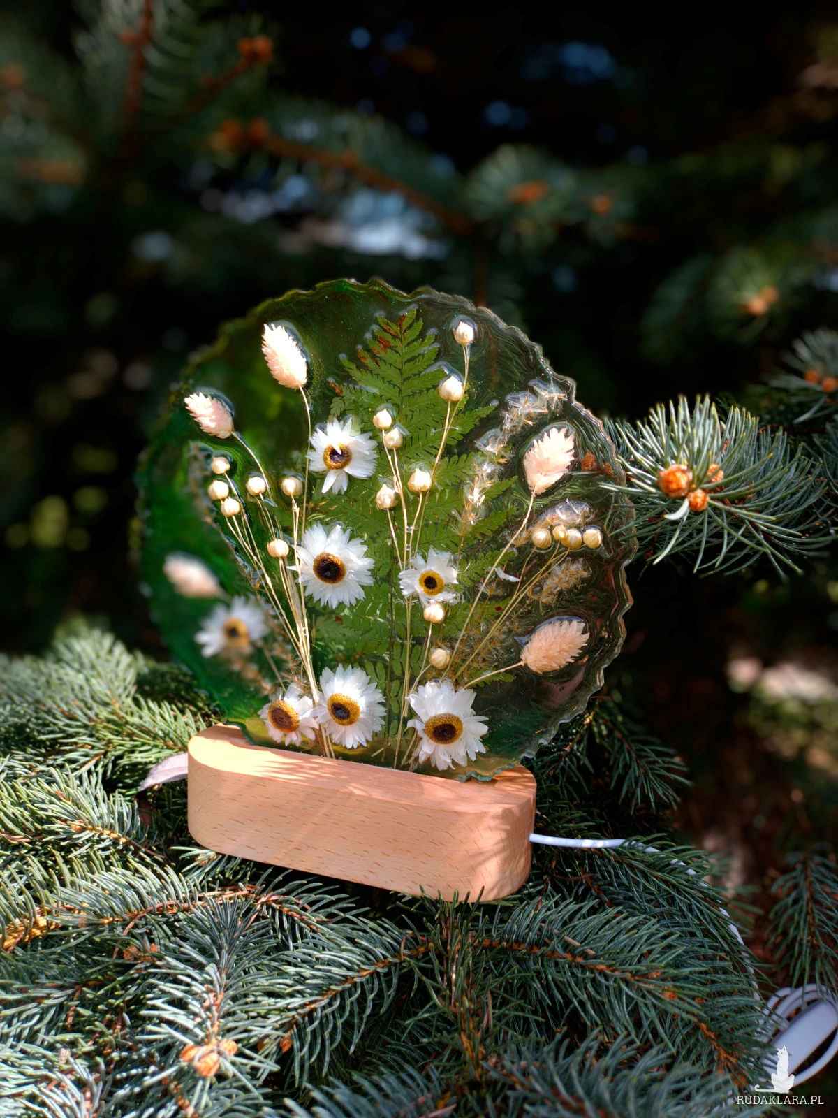 Lampka zasilana przewodem USB, daje subtelne światło rozświetlające zatopione w żywicy kwiaty.