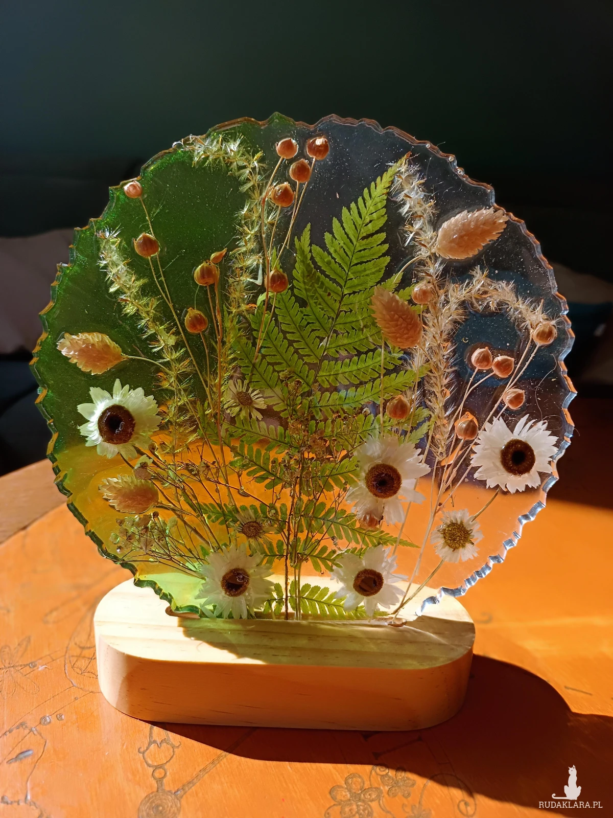 Lampka LED z autorską kompozycją z suszonych kwiatów - tonacja zielona