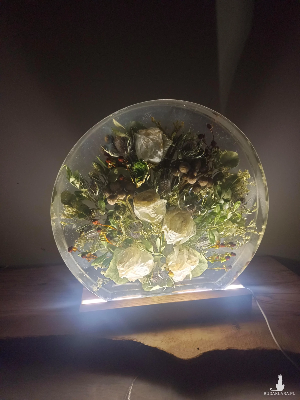 - Lampka w kształcie okręgu- wykonywana w głębokiej formie z kwiatów przestrzennych i drobnych na drewnianej podstawie z podświetleniem LED, zasilane kablem usb.