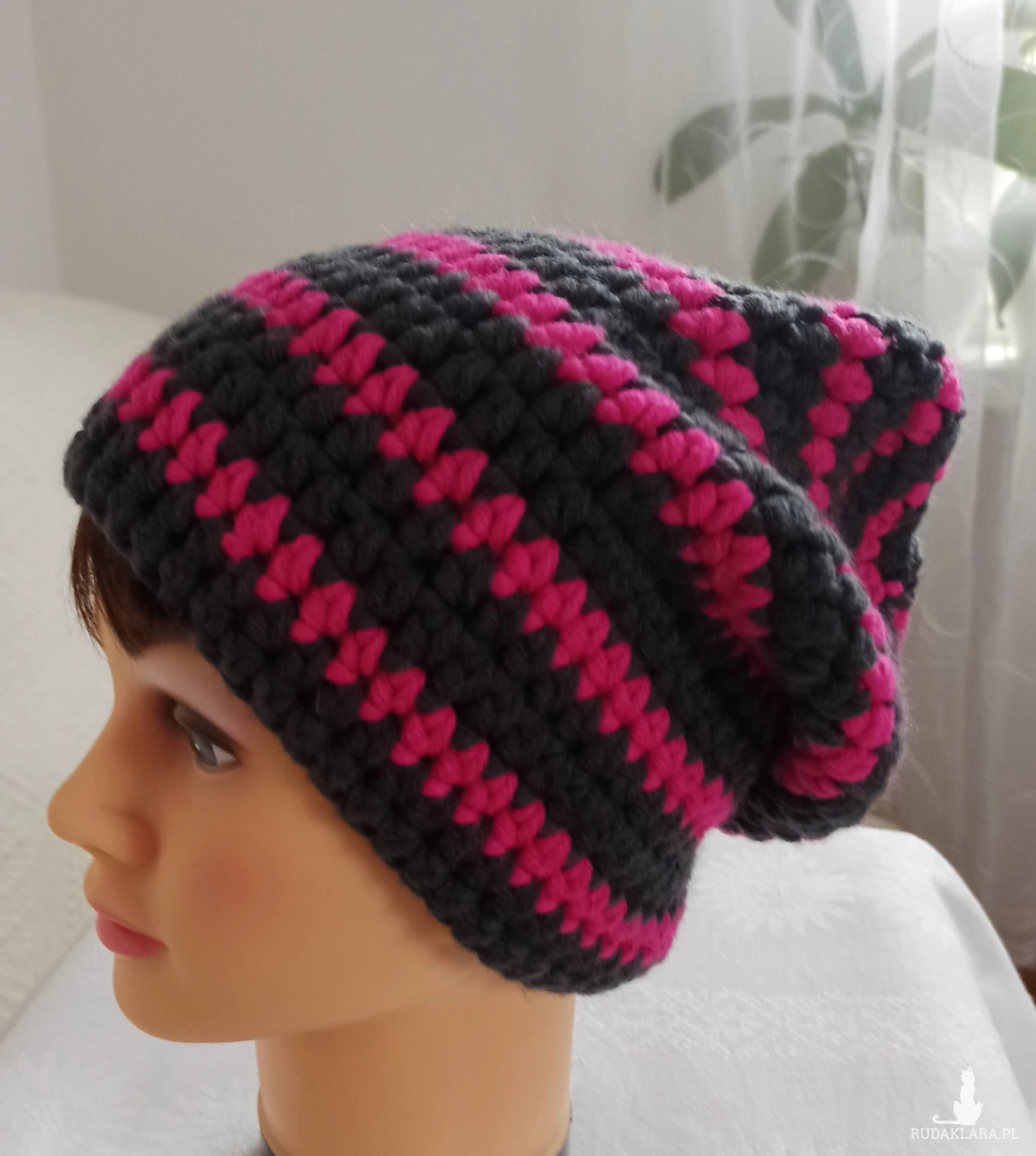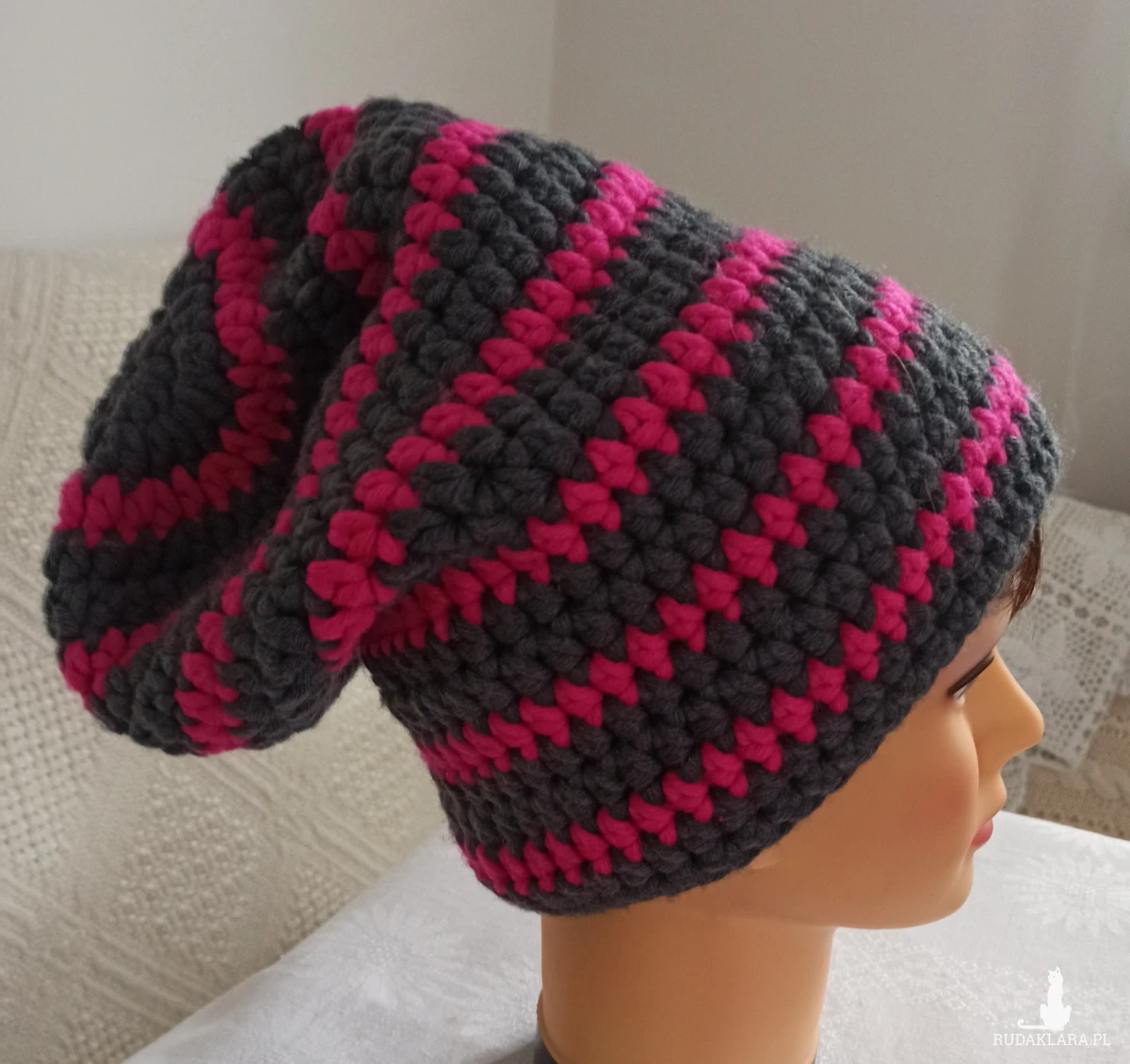 Duża czapka w paski typu oversize wykonana ręcznie z grubej nici wełniano-bawełnianej w kolorach grafit i ciemny róż. Wykonana pięknym splotem. Bardzo miękka i przyjemna w dotyku, dobrze ogrzewa i jest przewiewna. Można wywijać na dowolną wysokość wg uznania i potrzeby. Kolory modne w tym sezonie, idealne do wielu zestawień ubrań. Wymiary: wysokość 29 cm, obwód bez rozciągania 53 cm. Można prać w pralce lecz polecam pranie ręcznie by zachować kształt..Gorąco polecam, niska cena. Kup, bo ktoś może CIĘ UBIEC.