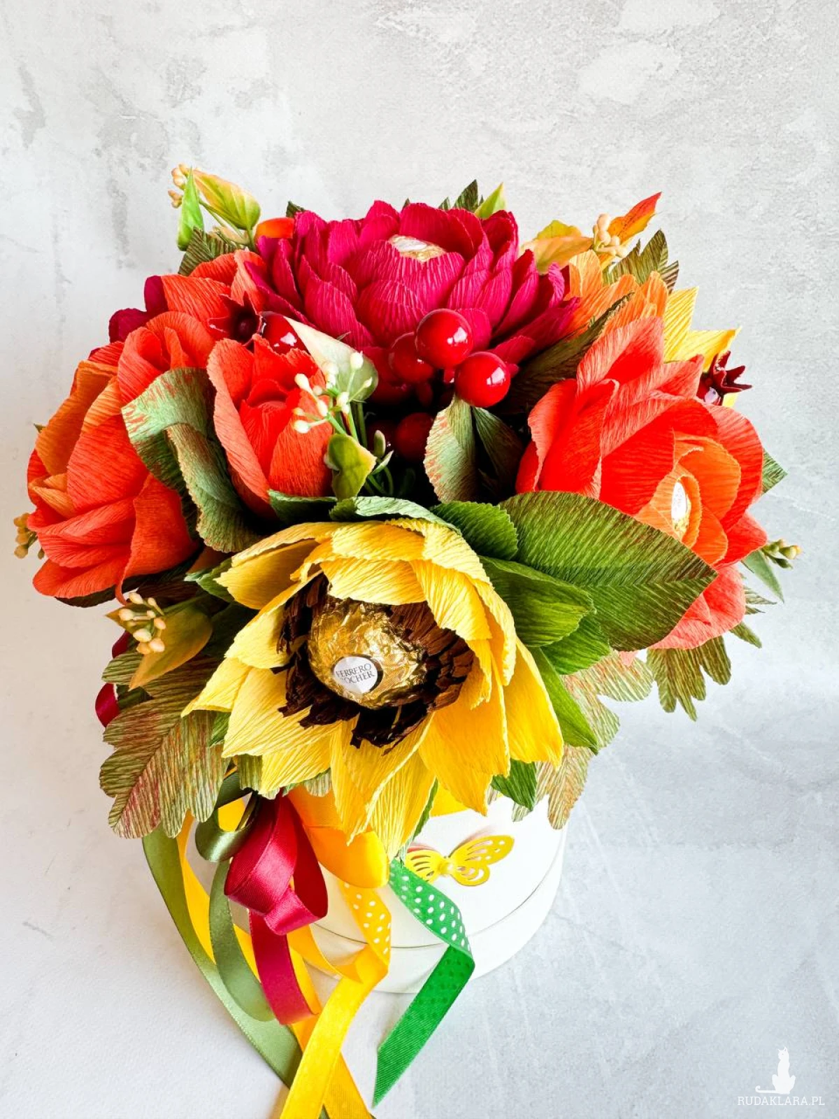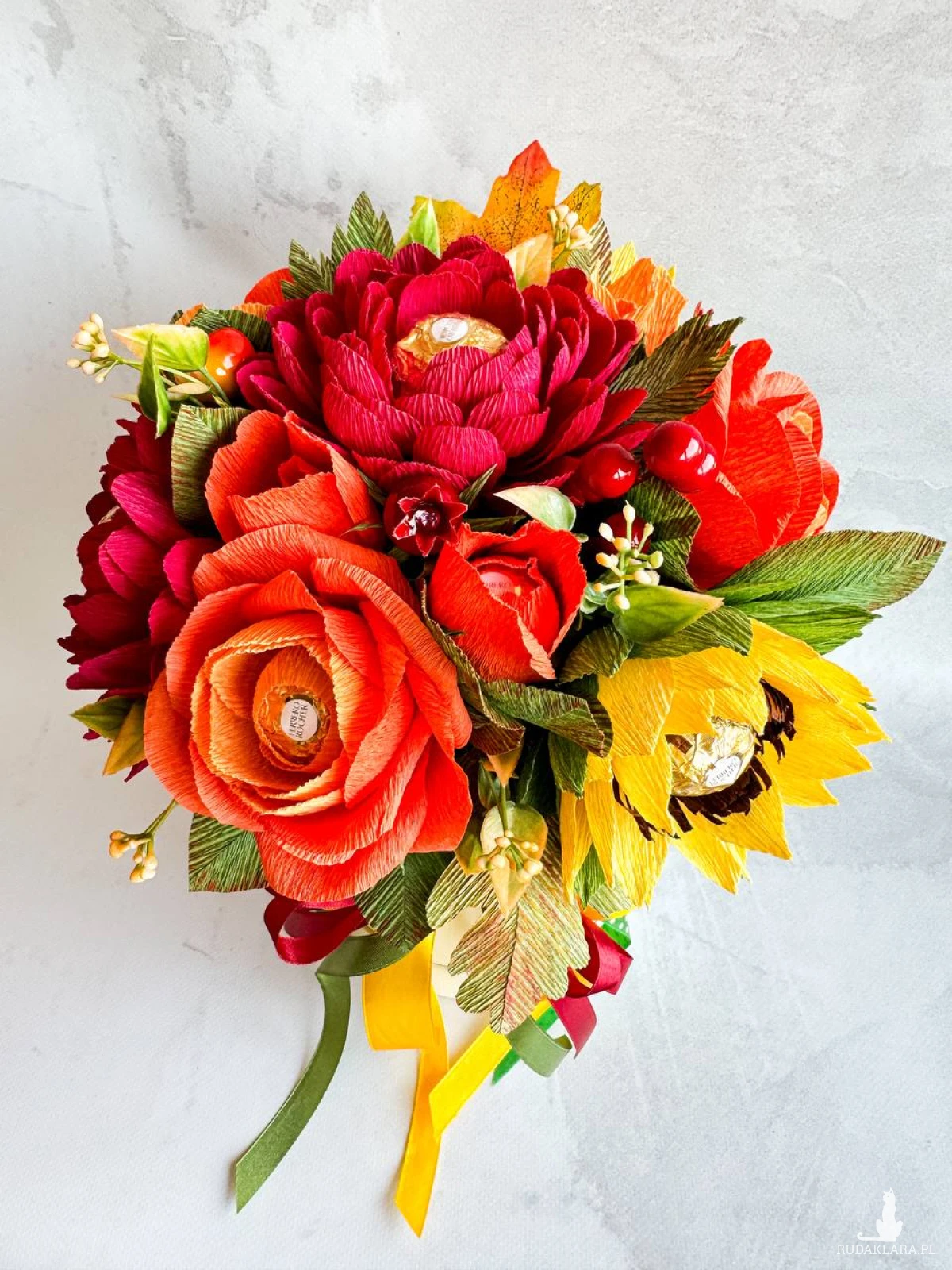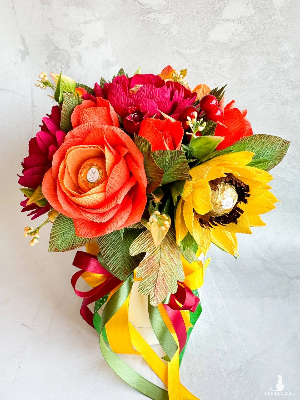 Bukiet wykonany z krepiny włoskiej. W bukiecie są 11 kwiatów z cukierkami w środku. Cukierki można ostrożnie wyciągnąć z kwiatu, a bukiet doskonale ozdobi wnętrze pokoju.