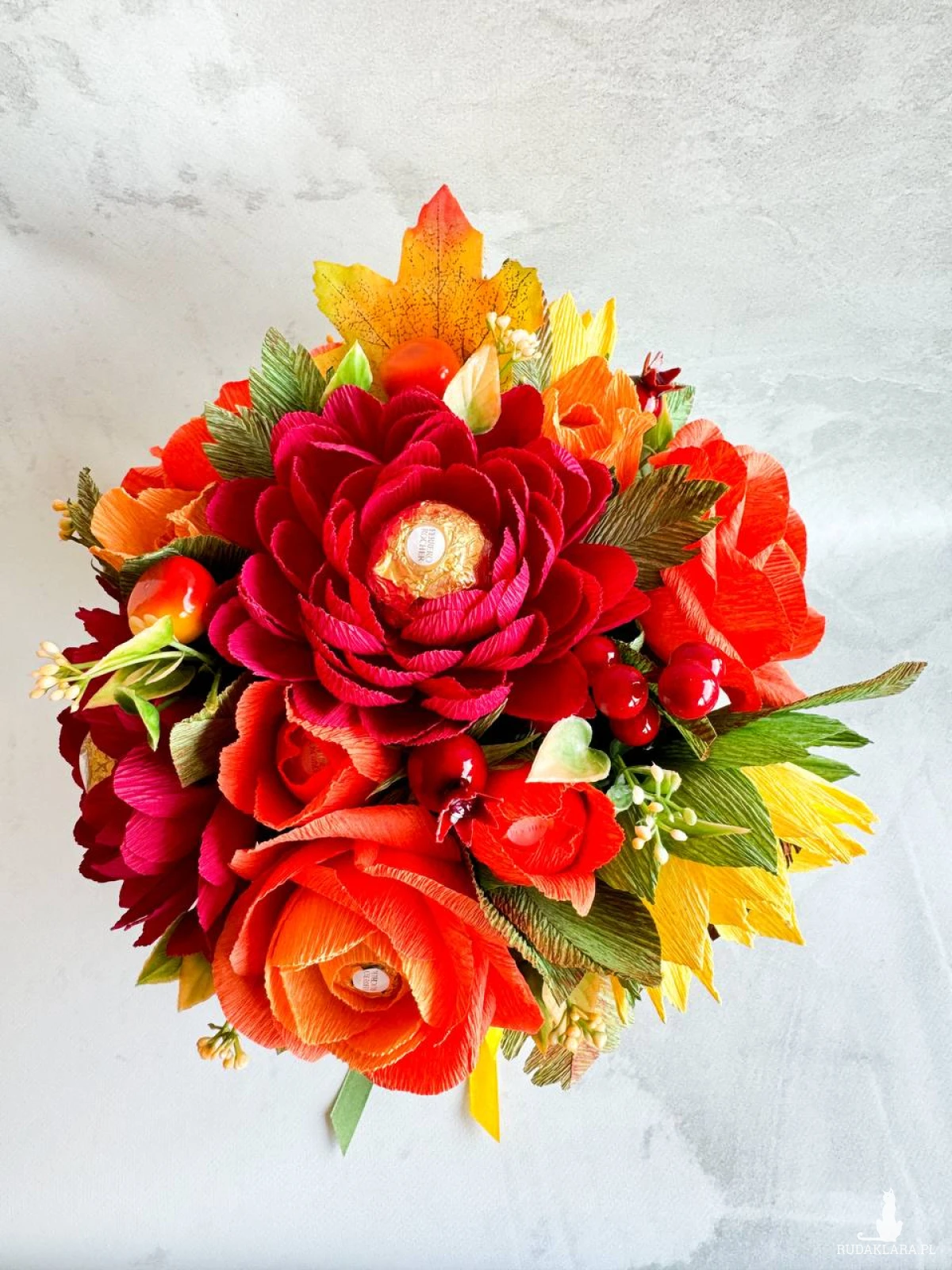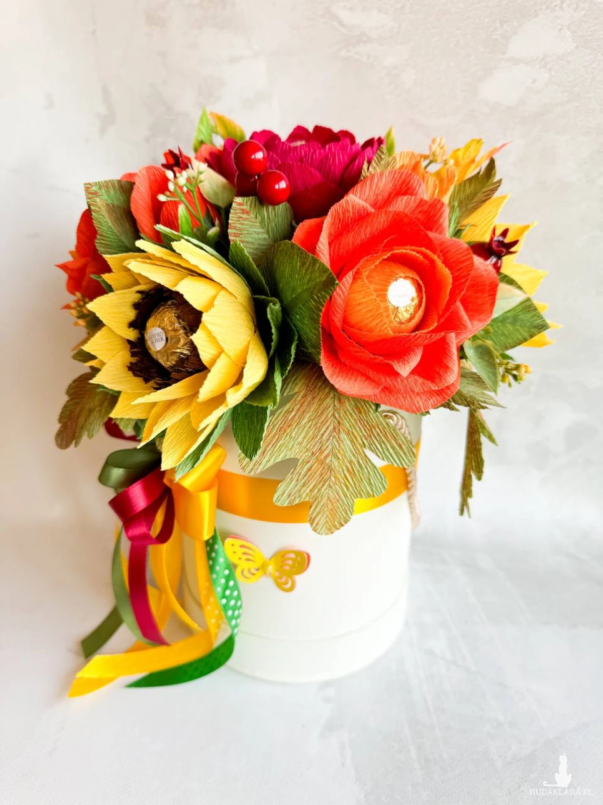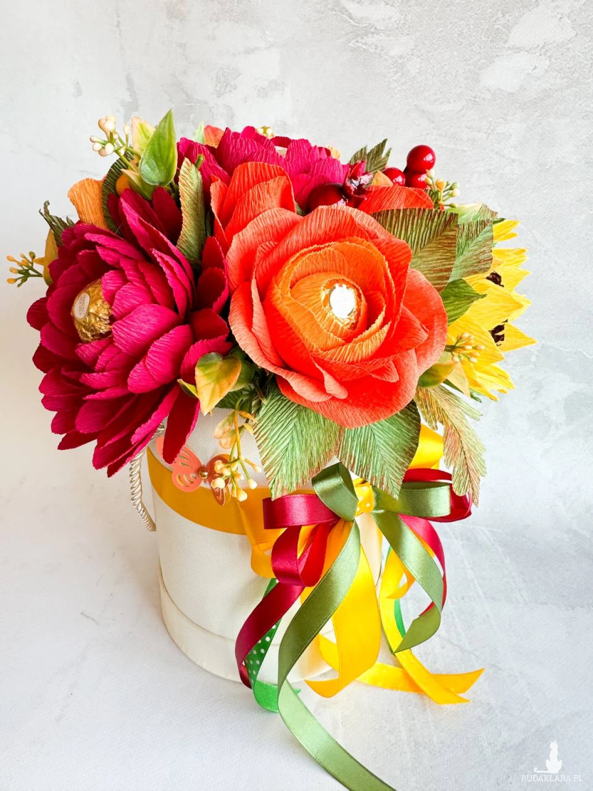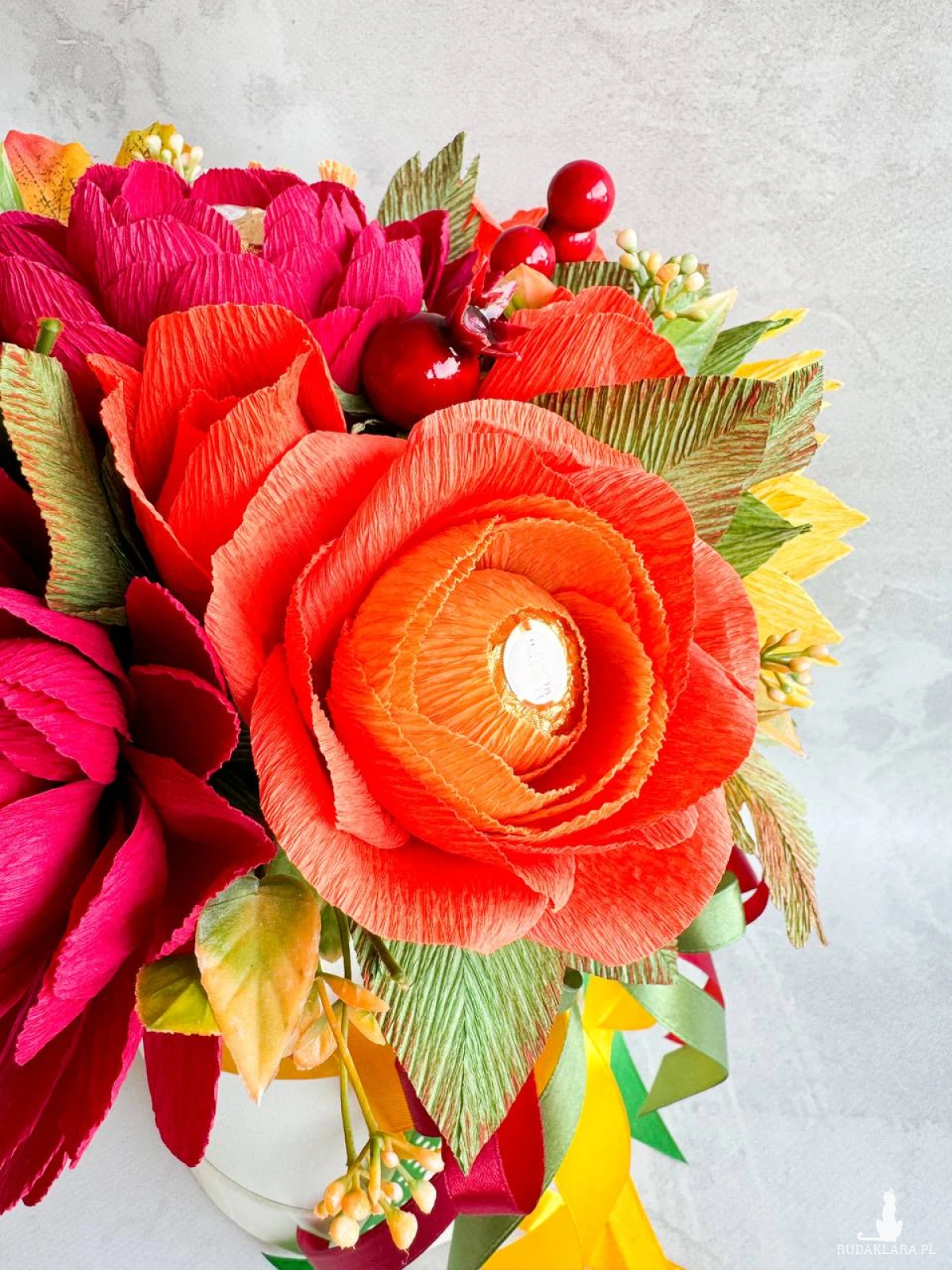 Bukiet wykonany z krepiny włoskiej. W bukiecie są 11 kwiatów z cukierkami w środku. Cukierki można ostrożnie wyciągnąć z kwiatu, a bukiet doskonale ozdobi wnętrze pokoju.