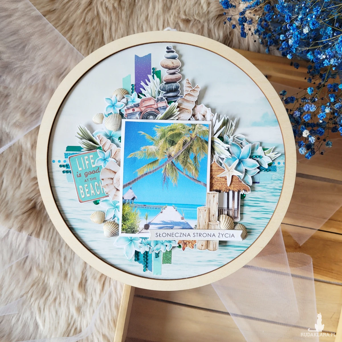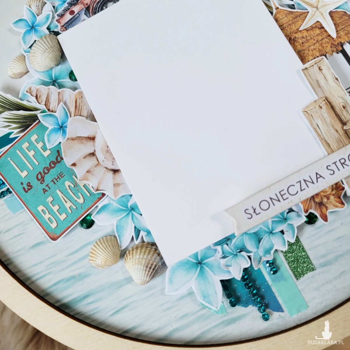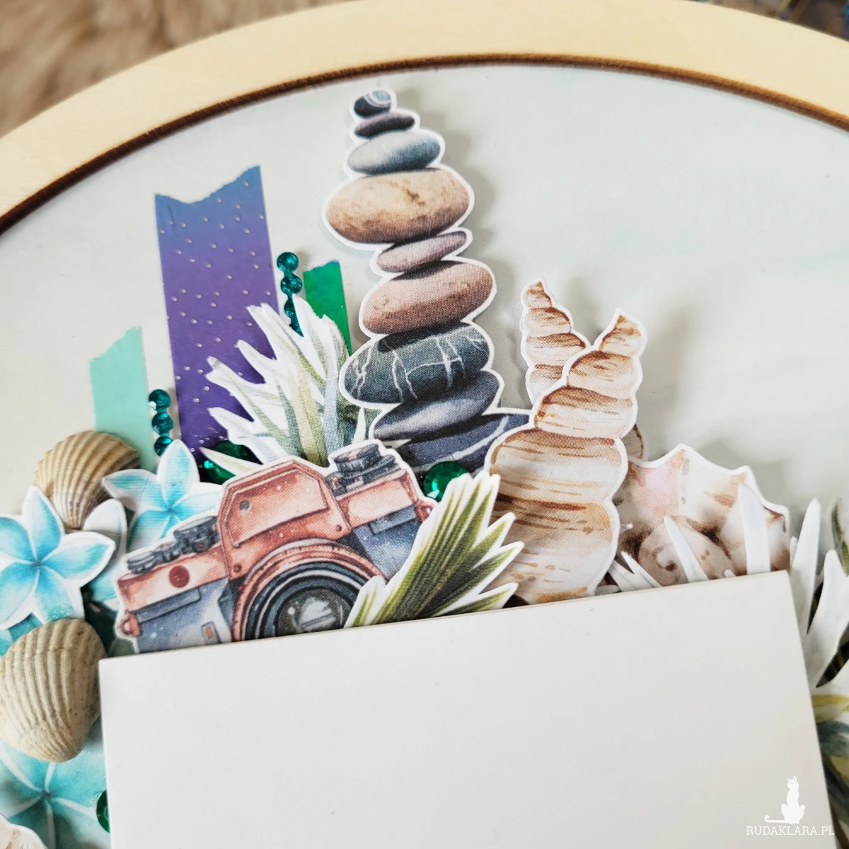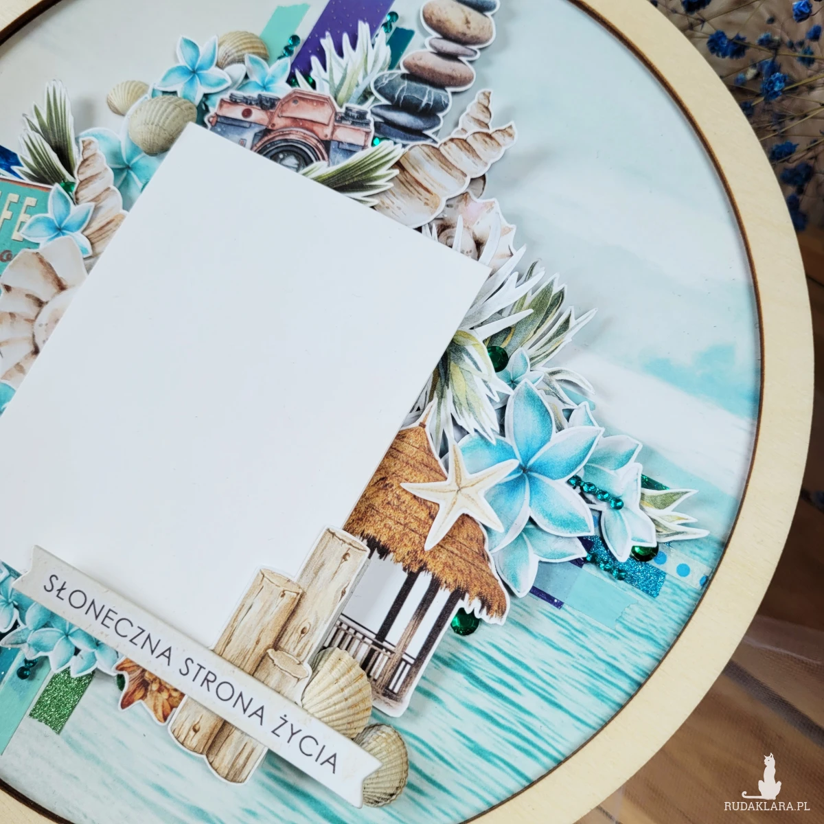Stwórz wspomnienia z wakacji nad morzem dzięki tej wyjątkowej ramce na zdjęcie. Ramka ma kształt koła o średnicy 23,5 cm, jest w kolorze błękitnym i turkusowym, idealnie nawiązującym do morskiej scenerii. Została ozdobiona muszelkami, błyszczącymi elementami oraz akcentami, które przywołują wspomnienie letnich dni spędzonych na plaży.