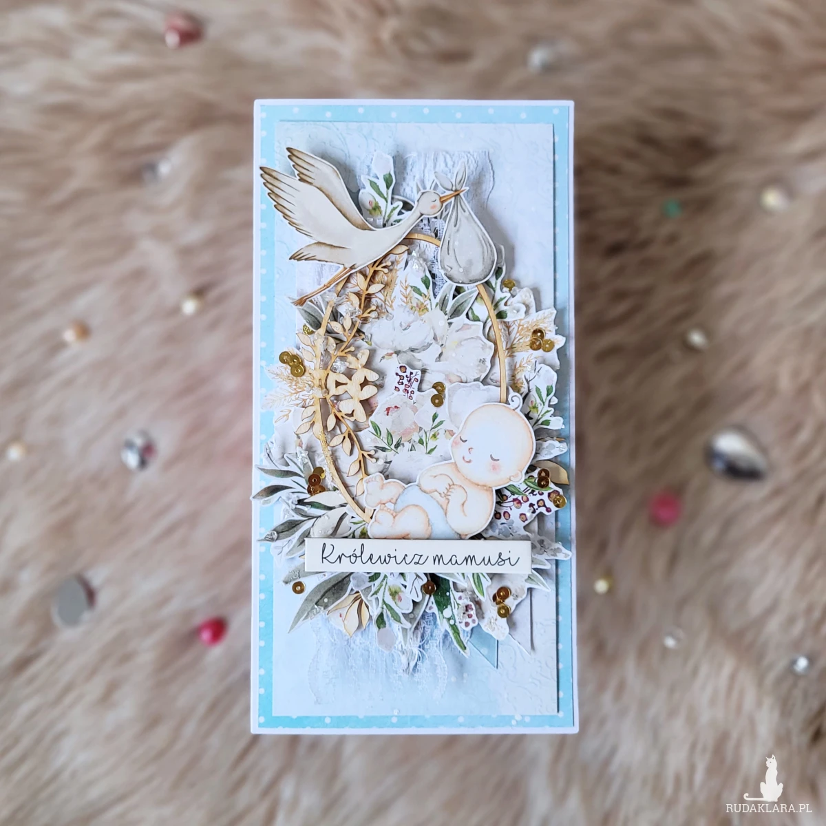 Kolor błękitny w połączeniu z tekturkową ramką, delikatnymi roślinnymi elementami, koronką i błyszczącymi dodatkami tworzy subtelną, a jednocześnie elegancką całość. Kryształki dodają jej wyjątkowego blasku, nadając kartce unikalnego charakteru.