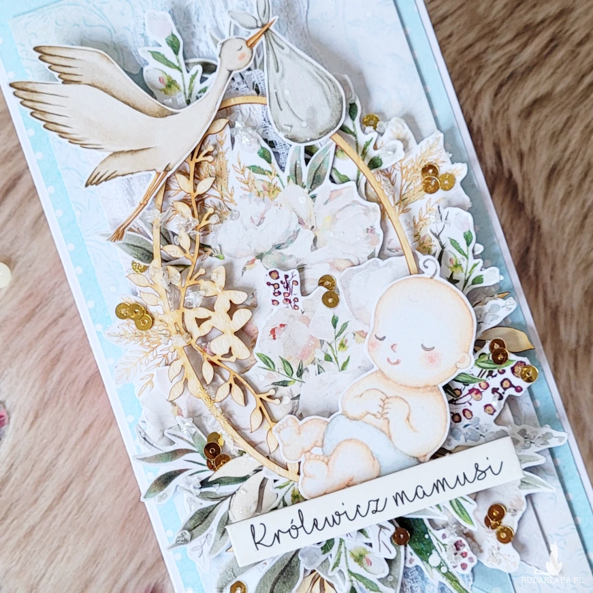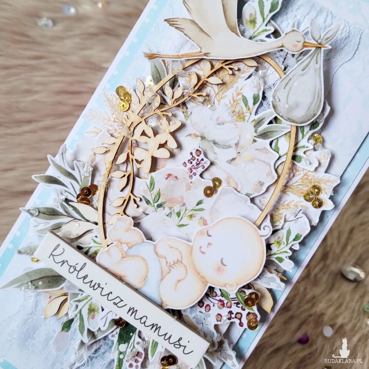 Wyjątkowa kartka na narodziny chłopca, stworzona z myślą o tym wyjątkowym momencie. Kartka w formacie DL jest ozdobiona napisem „Królewicz mamusi” oraz uroczą ilustracją dzidziusia i bociana, które symbolizują ten radosny dzień.