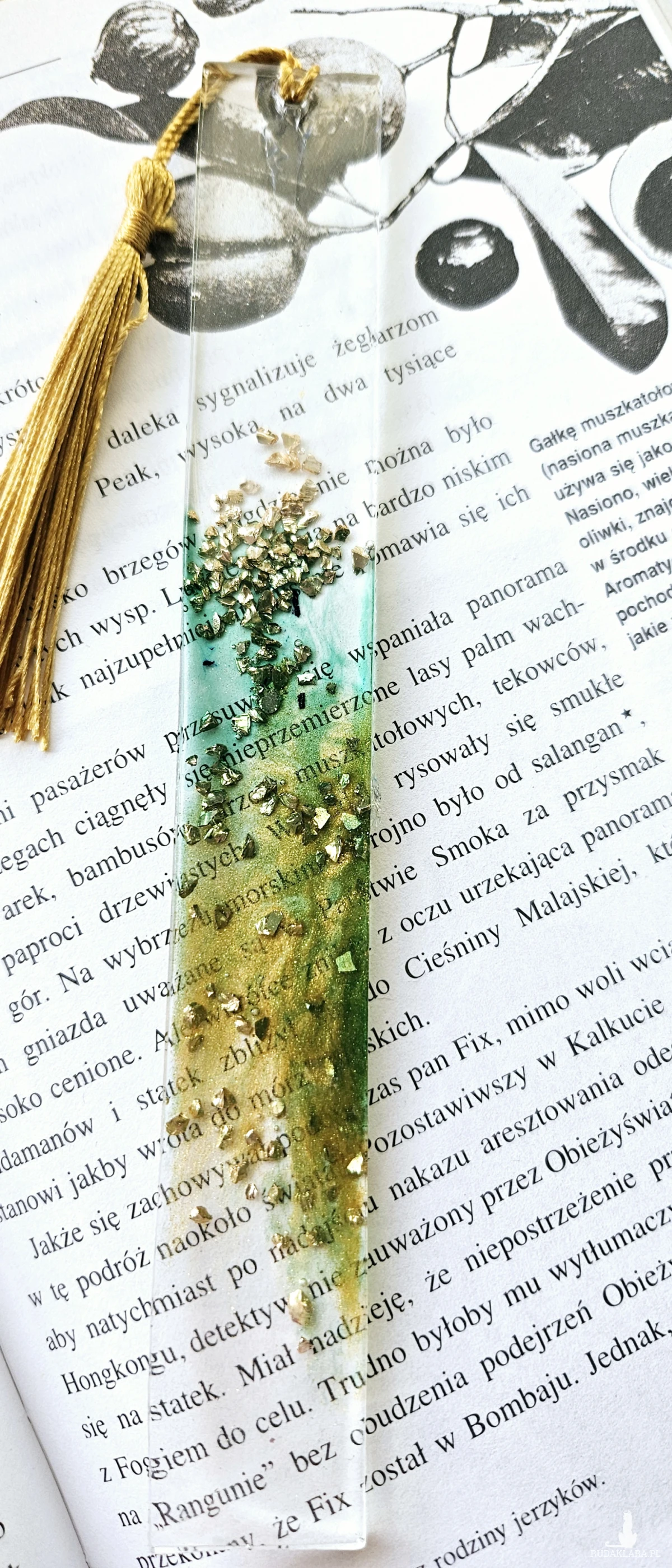 Zakładka z żywicy epoksydowej złoto turkusowy z kryształkami D04