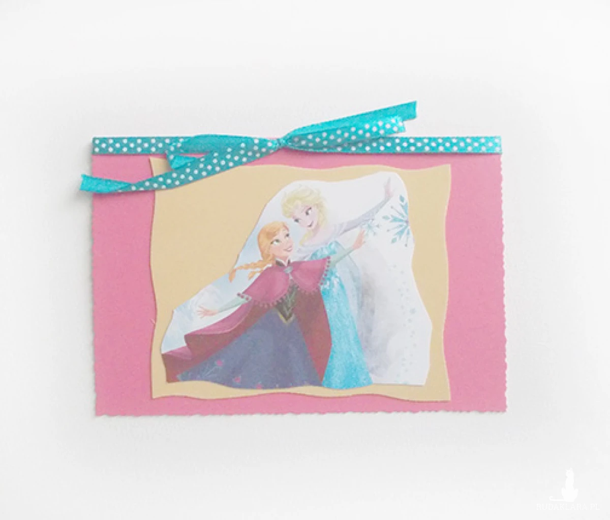 Otwierana kartka okolicznościowa z Elsą i Anną z filmu dla dzieci pt. "Kraina Lodu" (Frozen), gruby kartonik. Karnet jest bez życzeń. Dołączona biała koperta.
