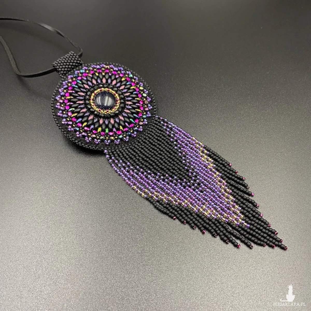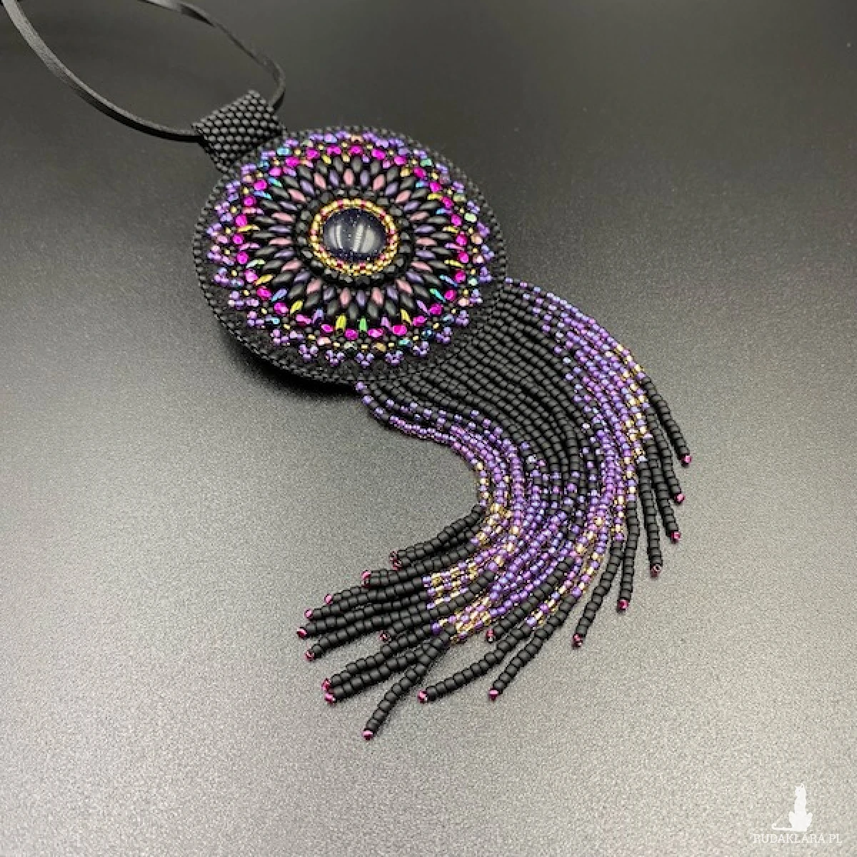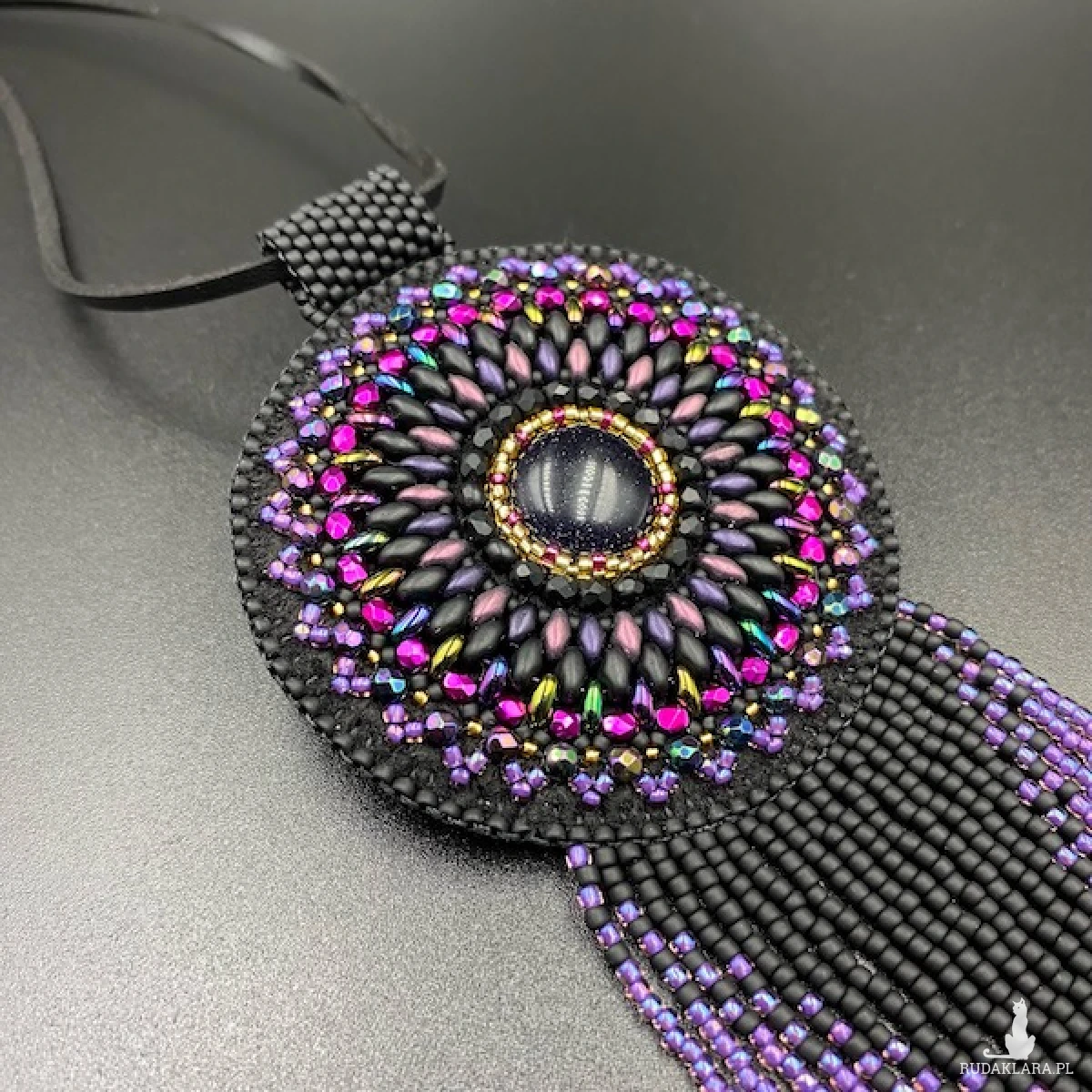 Kolory medalionu: czarny, odcienie fioletu, mocny róż, kryształowy złoty. Jego centrum to okrągły kaboszon szklany 16 mm (noc kairu), który opleciony został koralikami Toho, Fire Polish, SuperDuo i wykończony ozdobnymi frędzelkami z efektem cieniowania. Zawieszony został na rzemieniu syntetycznym w kolorze czarnym. Tył podszyty czarną eko skórką. Elementy metalowe ze stali chirurgicznej w kolorze srebrnym.