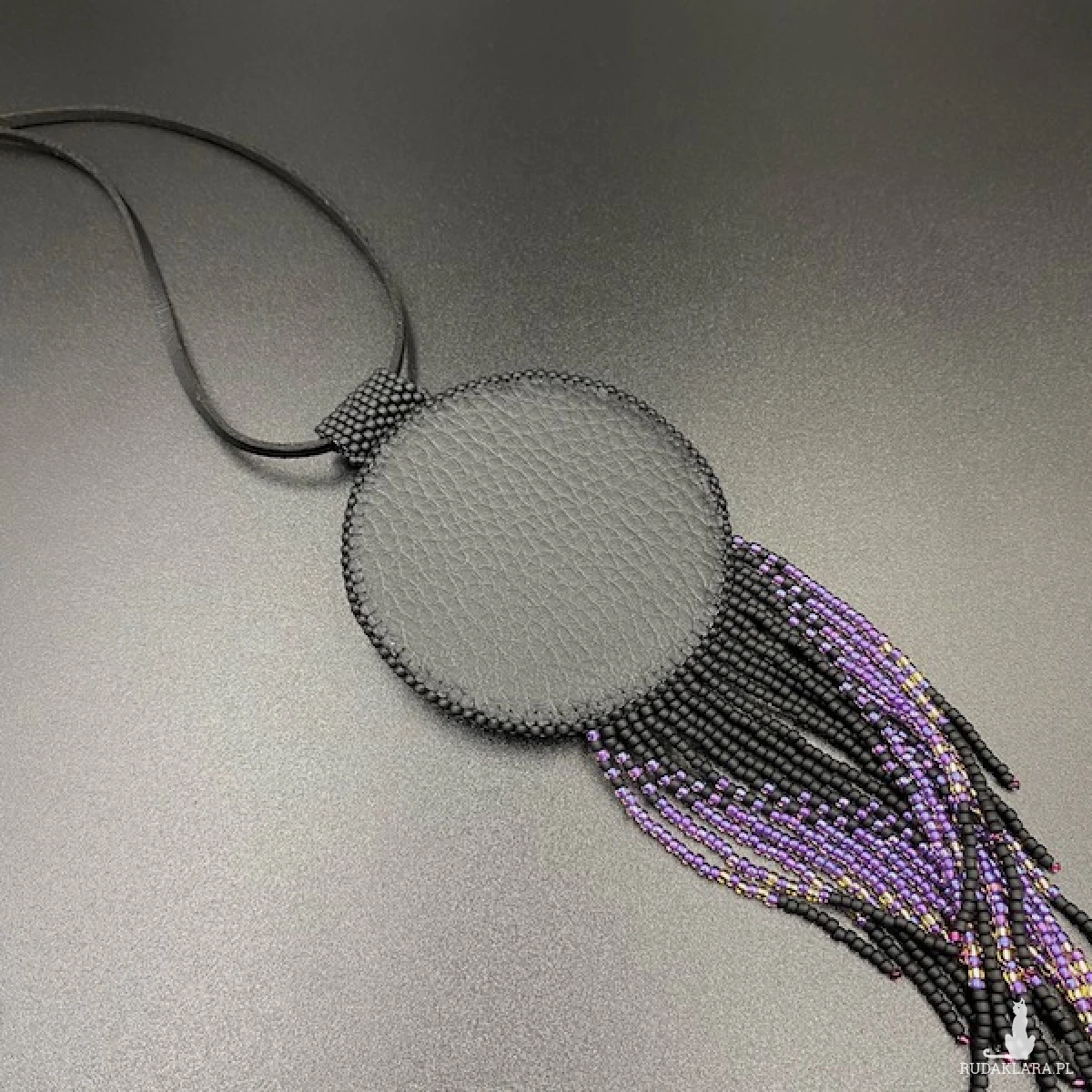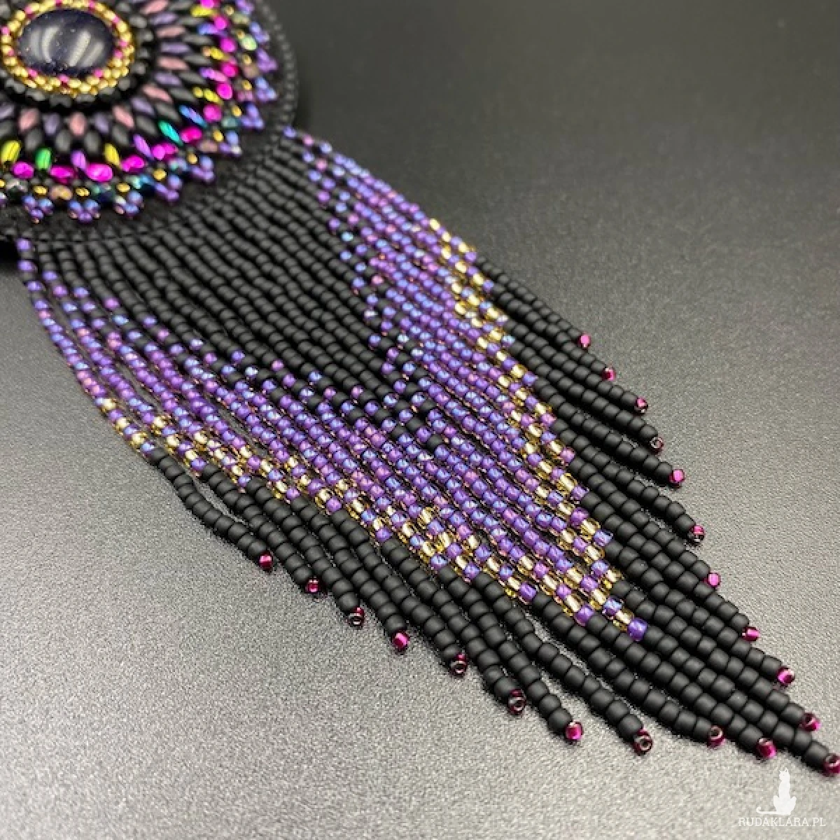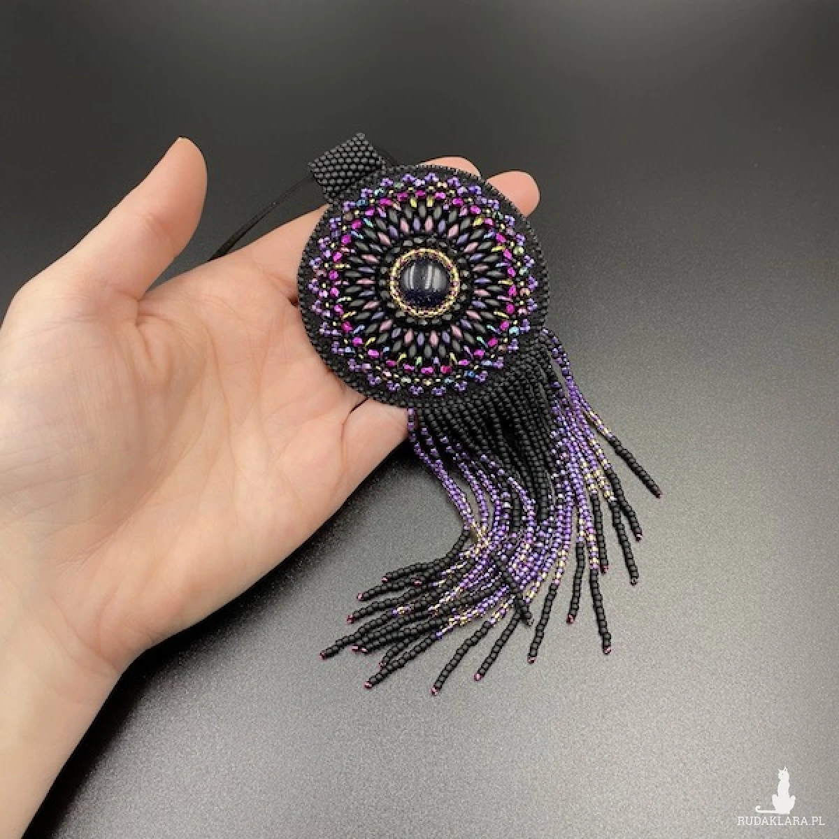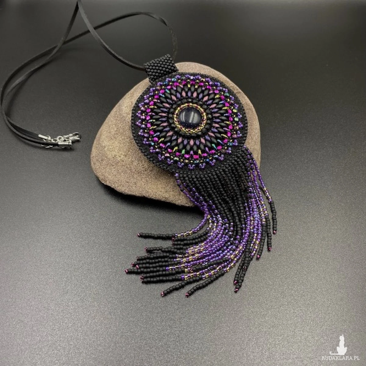 Kolory medalionu: czarny, odcienie fioletu, mocny róż, kryształowy złoty. Jego centrum to okrągły kaboszon szklany 16 mm (noc kairu), który opleciony został koralikami Toho, Fire Polish, SuperDuo i wykończony ozdobnymi frędzelkami z efektem cieniowania. Zawieszony został na rzemieniu syntetycznym w kolorze czarnym. Tył podszyty czarną eko skórką. Elementy metalowe ze stali chirurgicznej w kolorze srebrnym.