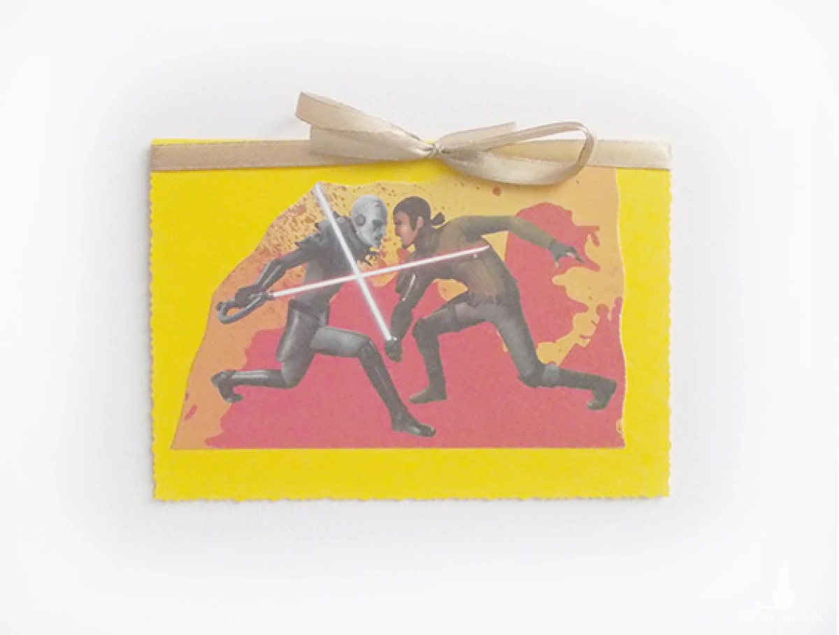 Otwierana kartka okolicznościowa, bez życzeń, gruby kartonik. Dołączona biała koperta.