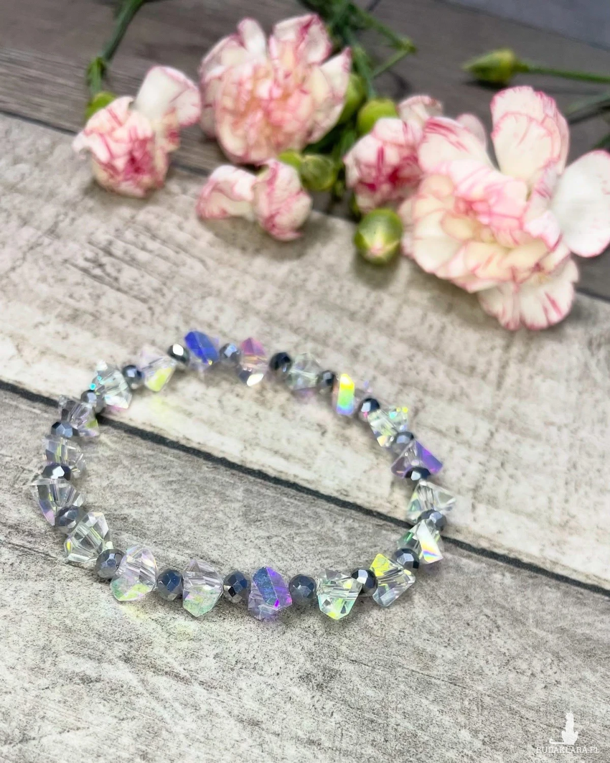 Bransoletka wykonana ze szklanych koralików. Przezroczyste trójkątne koraliki przeplatane mniejszymi faszerowanymi srebrnymi. Bardzo pięknie się błyszczy.