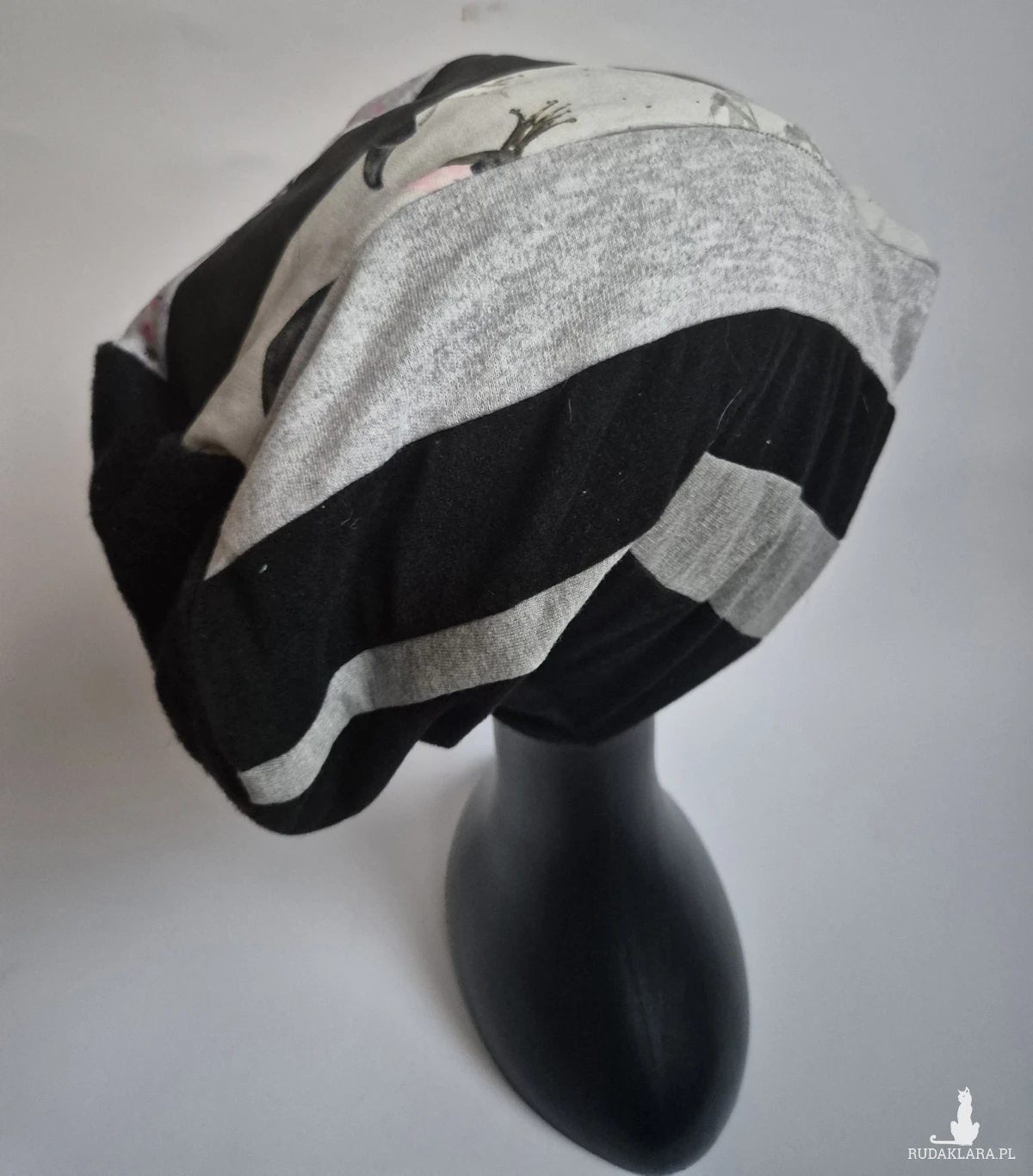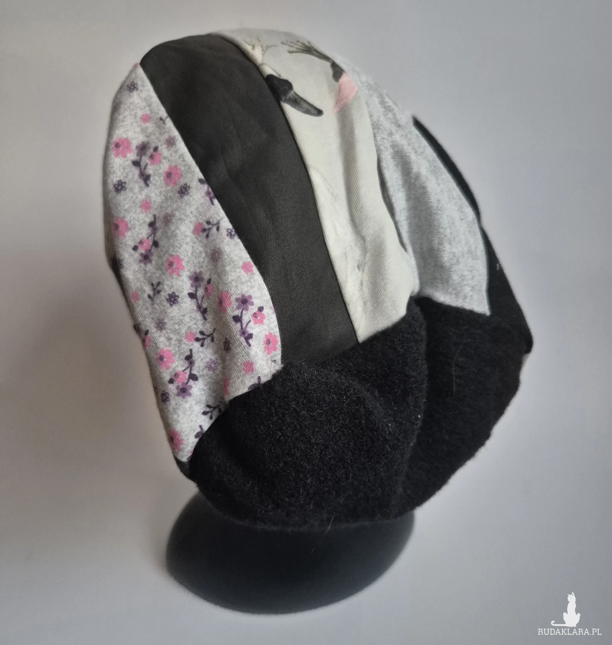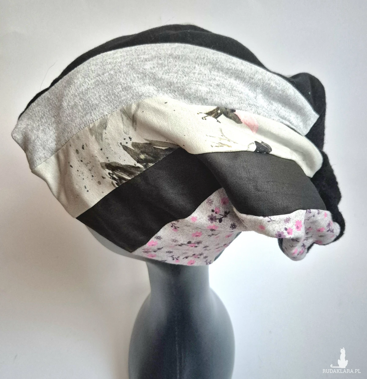 czapka turbanowa etno boho patchwork- na podszewce, rozmiar uniwersalny, lekko rozciągliwa, końcówkę czapki wkłada sie do środka wtedy tworzy się kształt , handmade, pojedyncza sztuka box f1