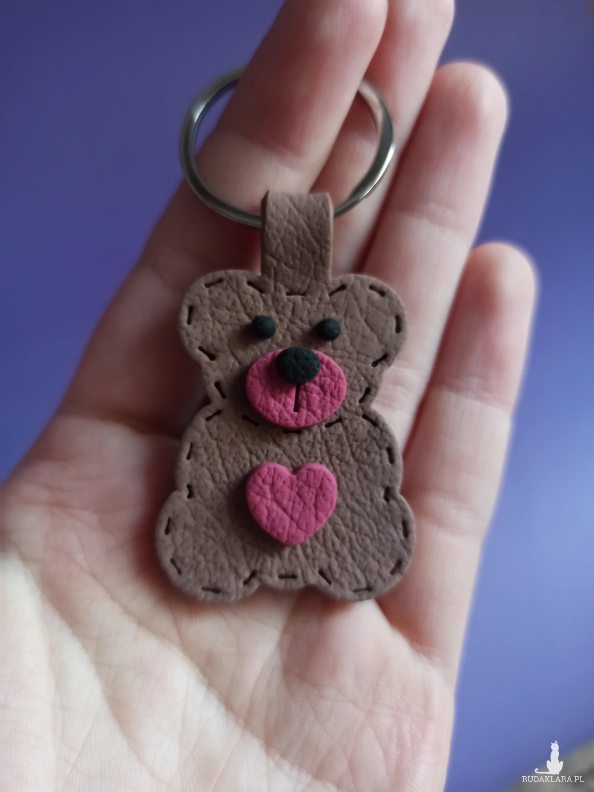 Breloczek miś trzymający serduszko z gliny polimerowej. Efekt szytej skóry.