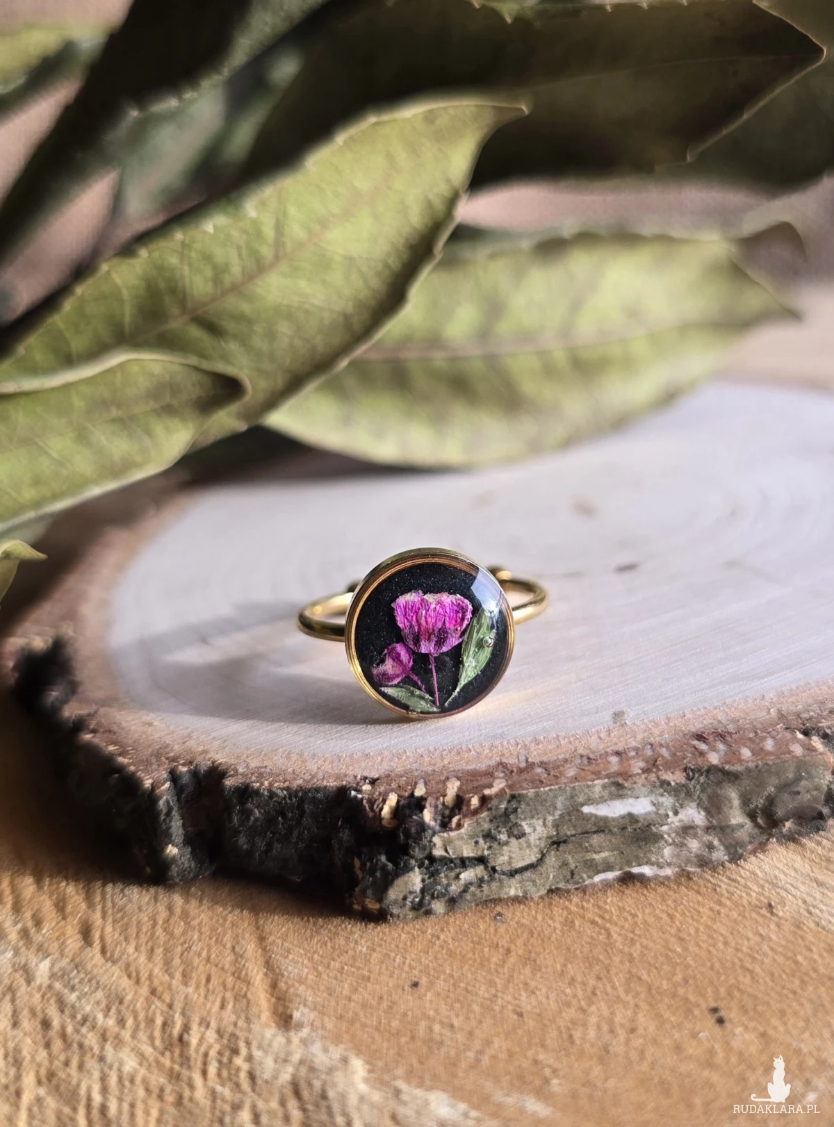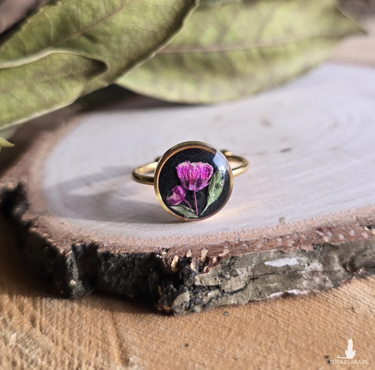Oferuję Państwu unikalną biżuterię. Pierścionek jest wykonany z suszonych kwiatów i żywicy epoksydowej. Biżuteria jest wspaniałym i oryginalnym prezentem na lata.