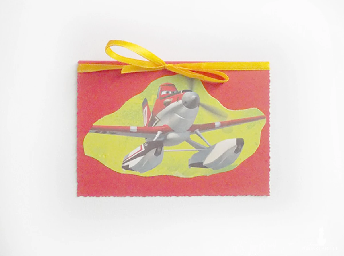Otwierana kartka okolicznościowa z bajkowym samolocikiem, gruby kartonik. Karnet jest bez życzeń. Dołączona biała koperta.