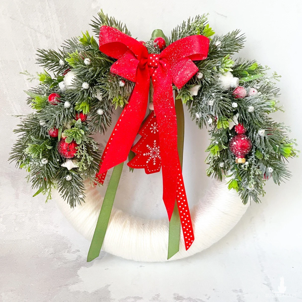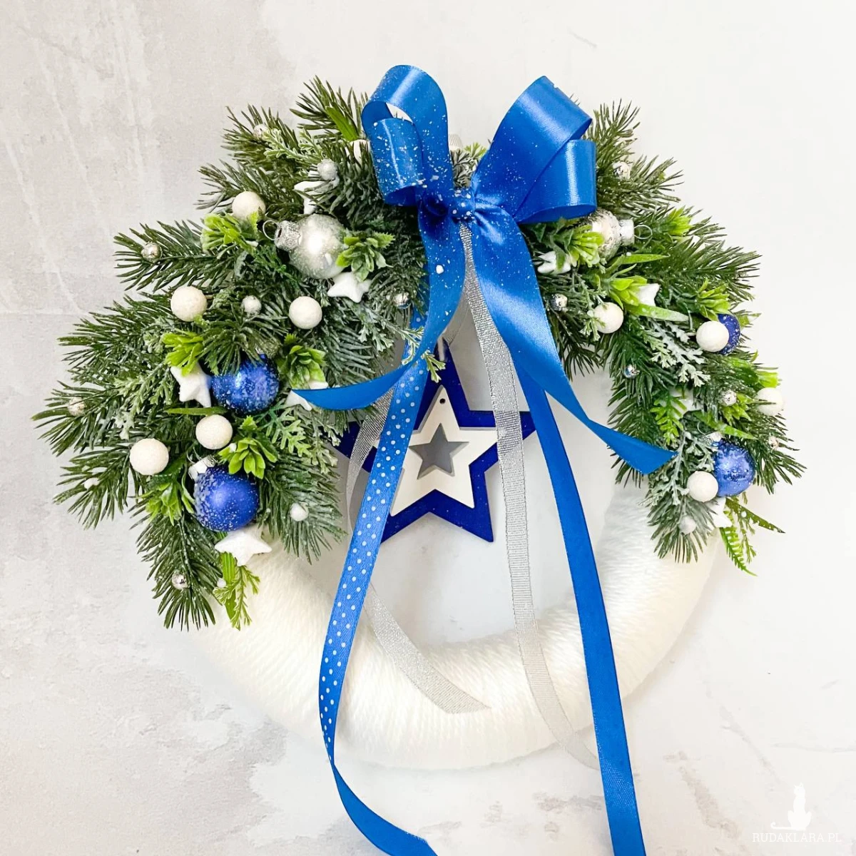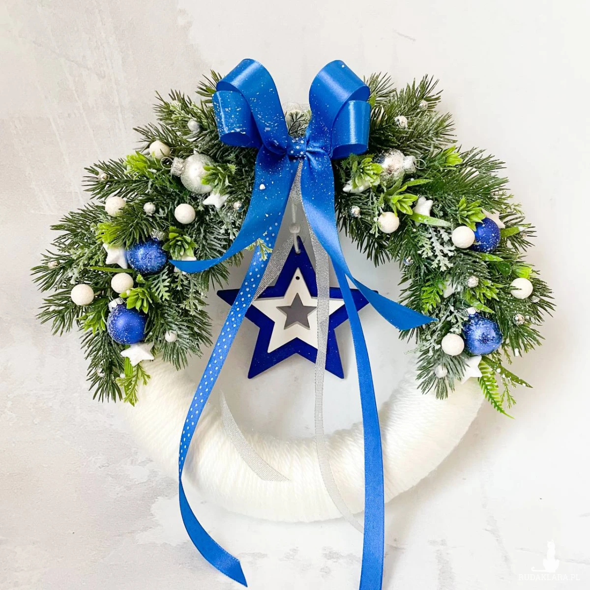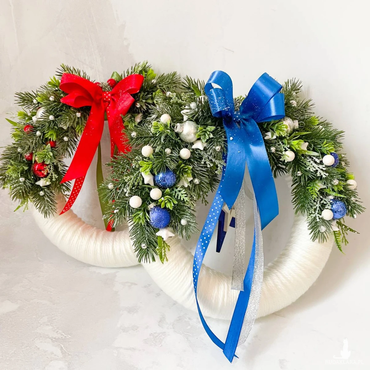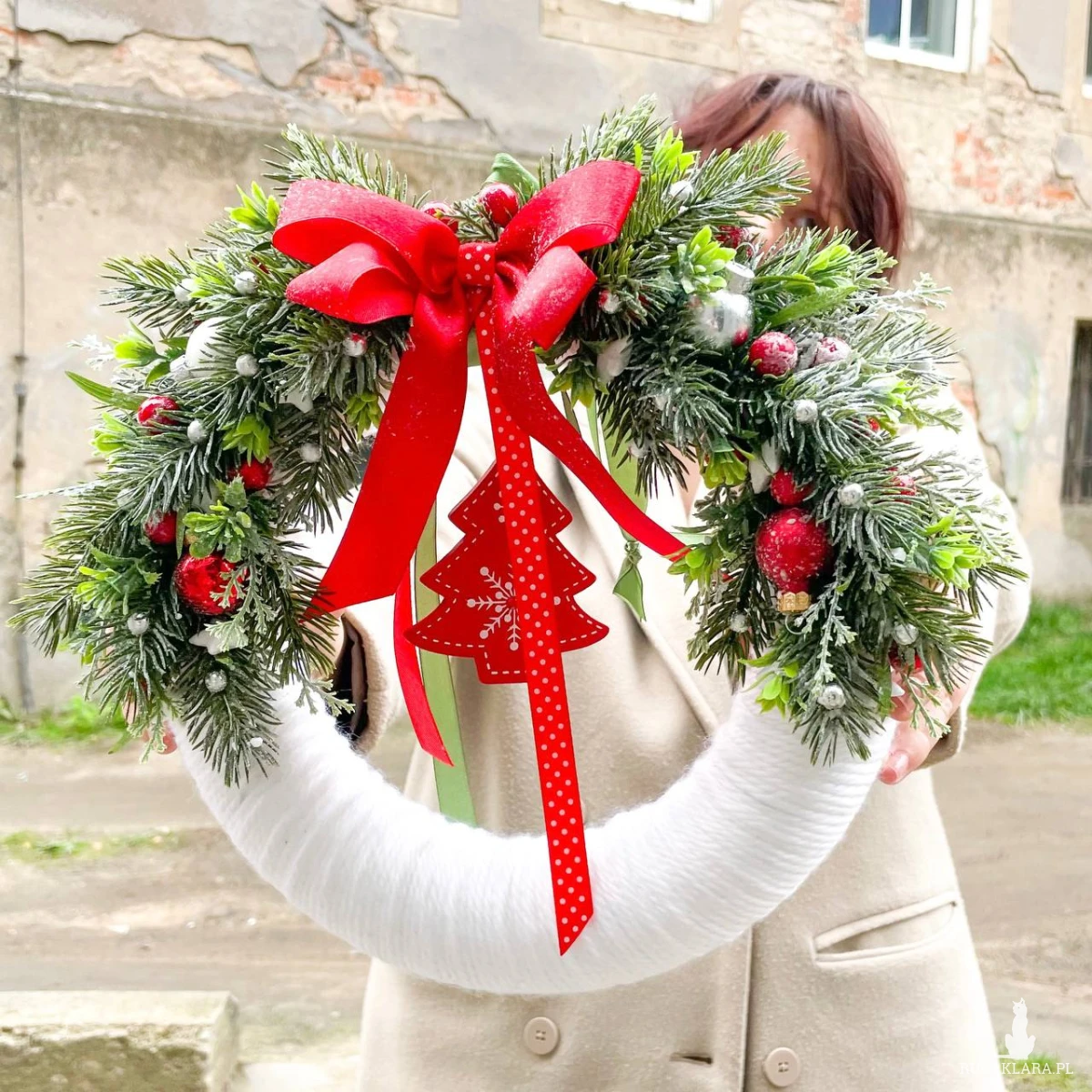 Tworzymy komfort i świąteczny nastrój. Wianek na drzwiach lub na ścianie ozdobi dom w święta Bożego Narodzenia i po prostu w zimowe dni. Średnica około 30 cm Na zamówienie w dowolnym kolorze. Niektóre elementy oraz zawieszka mogą różnić się od pokazanych na zdjęciu.