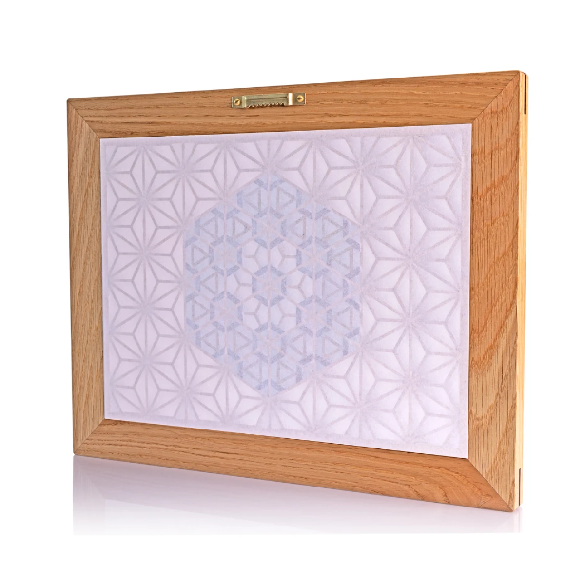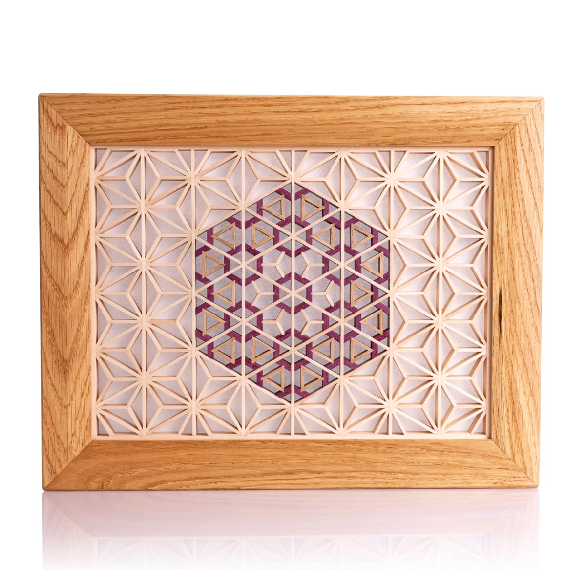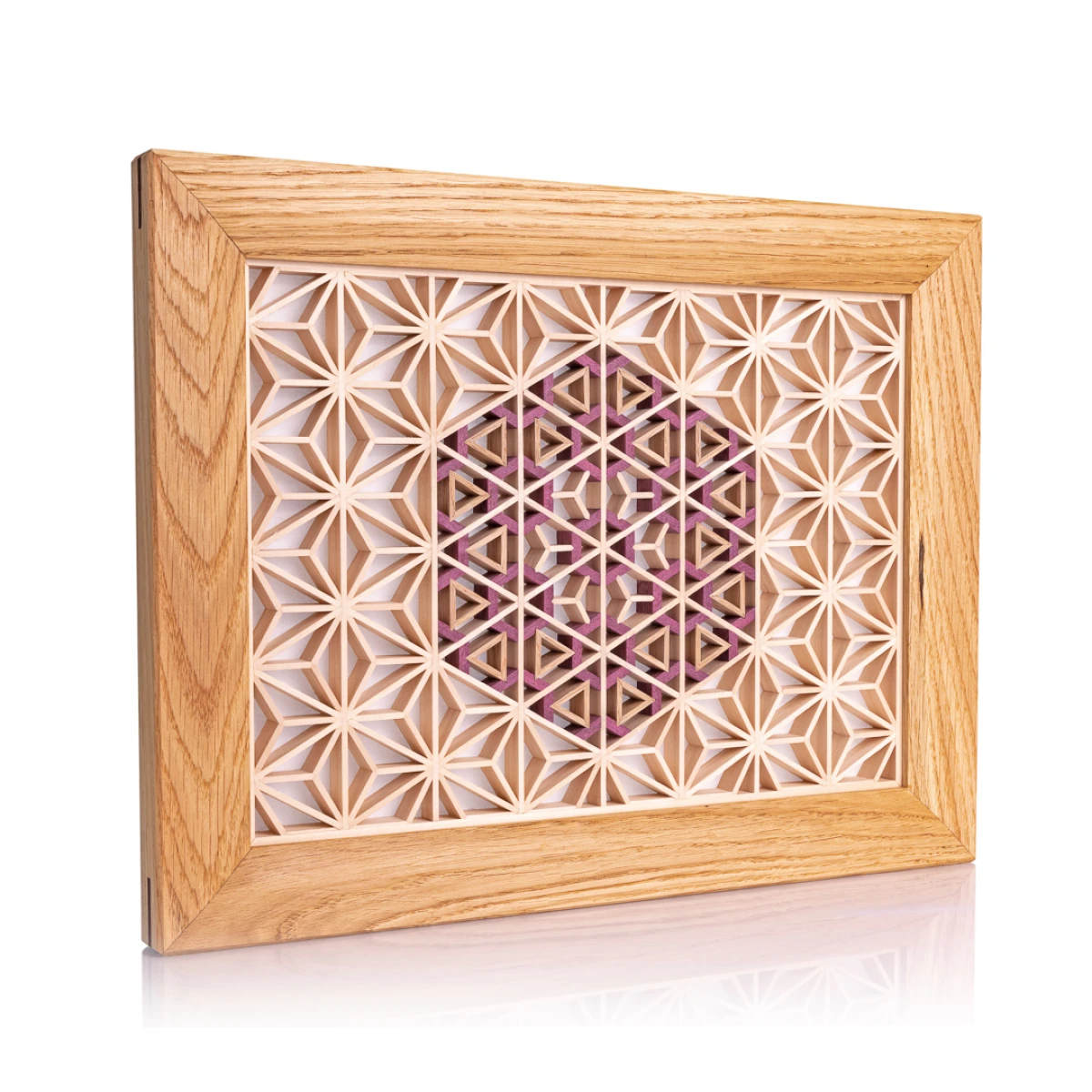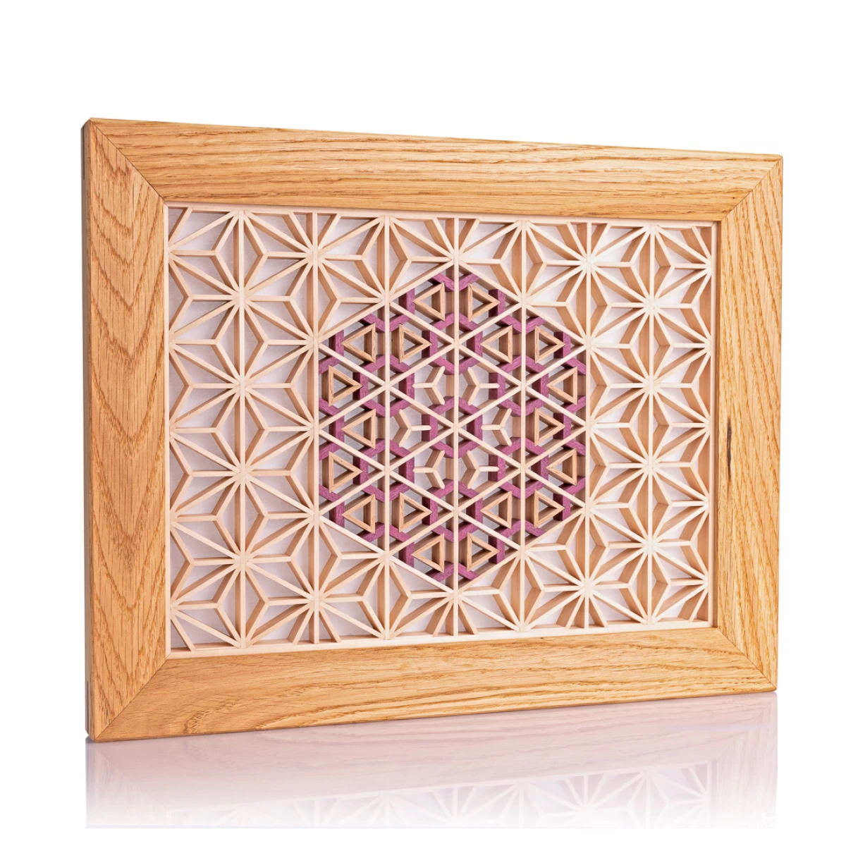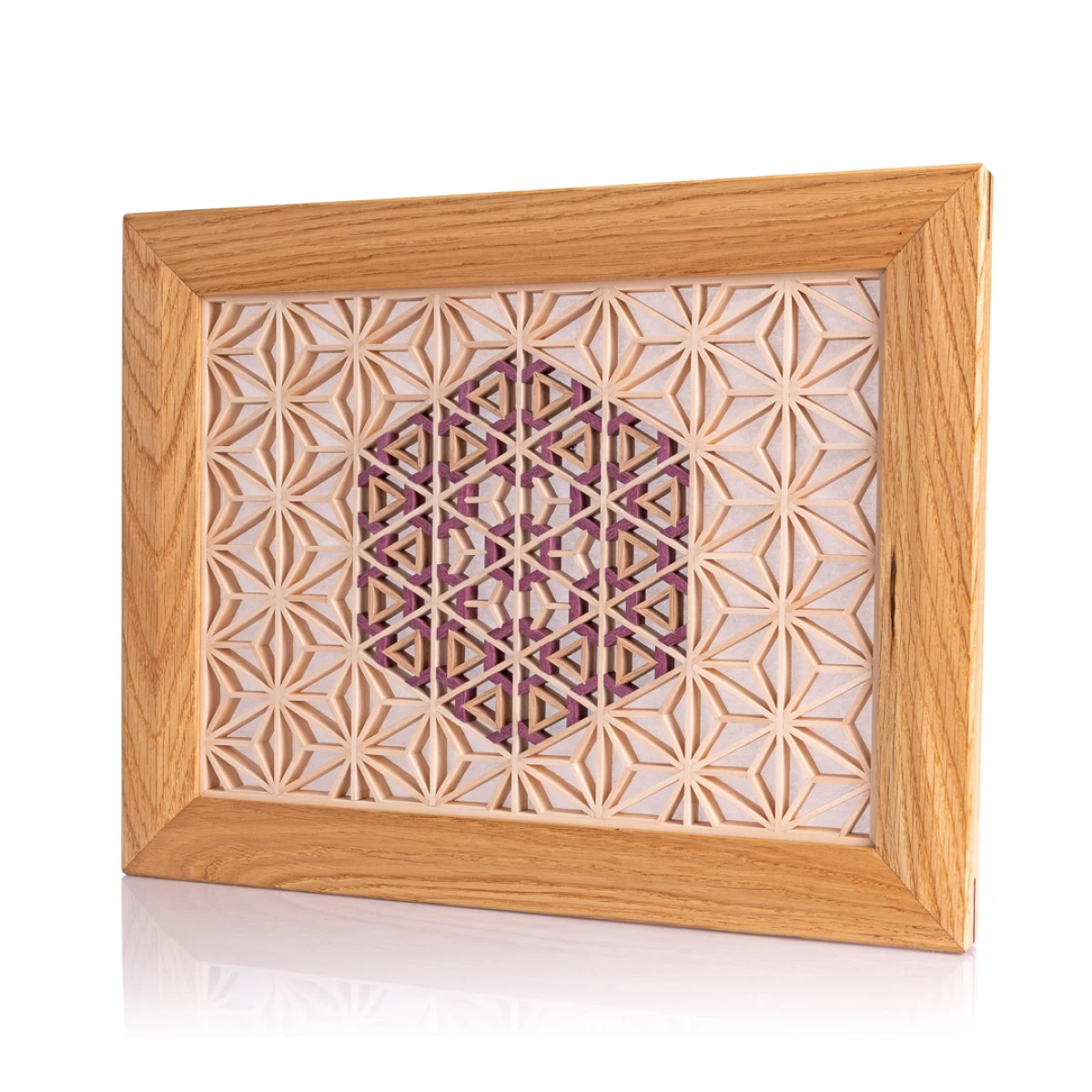 Obraz drewniany z wzorami Kumiko osadzony jest w ręcznie robionej ramie z naturalnego drewna dębowego, wykończonej olejem duńskim oraz naturalnym woskiem pszczelim. Narożniki ramy zostały wzmocnione wstawkami z drewna amarant w kolorze purpurowym, które stanowią dodatkowy, atrakcyjny element dekoracyjny.