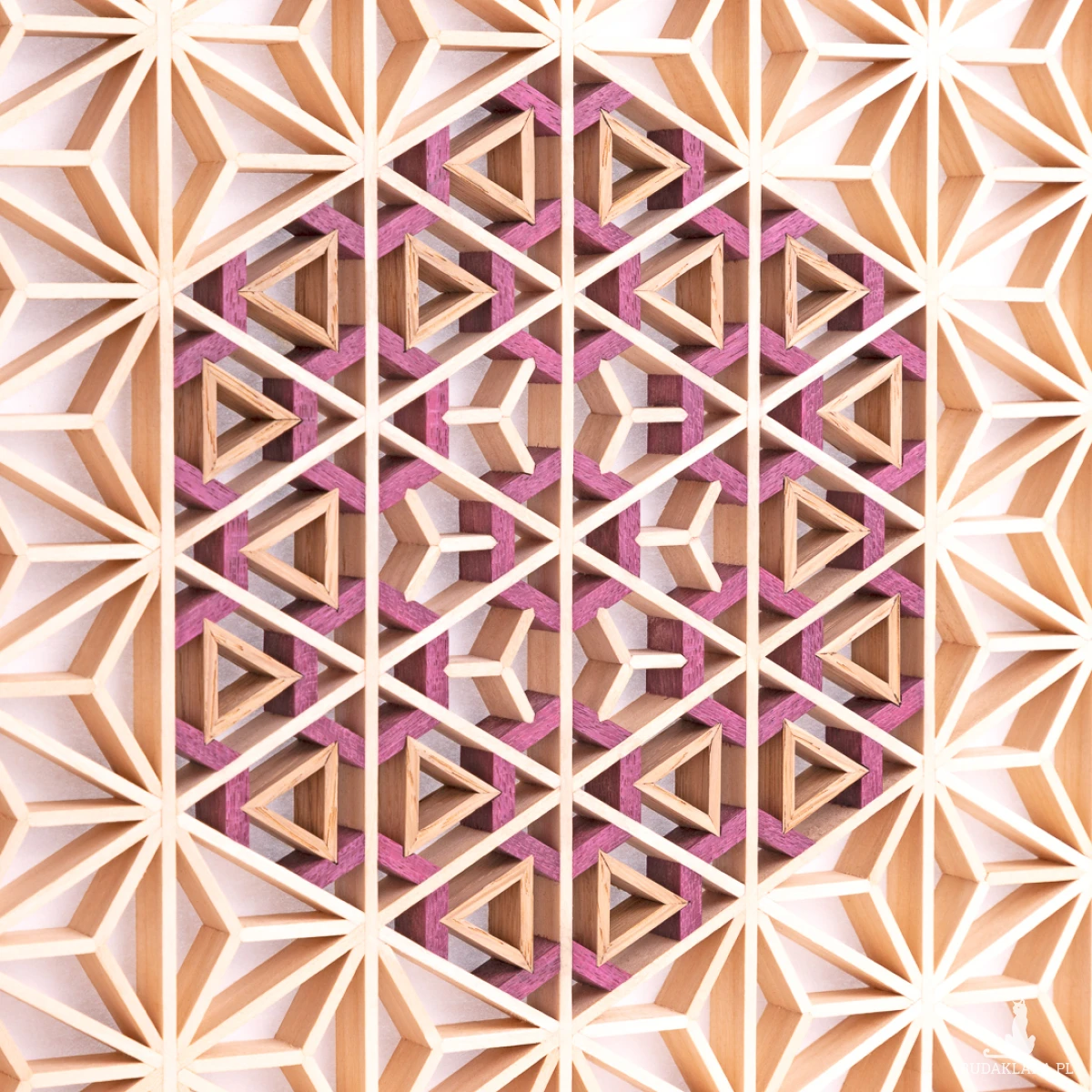 W obrazie drewnianym wykorzystane zostały trzy oryginalne wzory Kumiko: