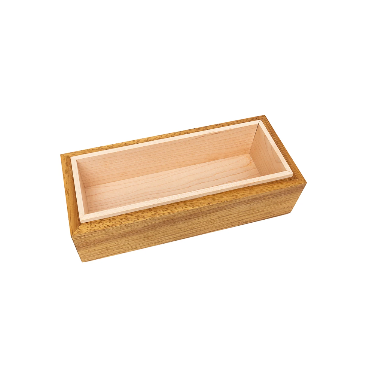 Wnętrze szkatułki na biżuterię zostało wykończone drewnem klonowym z zachowaniem jego naturalnego, subtelnego rysunku słojów. Biały kolor drewna klonowego idealnie komponuje się z żółto-brązowym odcieniem drewna iroko.
