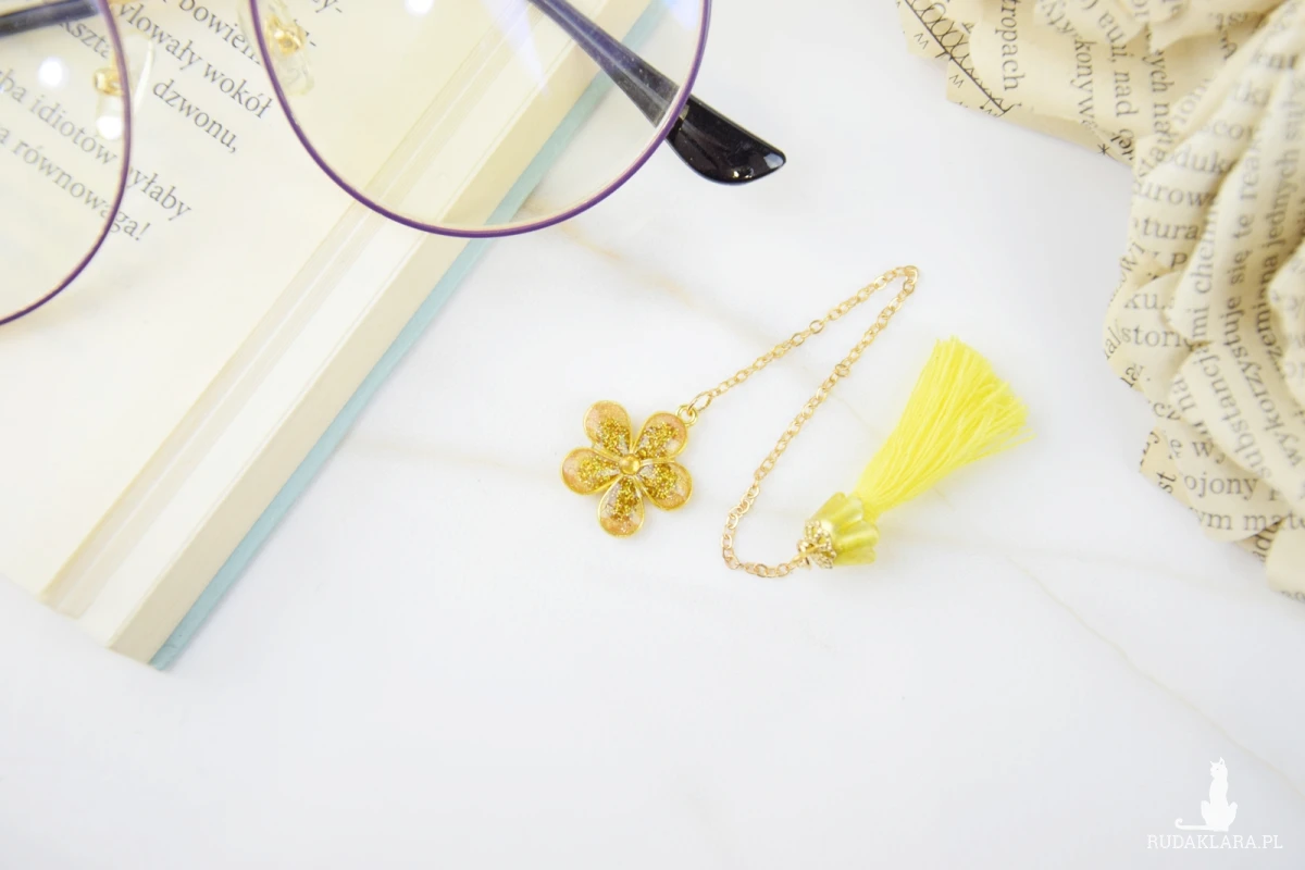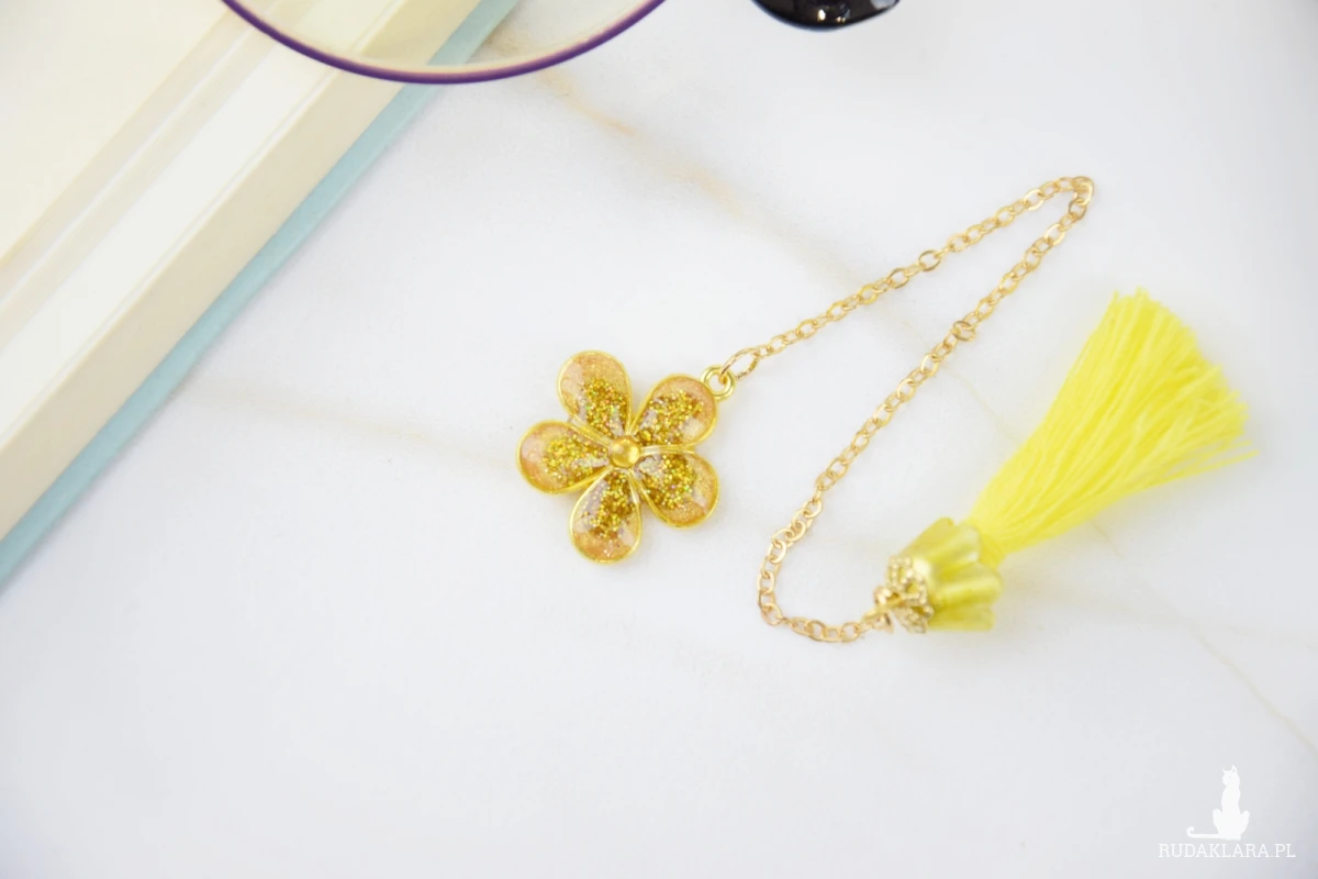 Mam dla Ciebie ręcznie stworzoną zakładkę do książki. Metalowa rama wypełniona żywicą z elementami brokatów, oraz pigmentów najwyższej jakości. Środek kwiatu stanowi cyrkonia. Do drugiej części zakładki prowadzi drobny łańcuszek. Na końcu znajduje się chwost otulony ręcznie barwionym kwiatem, na którego szcycie znajduje się metalowa, ażurowa przekładka.