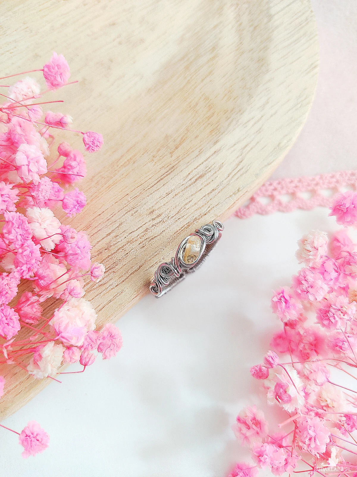 Pierścionek został wykonany ręcznie metodą wire wrapping, co oznacza, że drut stalowy został starannie opleciony wokół kamienia, tworząc unikalny wzór. Stal chirurgiczna, z której powstała ta biżuteria, jest materiałem hipoalergicznym, odpornym na działanie wilgoci i czynników zewnętrznych. Dzięki temu pierścionek może być noszony na co dzień bez obaw o jego trwałość czy reakcje alergiczne.
